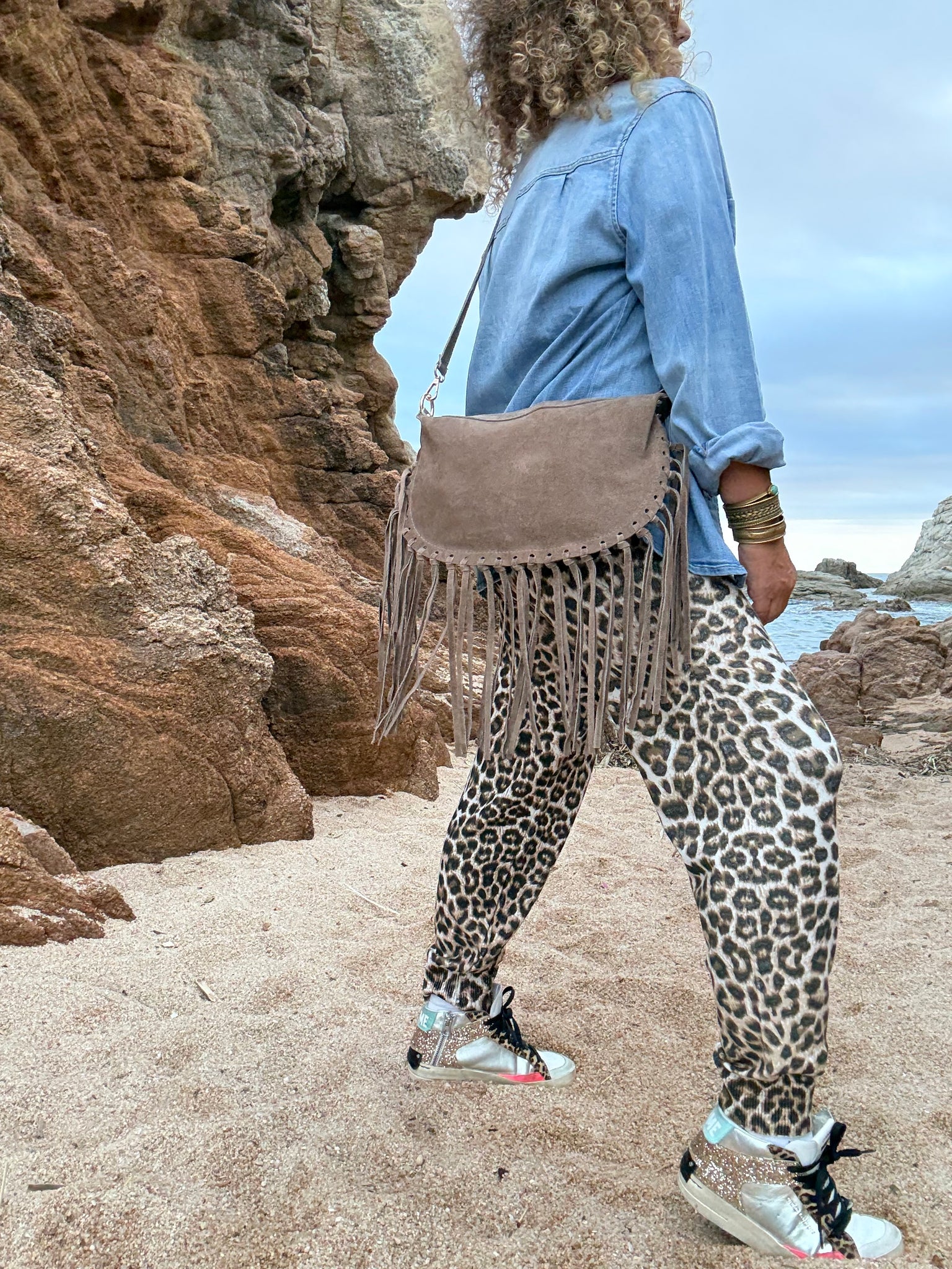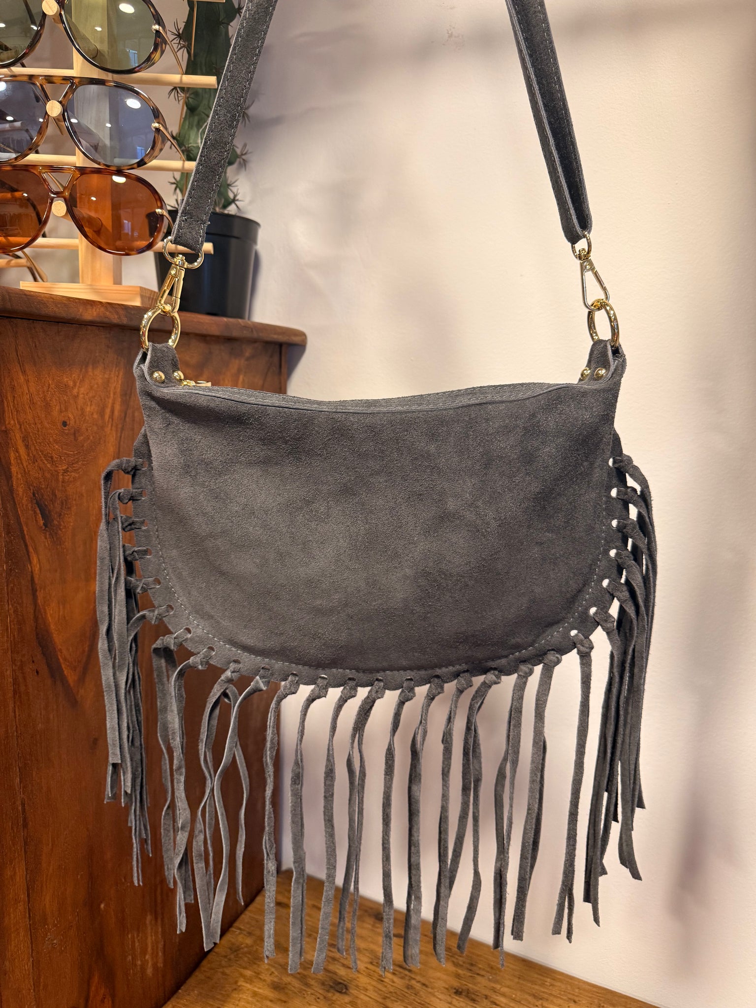 Bolso de ante (piel) con forma de media luna y flecos! Un bolso muy Bohochic y tendencia! Precioso! Dos colores.