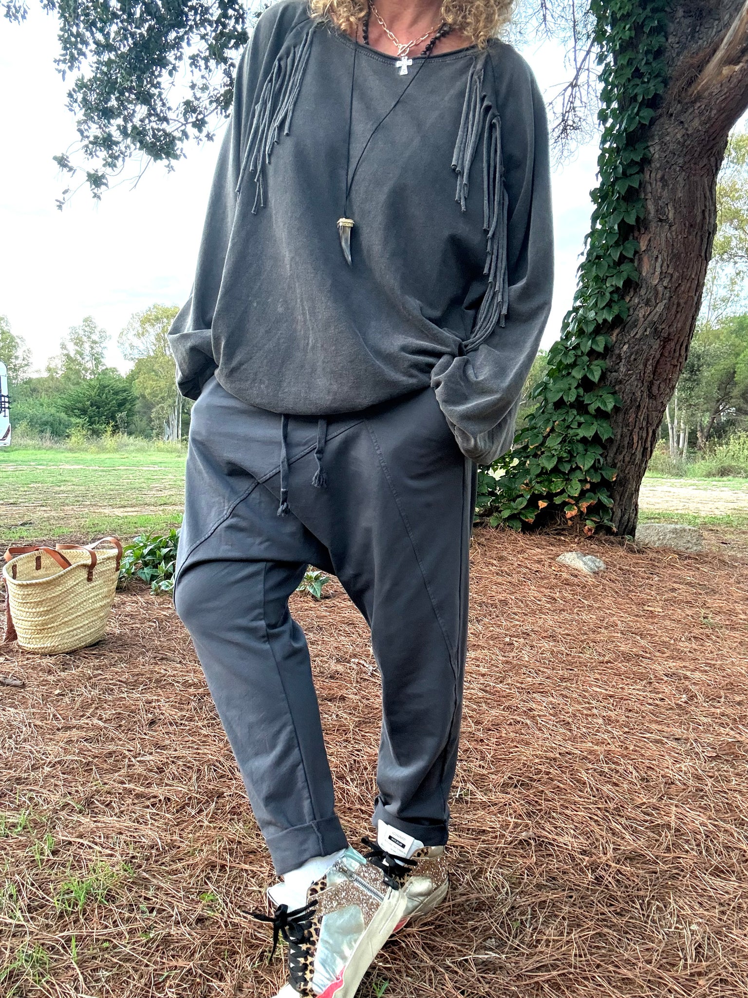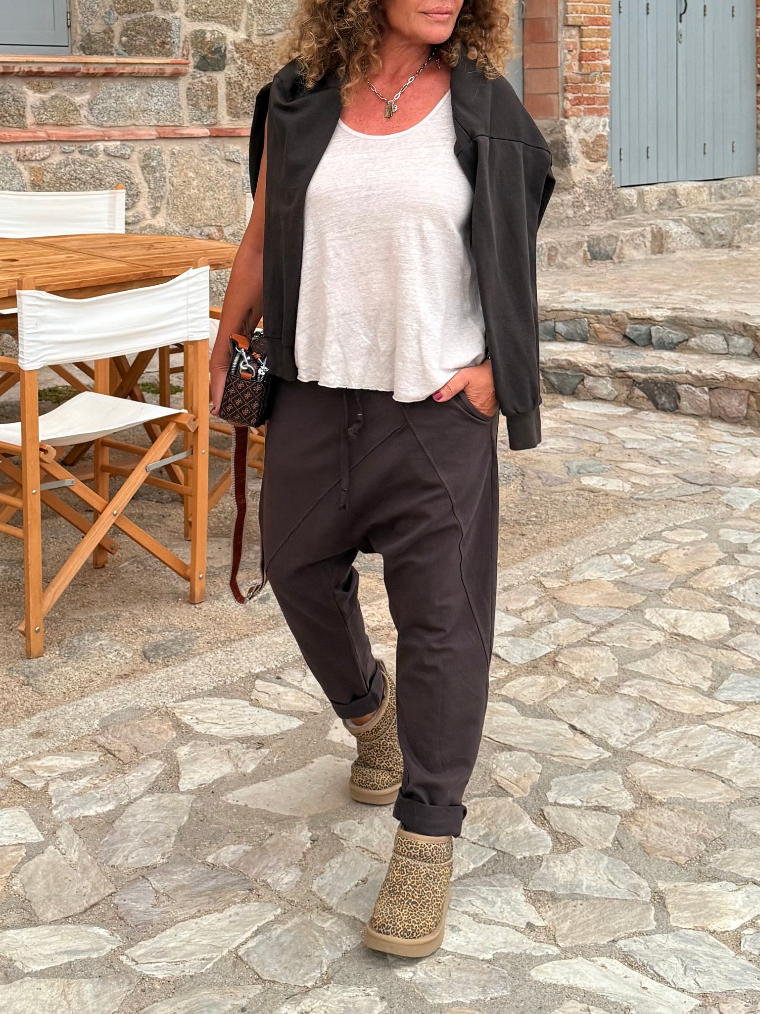 Pantalón de algodón, 100 × 100 excepcional con corte Valle y cintura con goma ajustable. Válido hasta talla 40. Un pantalón que te encantará por su comodidad y versatilidad.