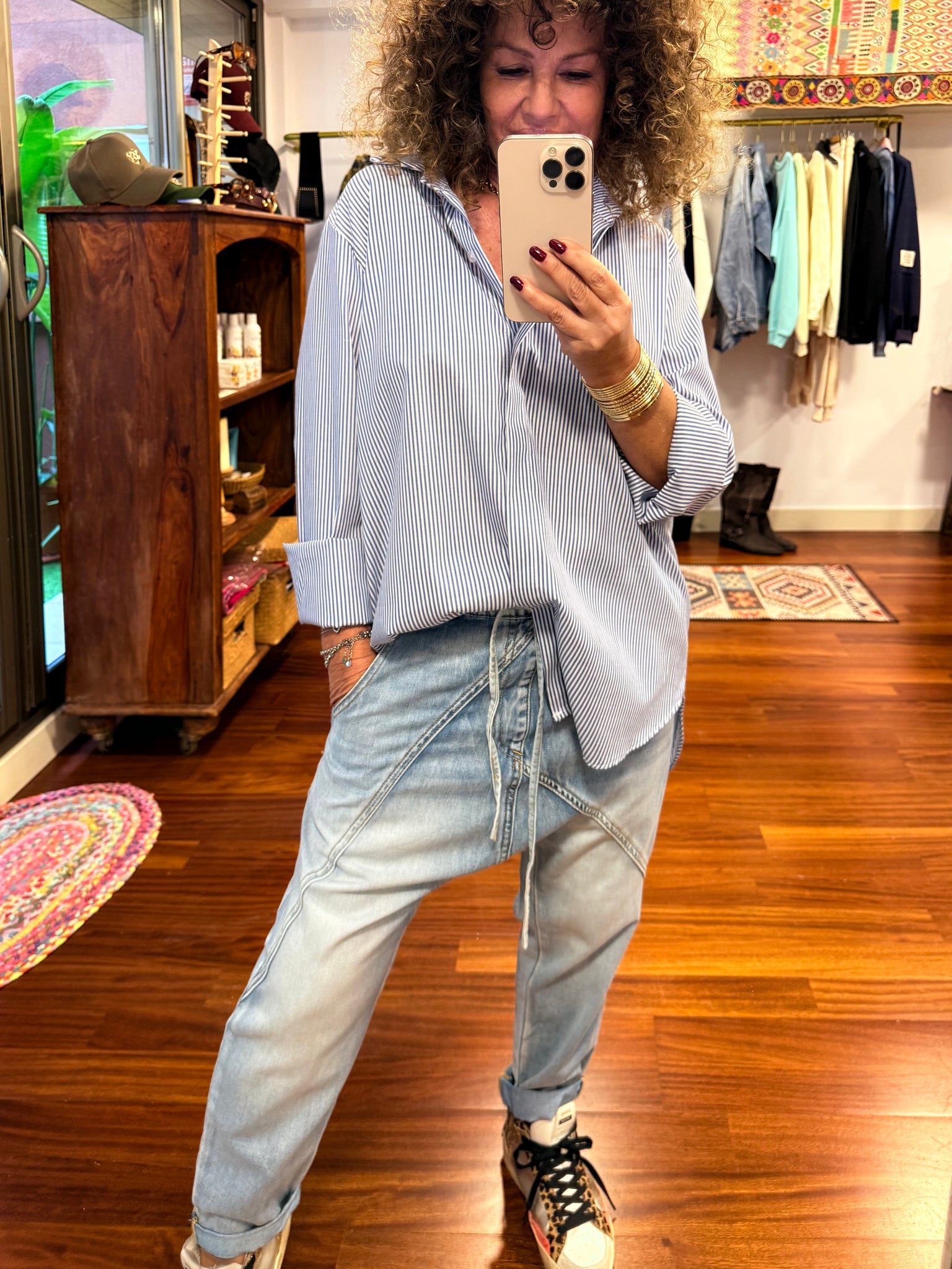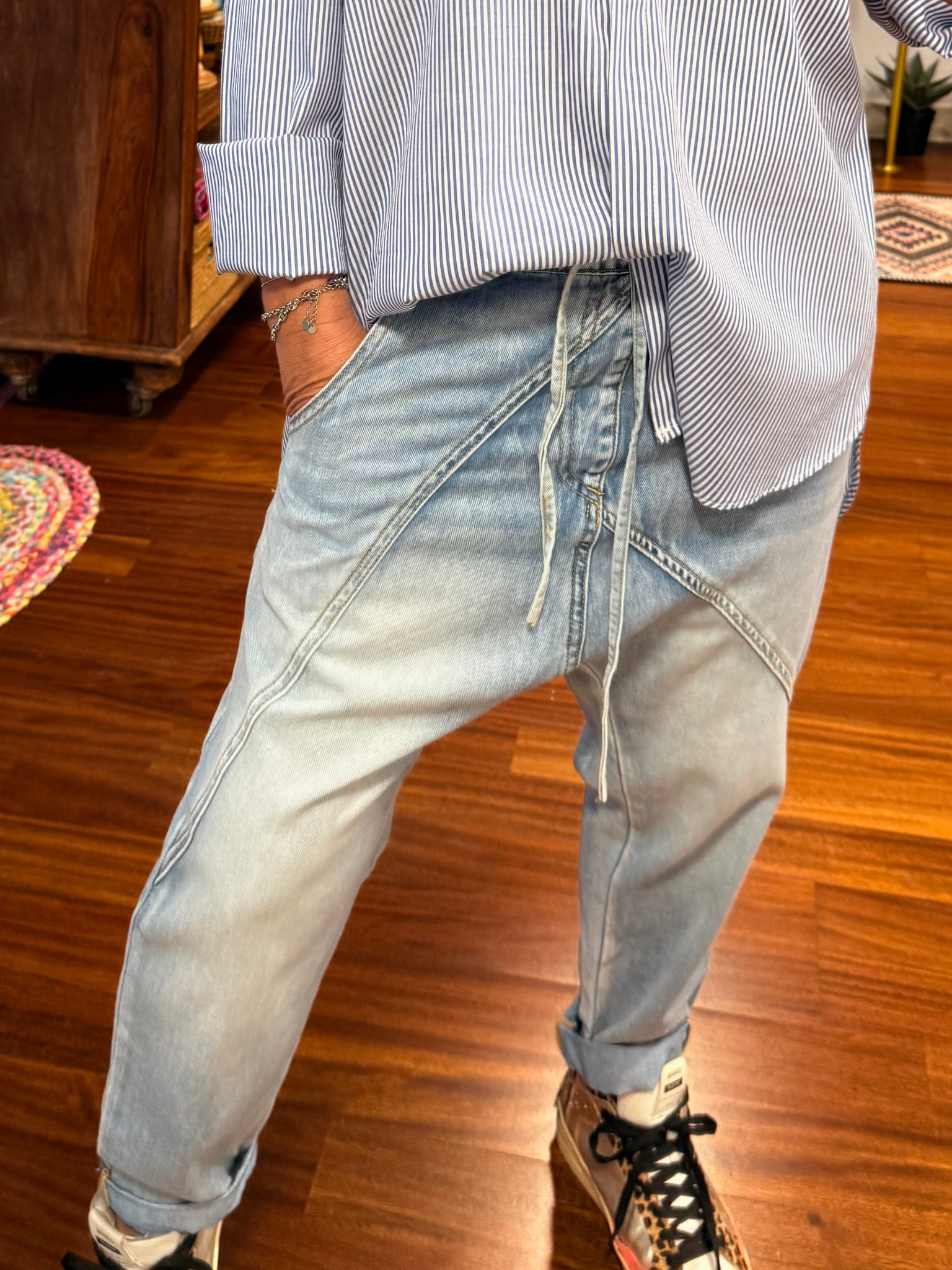 Pantalón tejano con patrón Baggy en azul, claro desgastado con un Tejano muy suave y excepcional, tiene goma en la cintura, un tejano súper cómodo, bonito y versátil. Si eres amante de los Baggys, no te puedes quedar sin él varias tallas tallan completos.