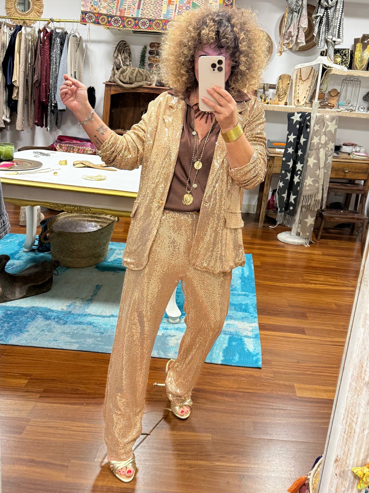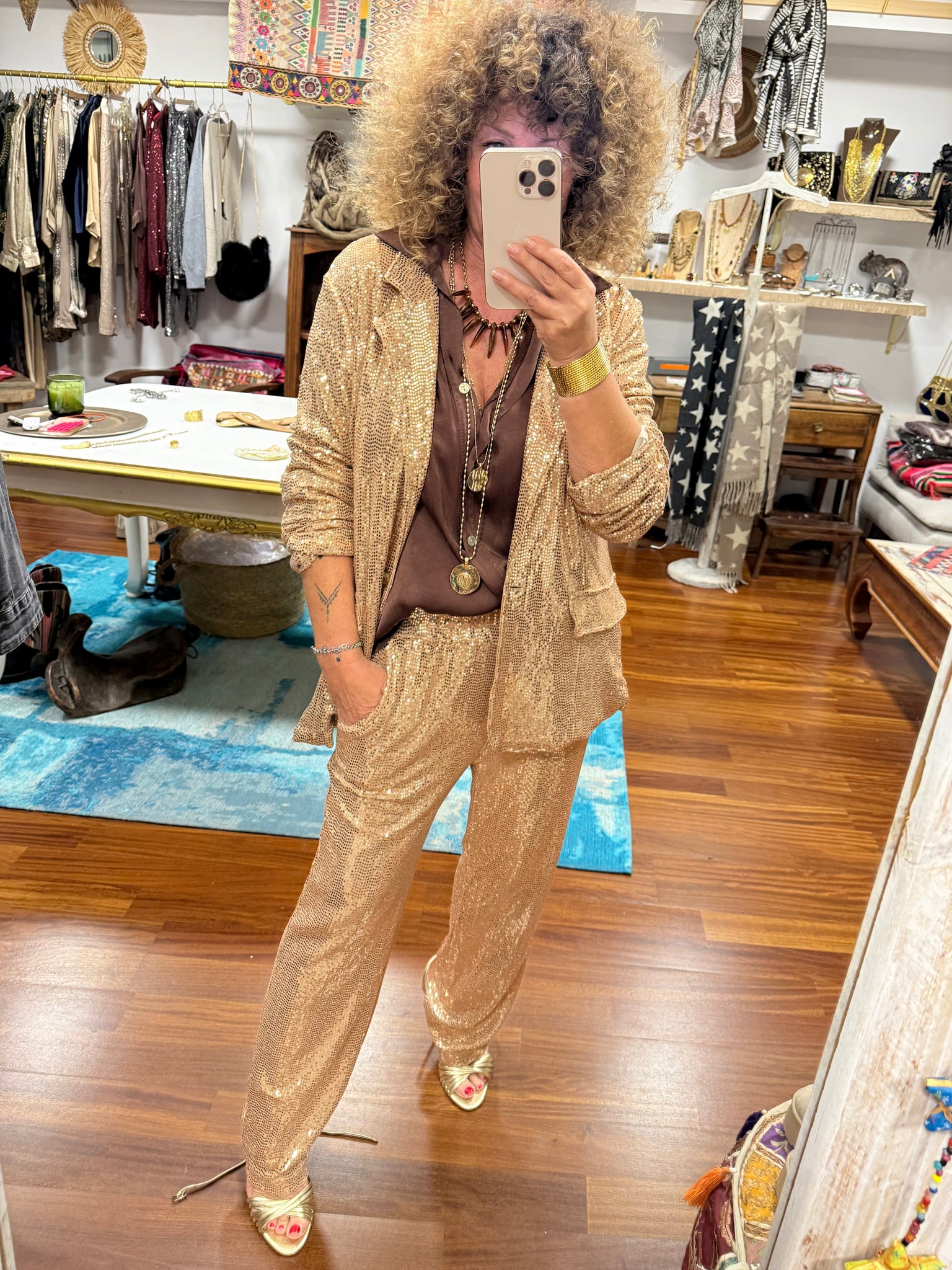 Blazer con micro Payettes en dorado incrustados en el tejido, un blazer para brillar súper elegante! Talla única muy elástico y adaptable a varias tallas! Válido hasta talla 42
