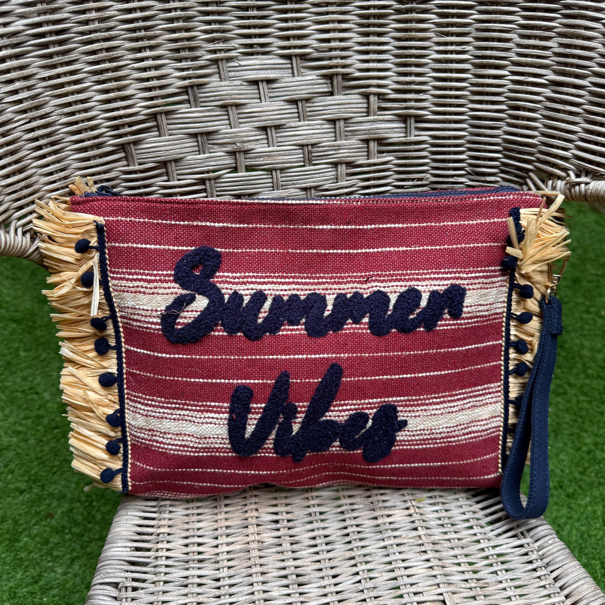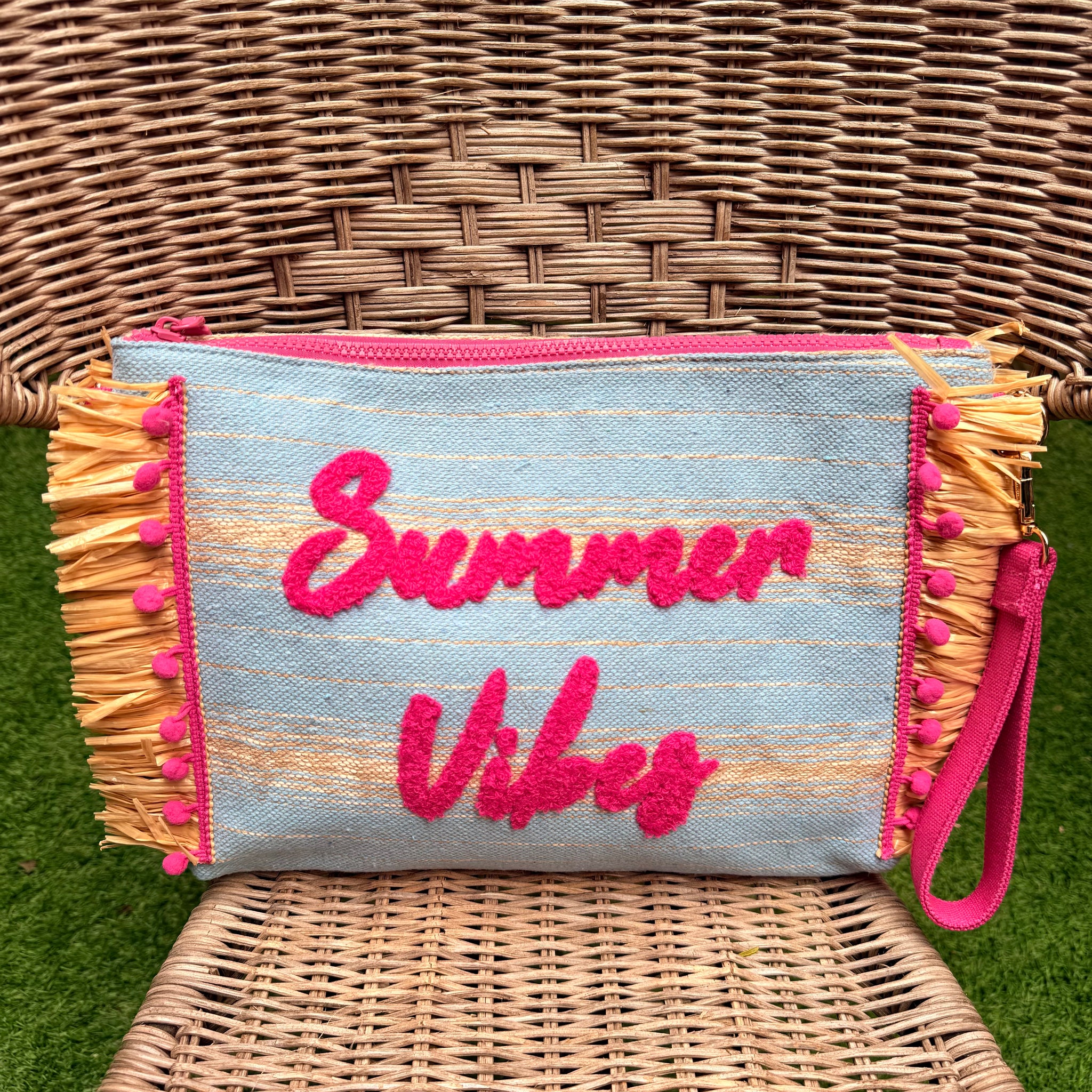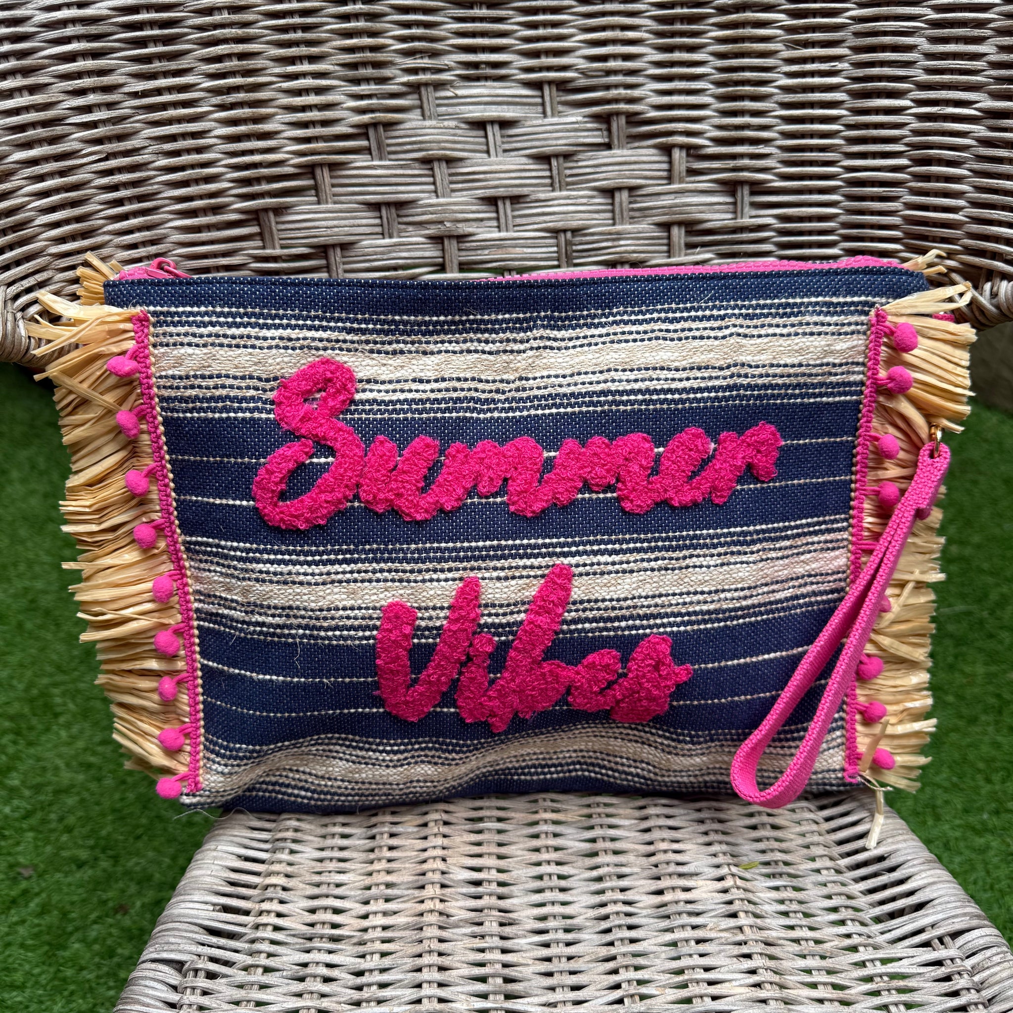 Bolso/cluth de loneta y rafia con logo bordado en toalla! Con agarre de mano y cinta larga para colgar también! Con cierre de cremallera! Súper bonito y veraniego!! Varios colores!