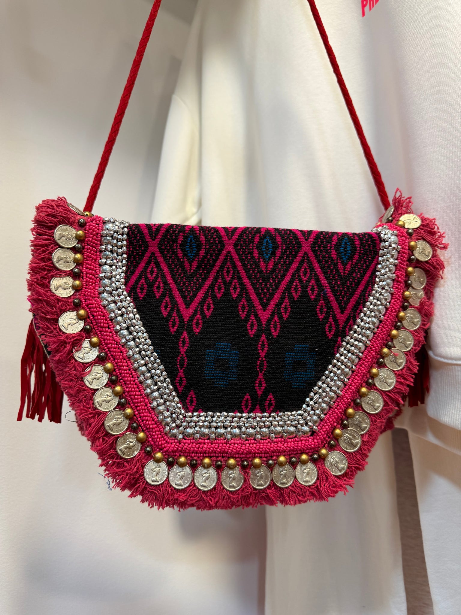 Bolso auténtico de India, realizado con tapices, pasamanería, y monedas con cinta para colgar de ante. Un bolso lleno de color y alegría quedará un toque muy bobo a Tus Outfit. Tamaño sobre rectangular 32 × 24 cm con cierre de clip y bolsillo interior.