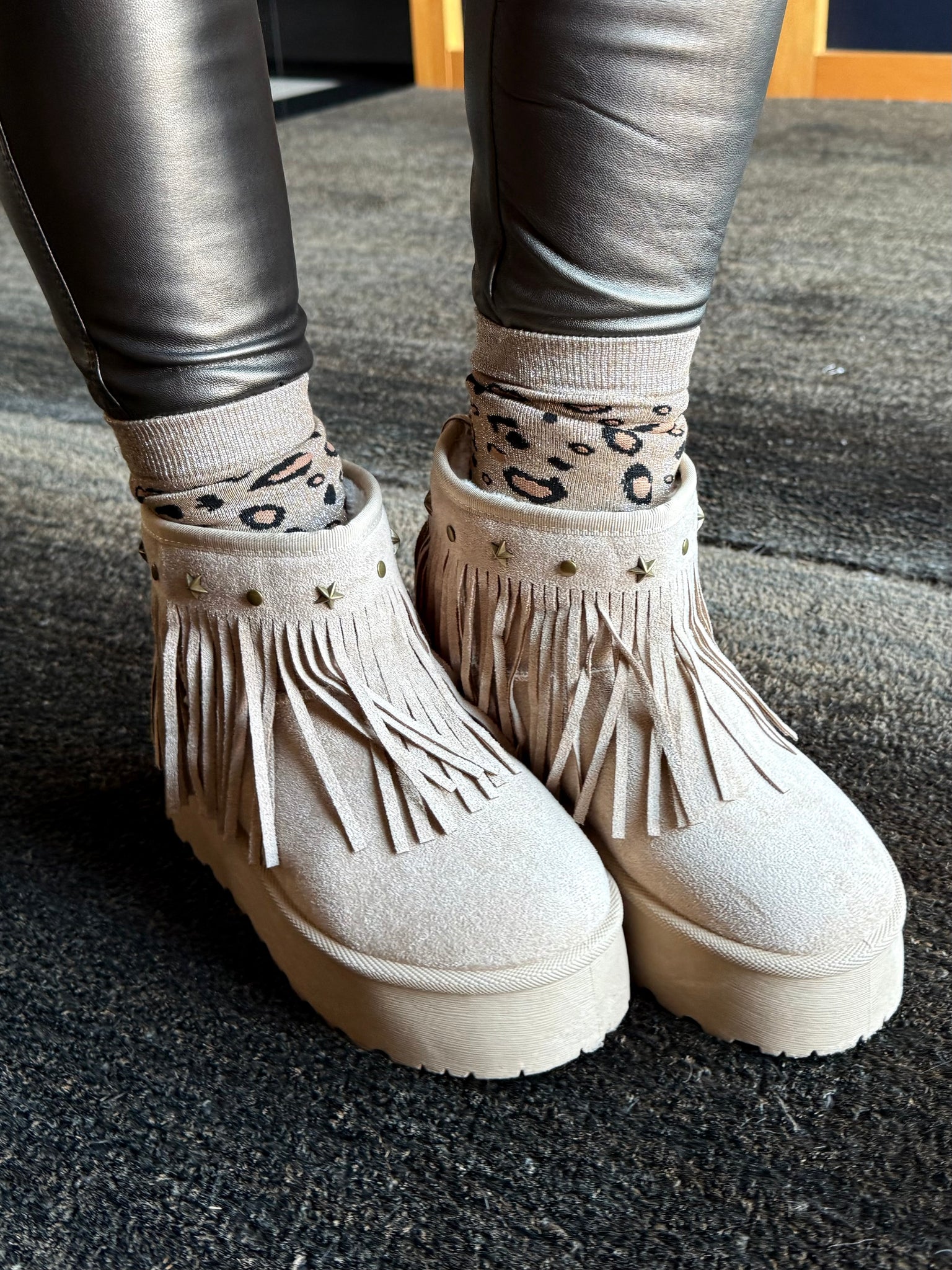 Bota corta de antelina en color crudo con flecos y tachas pequeñas , forrada de Borreguito y un poco de plataforma! Una bota súper calentita, cómoda y súper bonita! Y Con un color perfecto para combinar con todo!