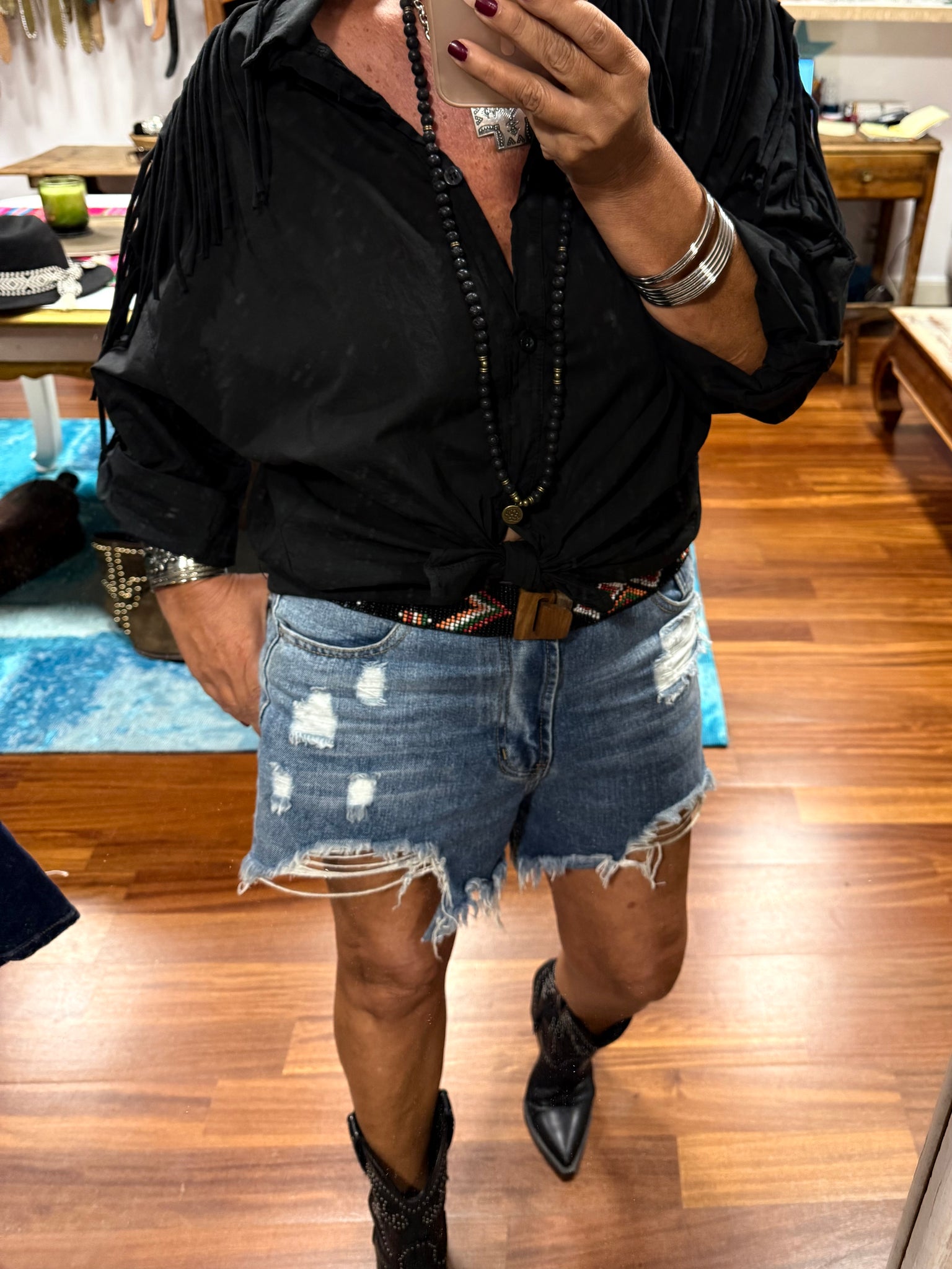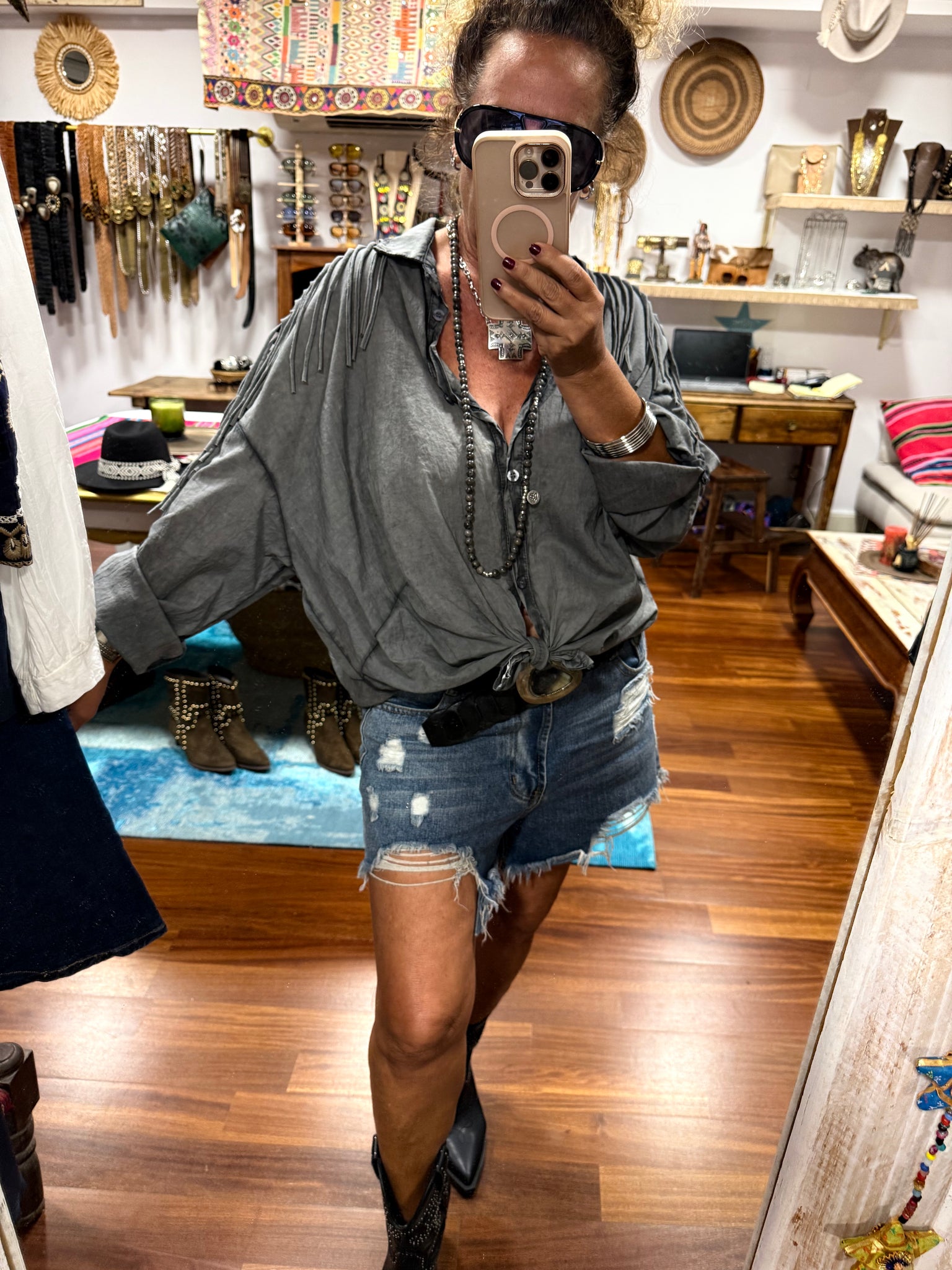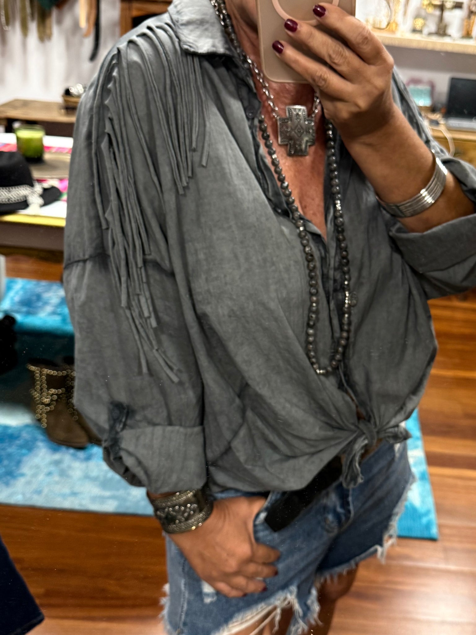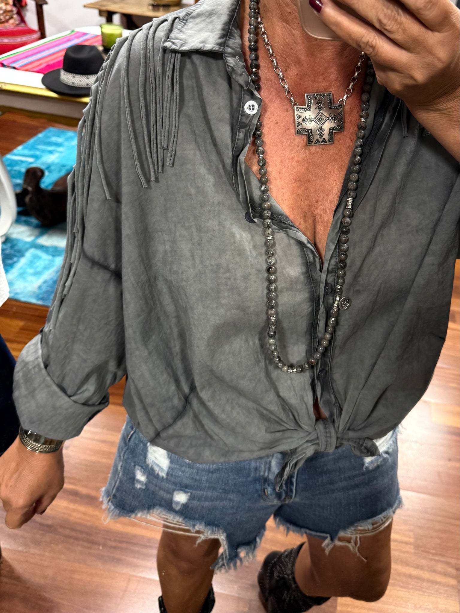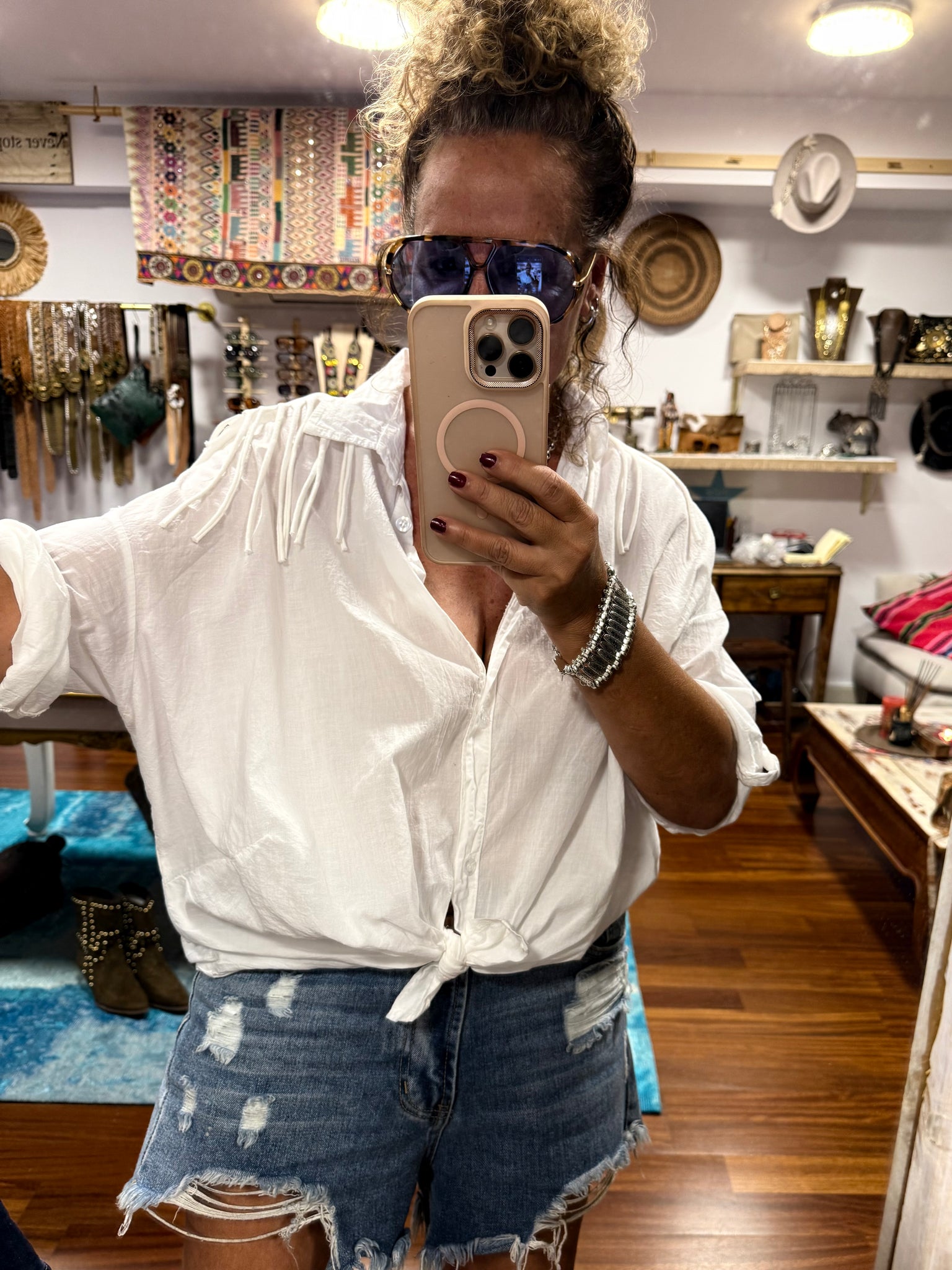 Camisa de algodón corte clásico, con detalle de flecos y posible para llevar anudada. Una camisa súper chula y muy tendencia. Varios colores. Talla única válida hasta talla 42/44.