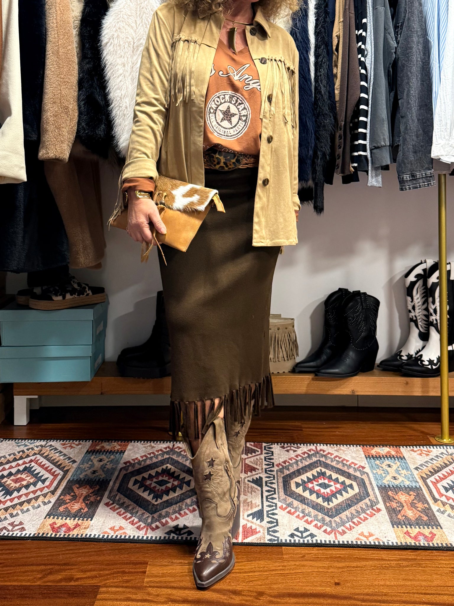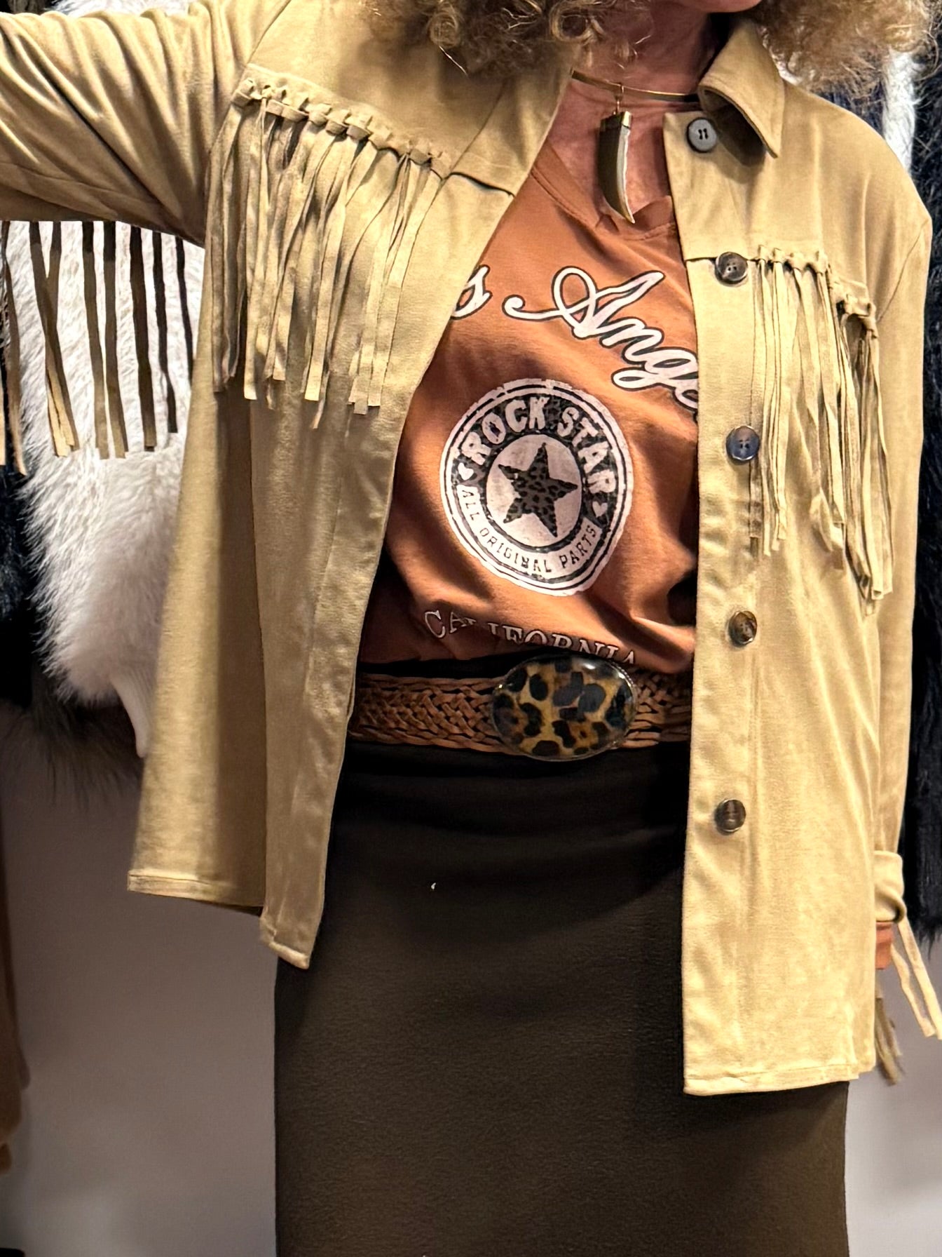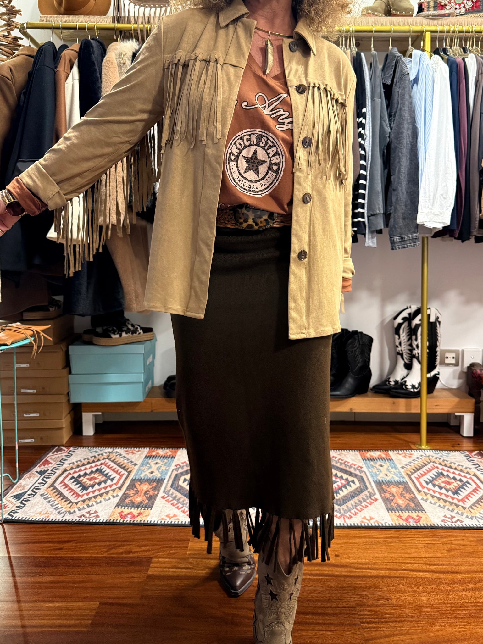 Camisa de Antelina de color natural beige (que parece ante)una calidad 10! súper suave y muy logrado, con flecos en mangas y espalda, una camisa espectacular que también queda perfecta como chaqueta abierta y te dará a cualquier look el súper toque Bohochic! Dos tallas tallan justas!