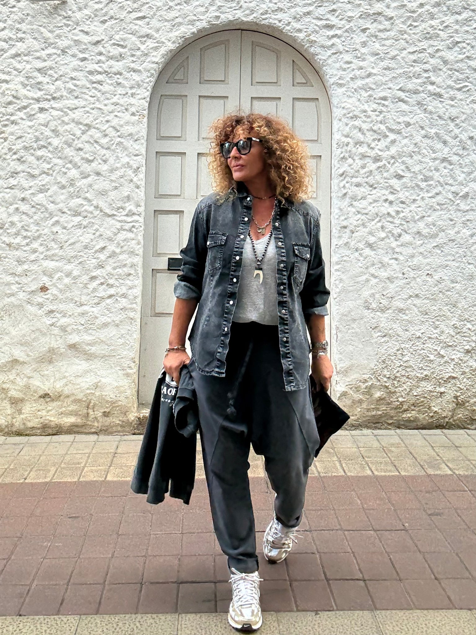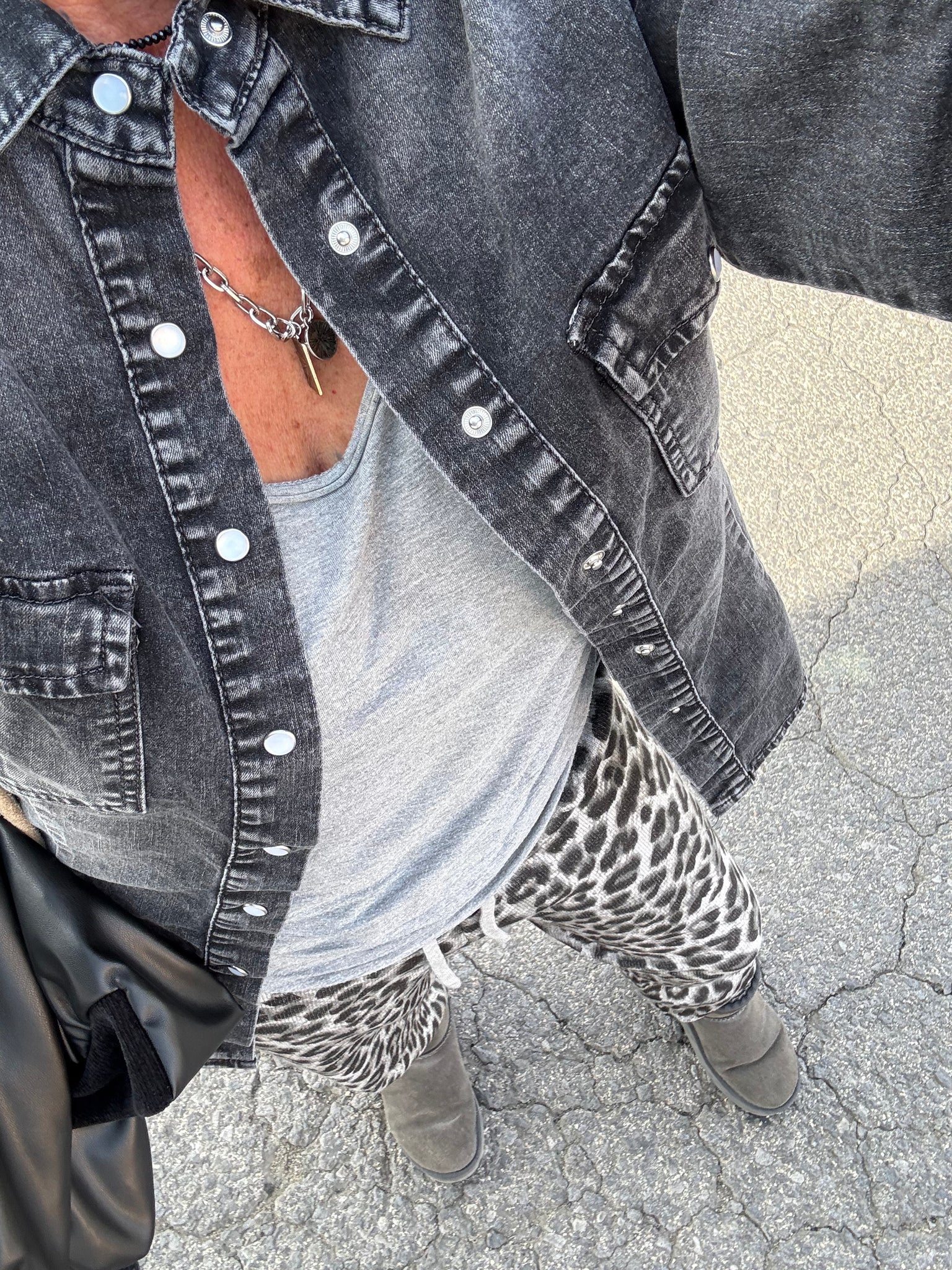 Camisa tejana en color gris de tejano elástico y con un patrón perfecto! Una camisa muy tendencia y actual! Varias tallas. Tallan completas!