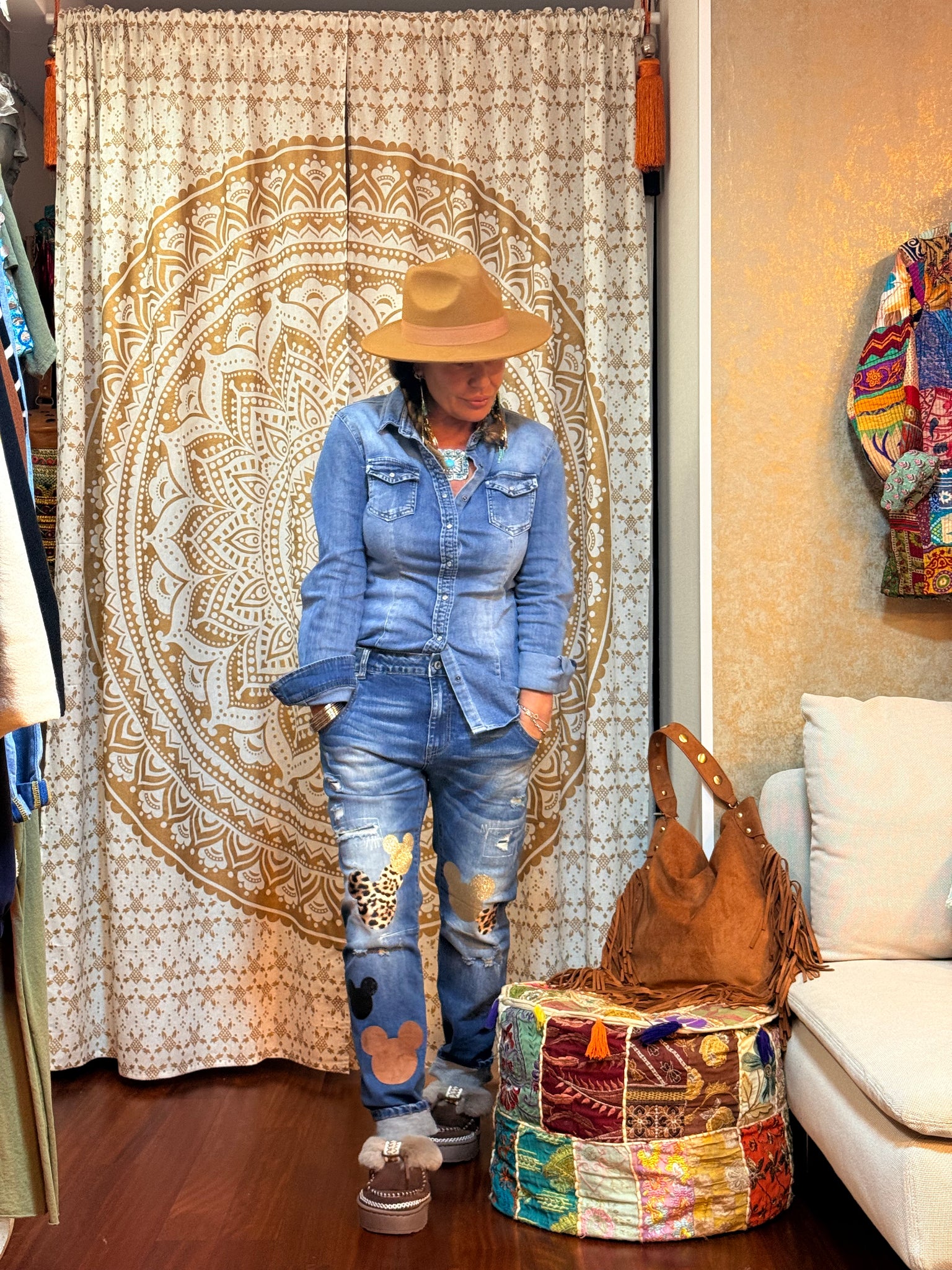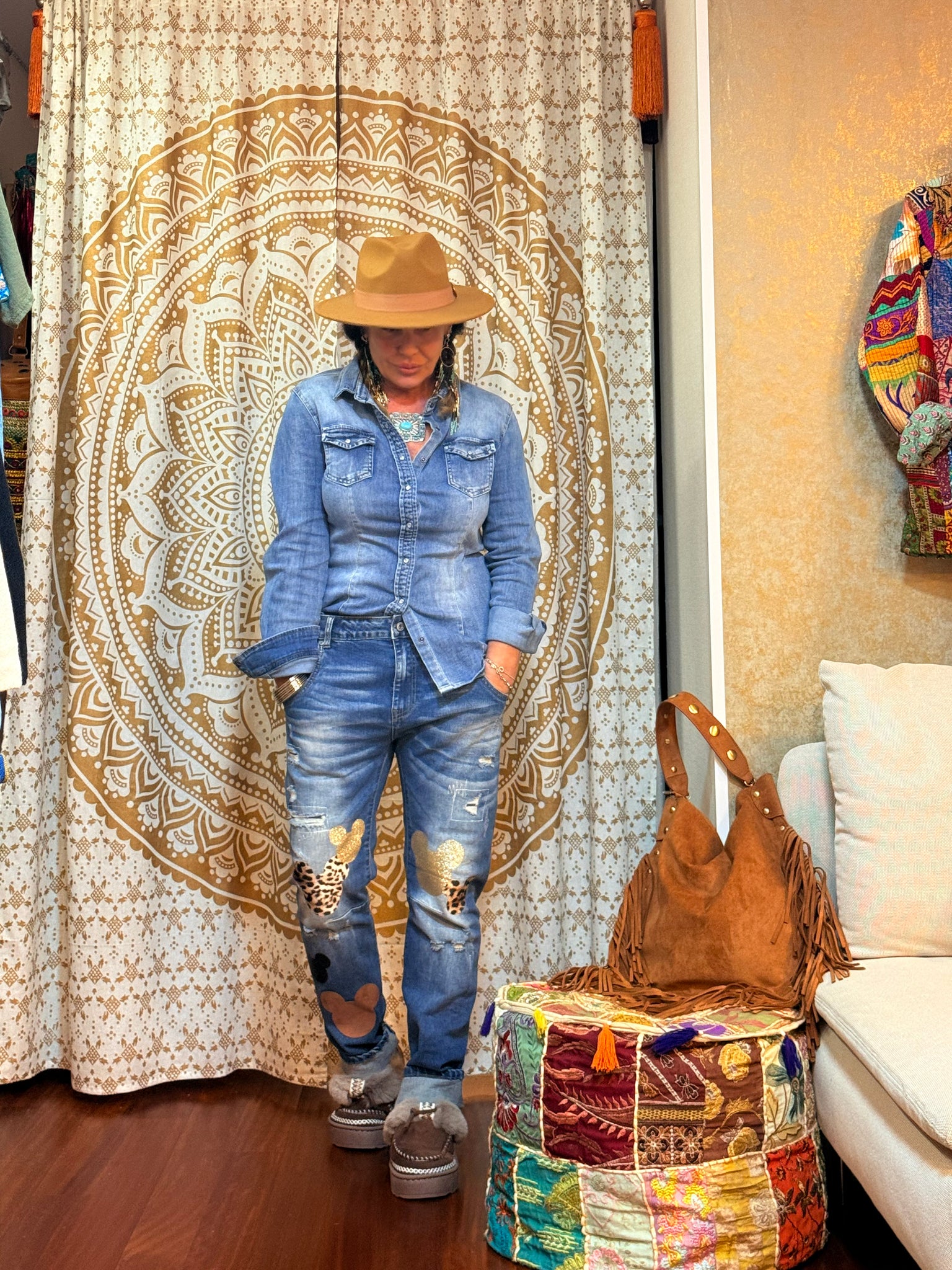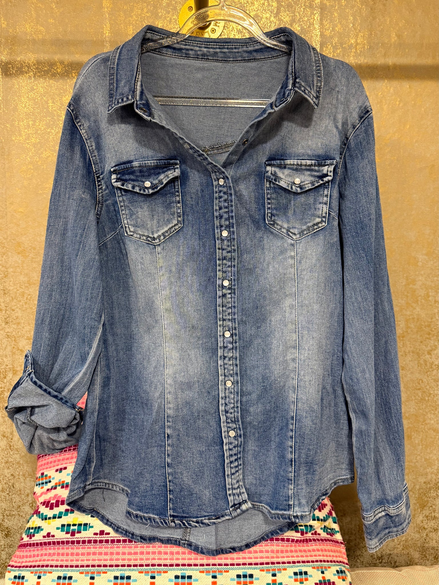Camisa, tejana en color Azul medio desgastado de tejano elástico y con patrón con un poco de forma. Una camisa tejana perfecta que no te puede faltar en tu armario, te dará mucho juego para muchísimas combinaciones!