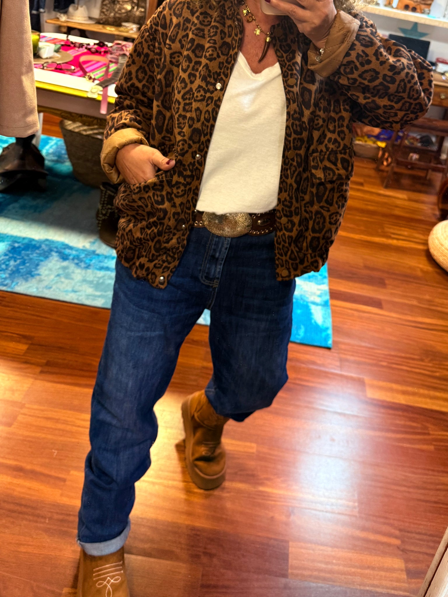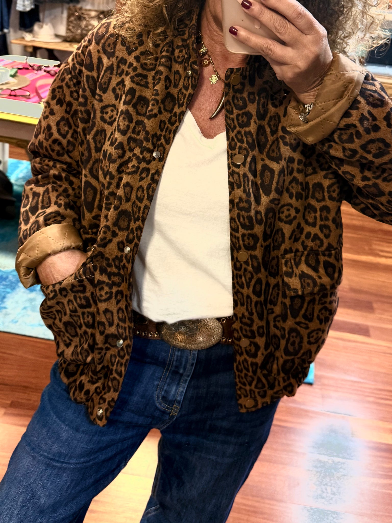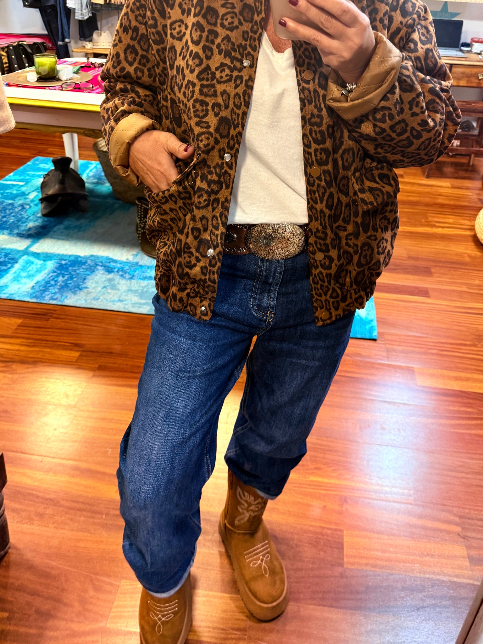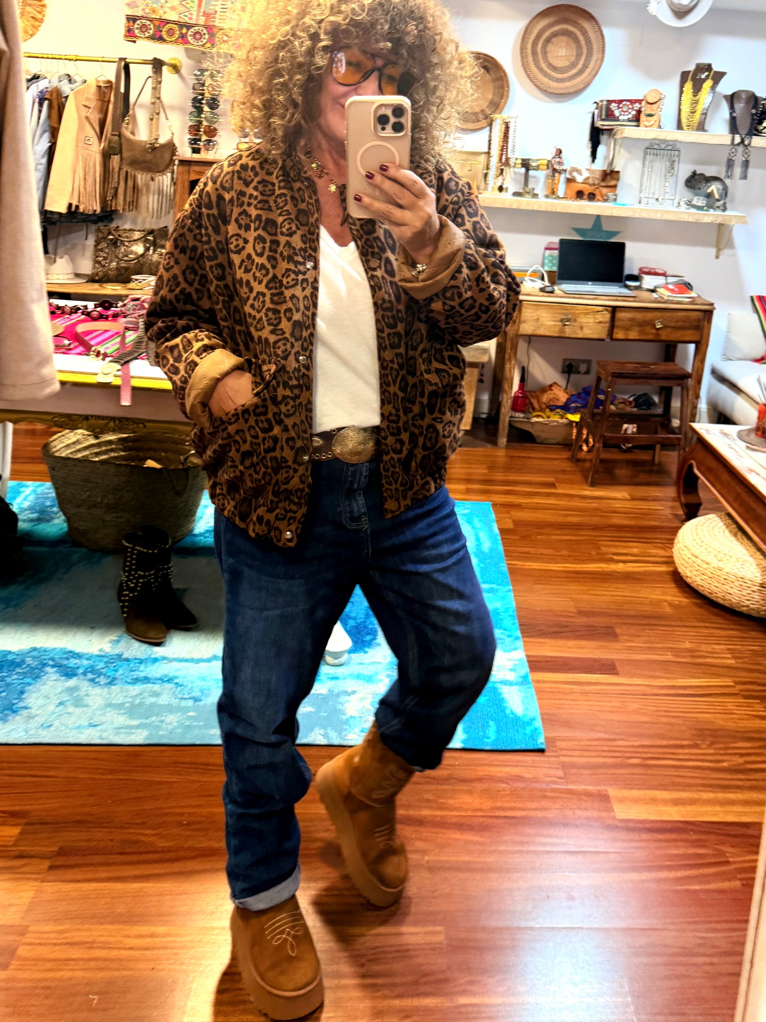 Cazadora con un patrón muy actual con estampado de leopardo tiene goma en la cintura, bolsillos grandes y cierre con cremallera. Forro guatine.