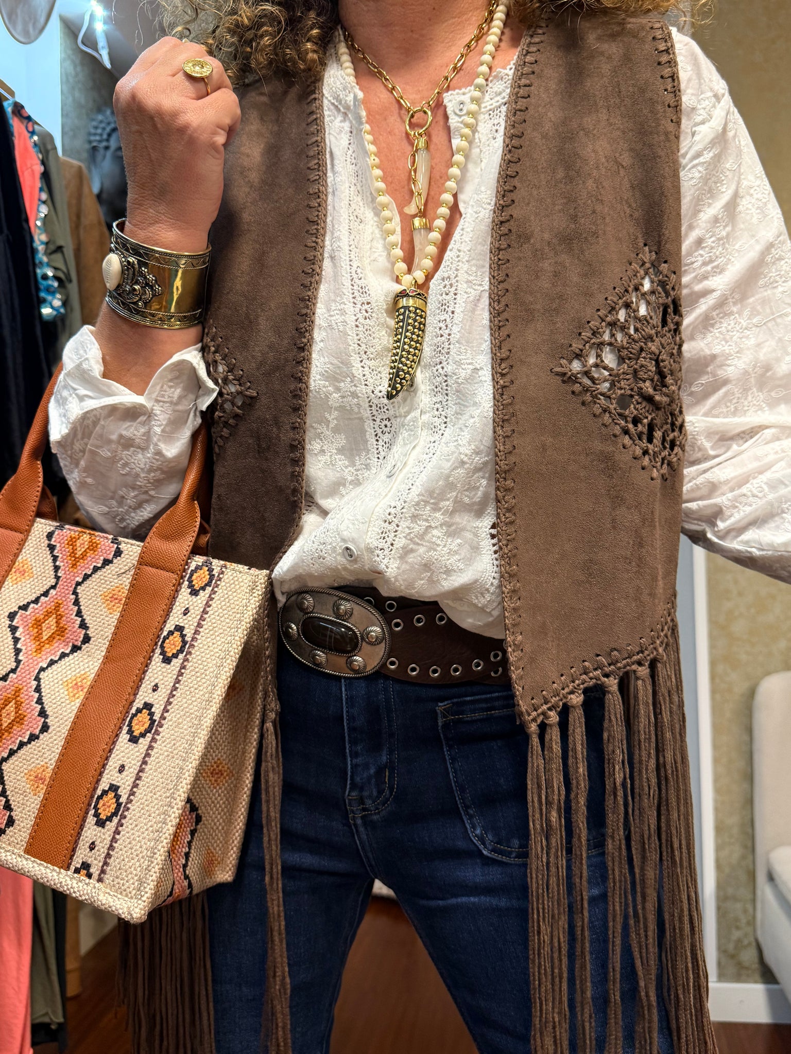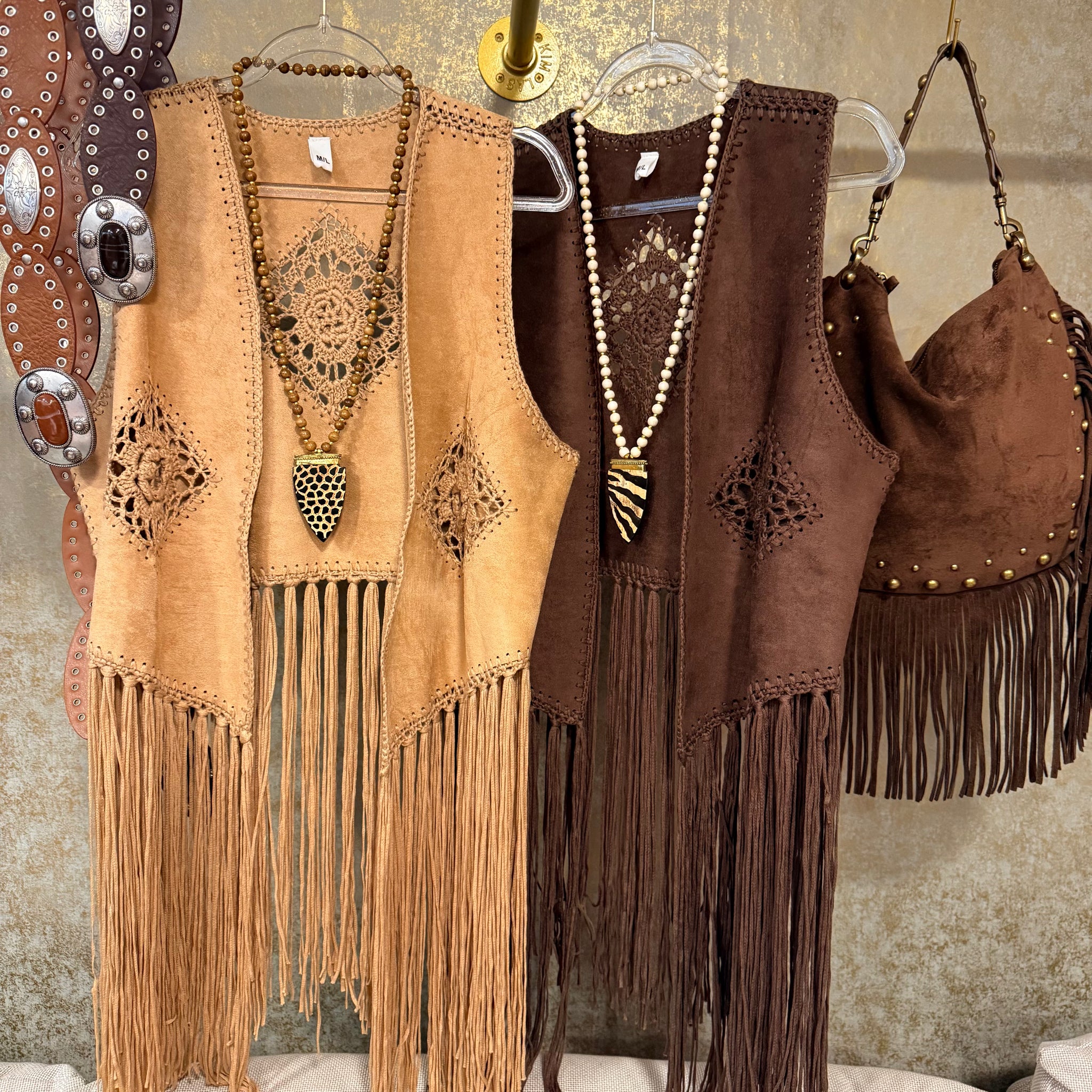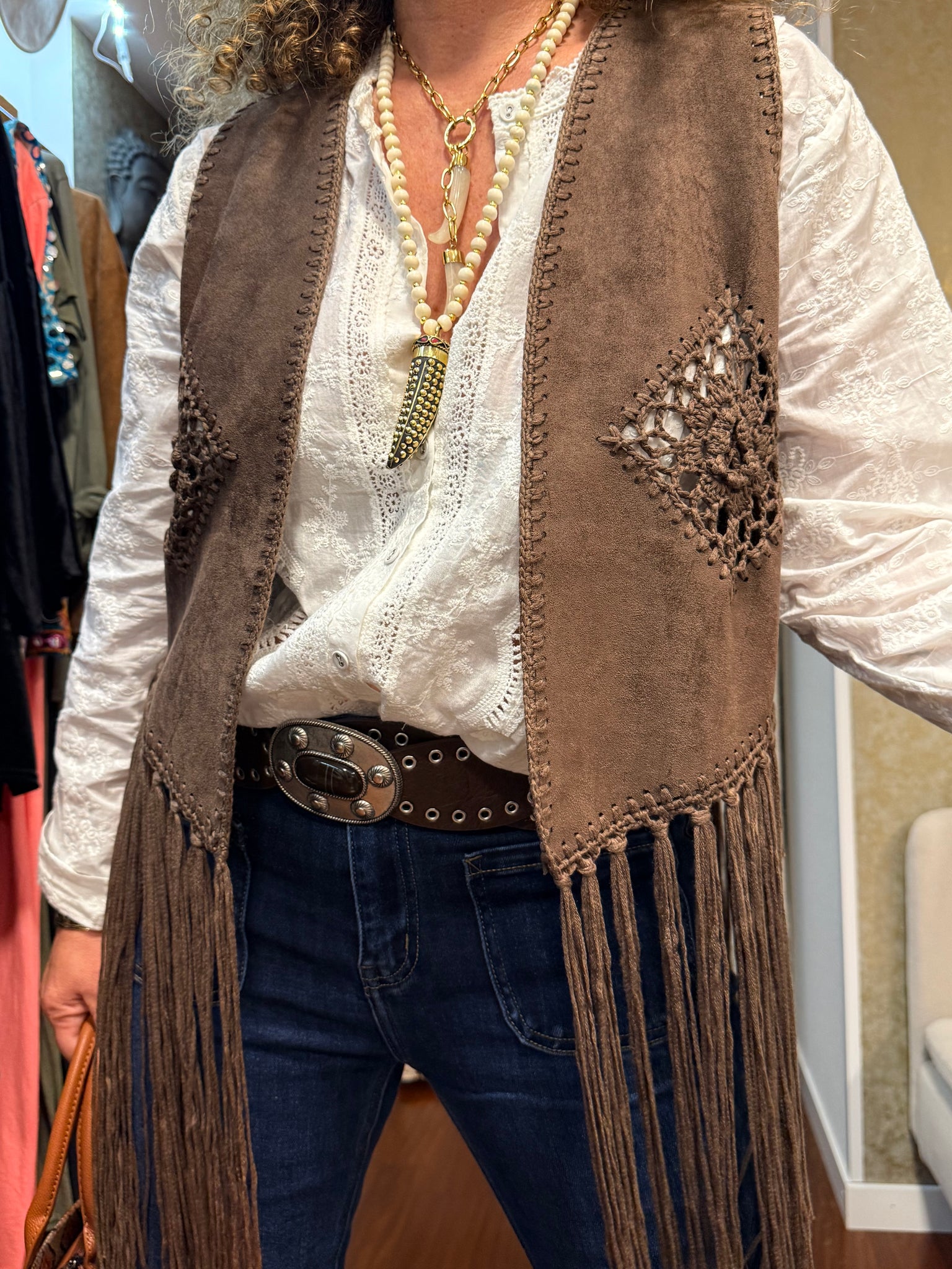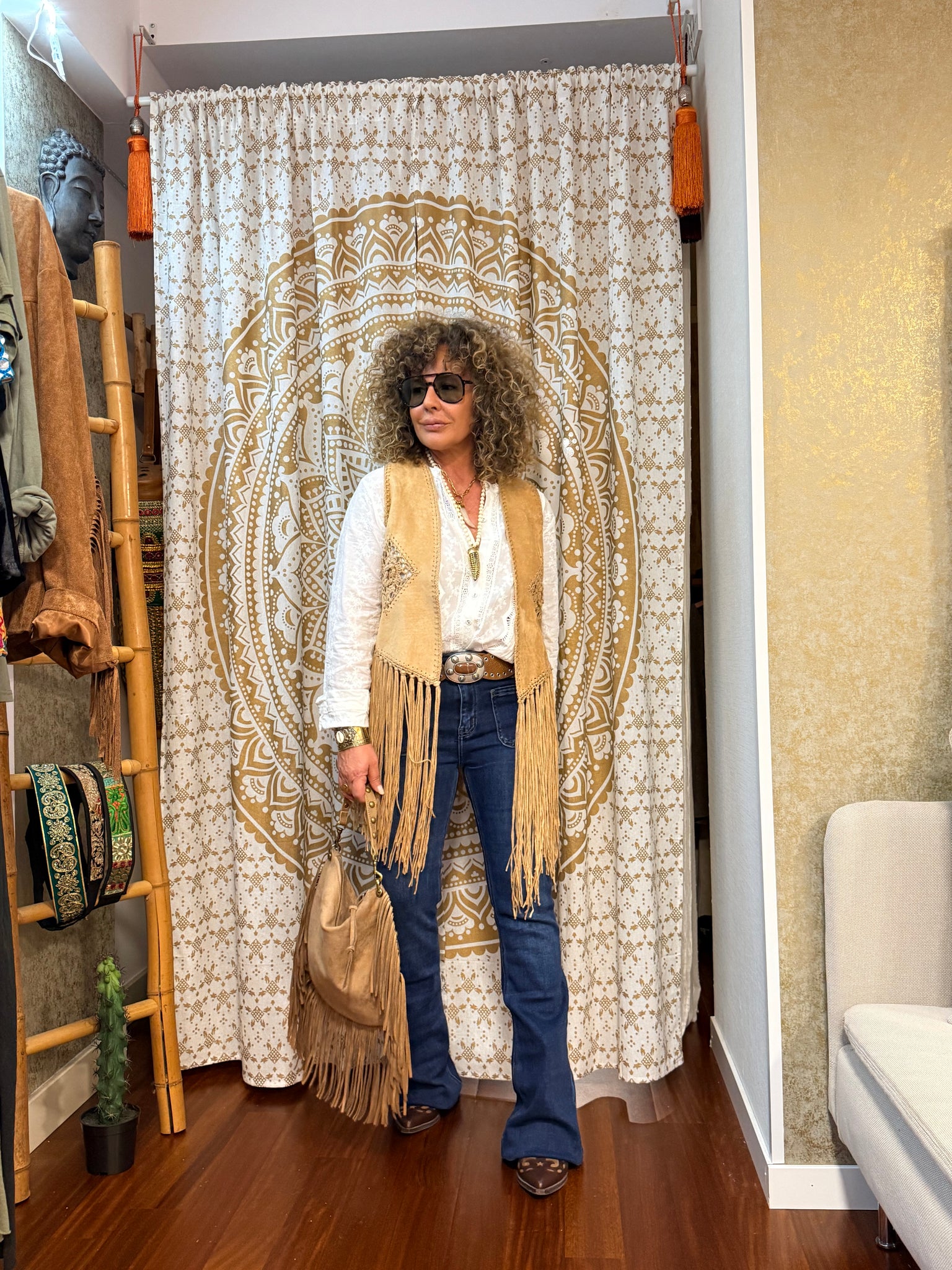 Chaleco de antelina que parece totalmente de ante natural con bordados delante y en espalda y flecos de hilo! Un chaleco espectacular que no te puede faltar si eres una Bohochic! Precioso y te dará un toque muy especial a cualquier blusa o vestido! Te cambiará el look!