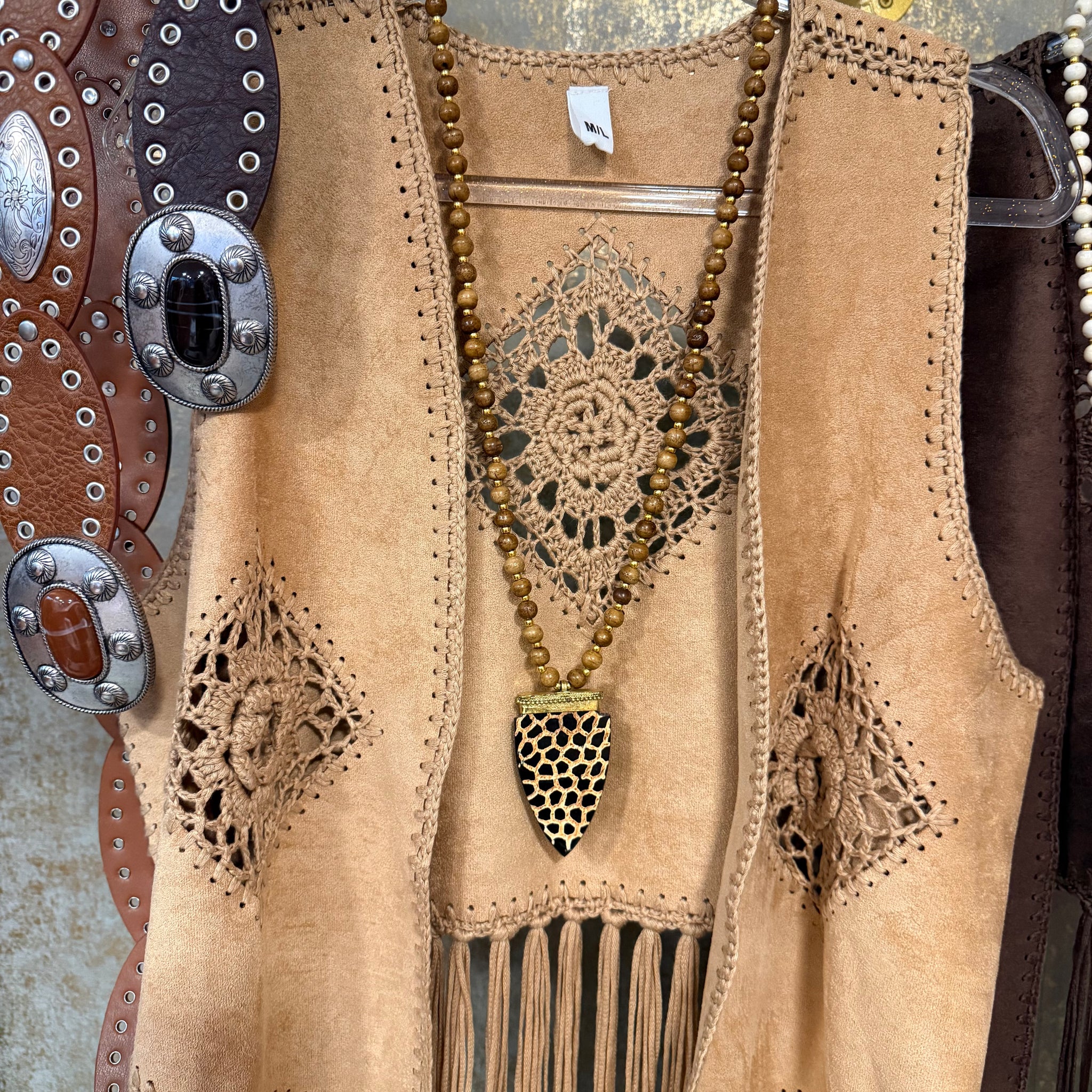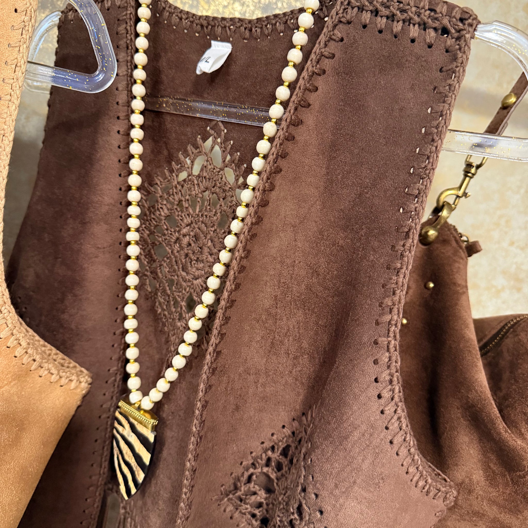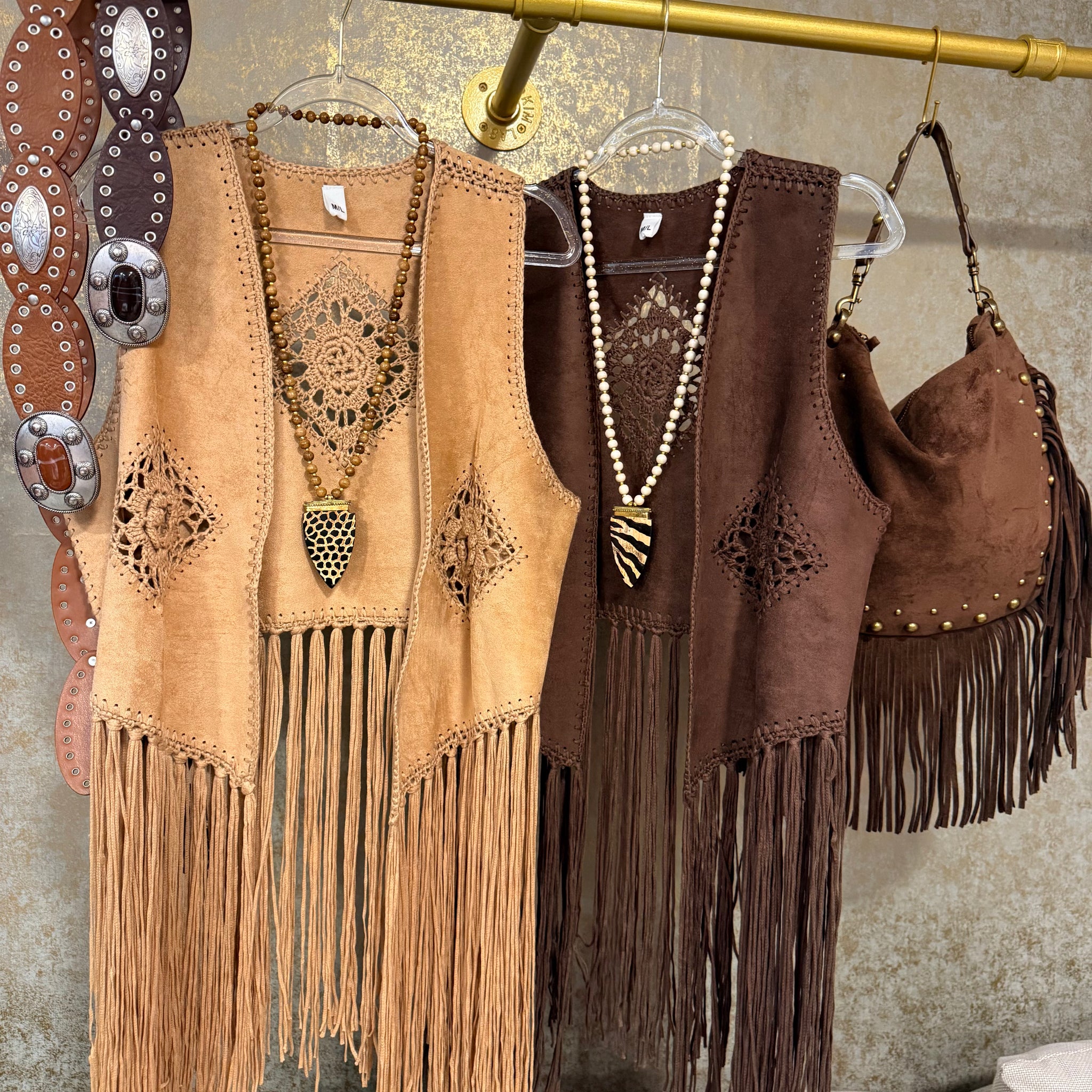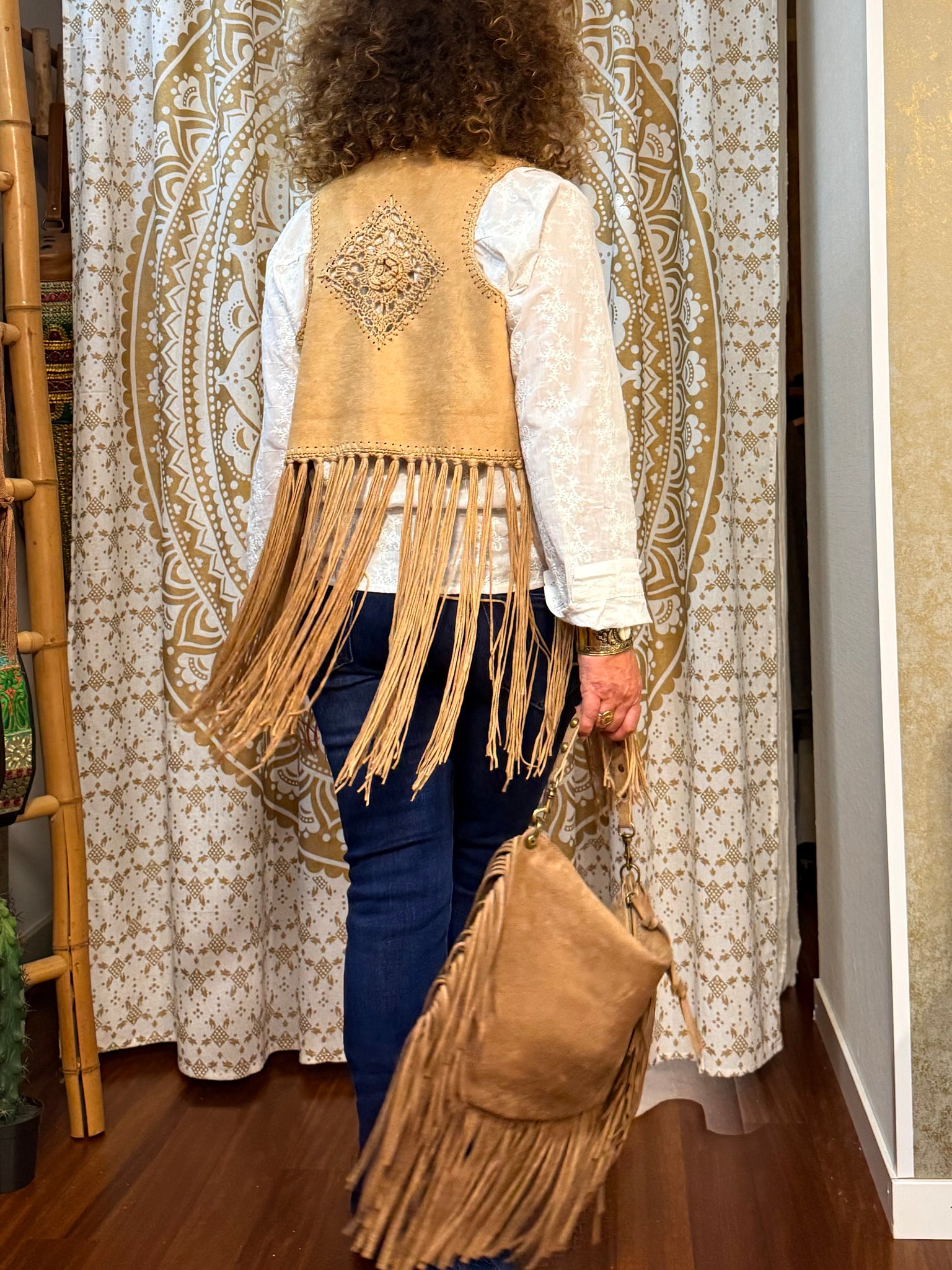 Chaleco de antelina que parece totalmente de ante natural con bordados delante y en espalda y flecos de hilo! Un chaleco espectacular que no te puede faltar si eres una Bohochic! Precioso y te dará un toque muy especial a cualquier blusa o vestido! Te cambiará el look!