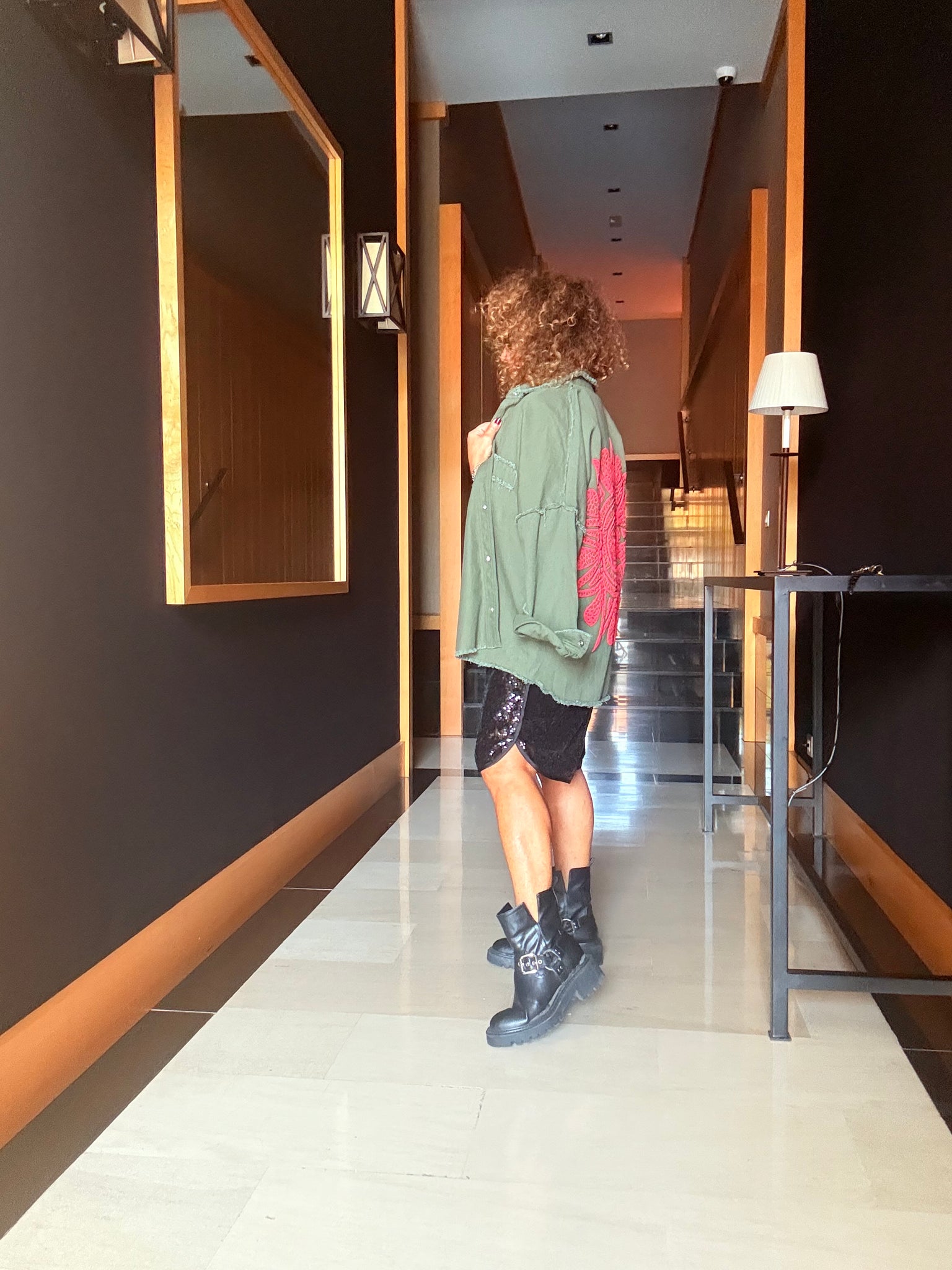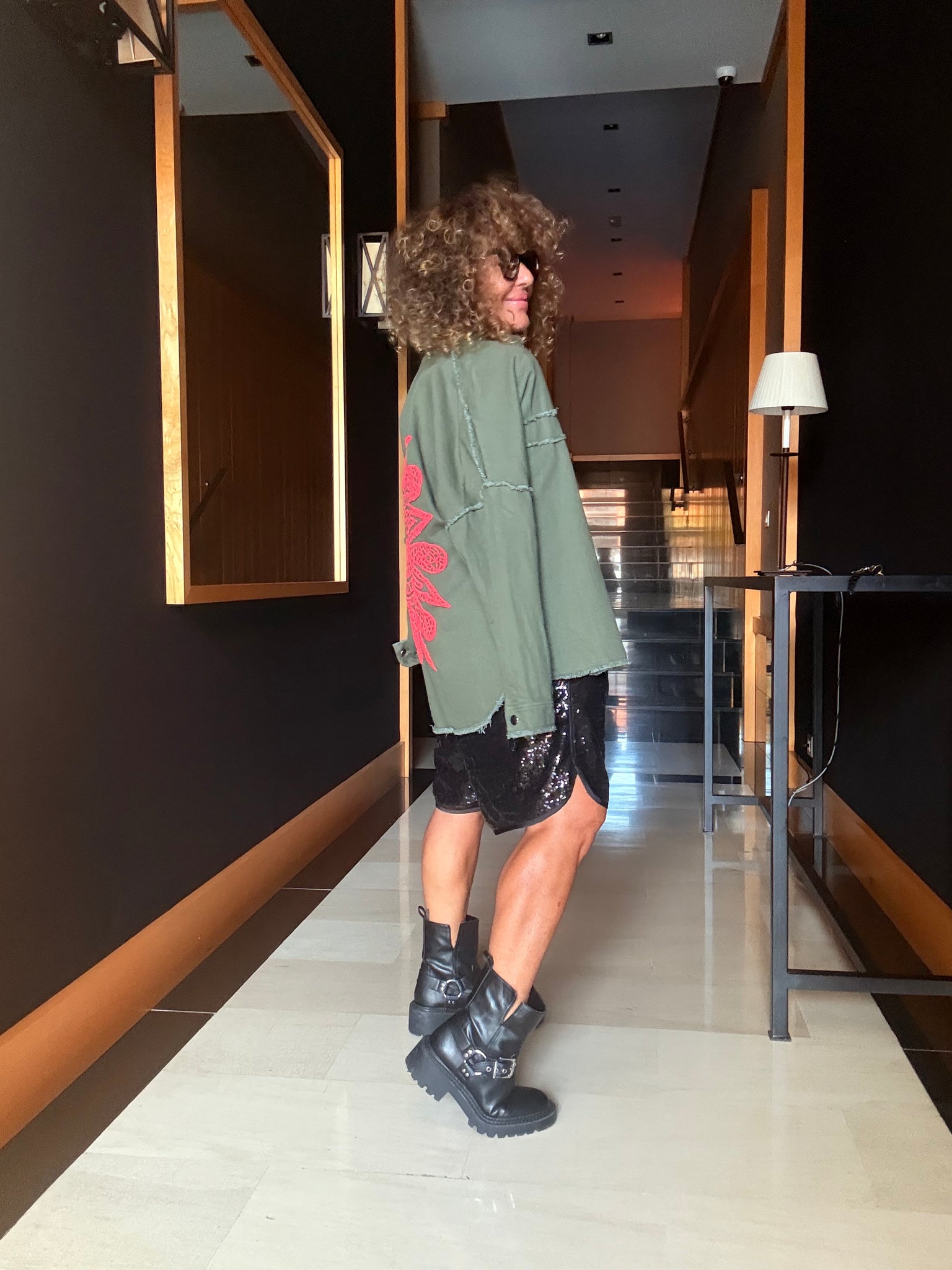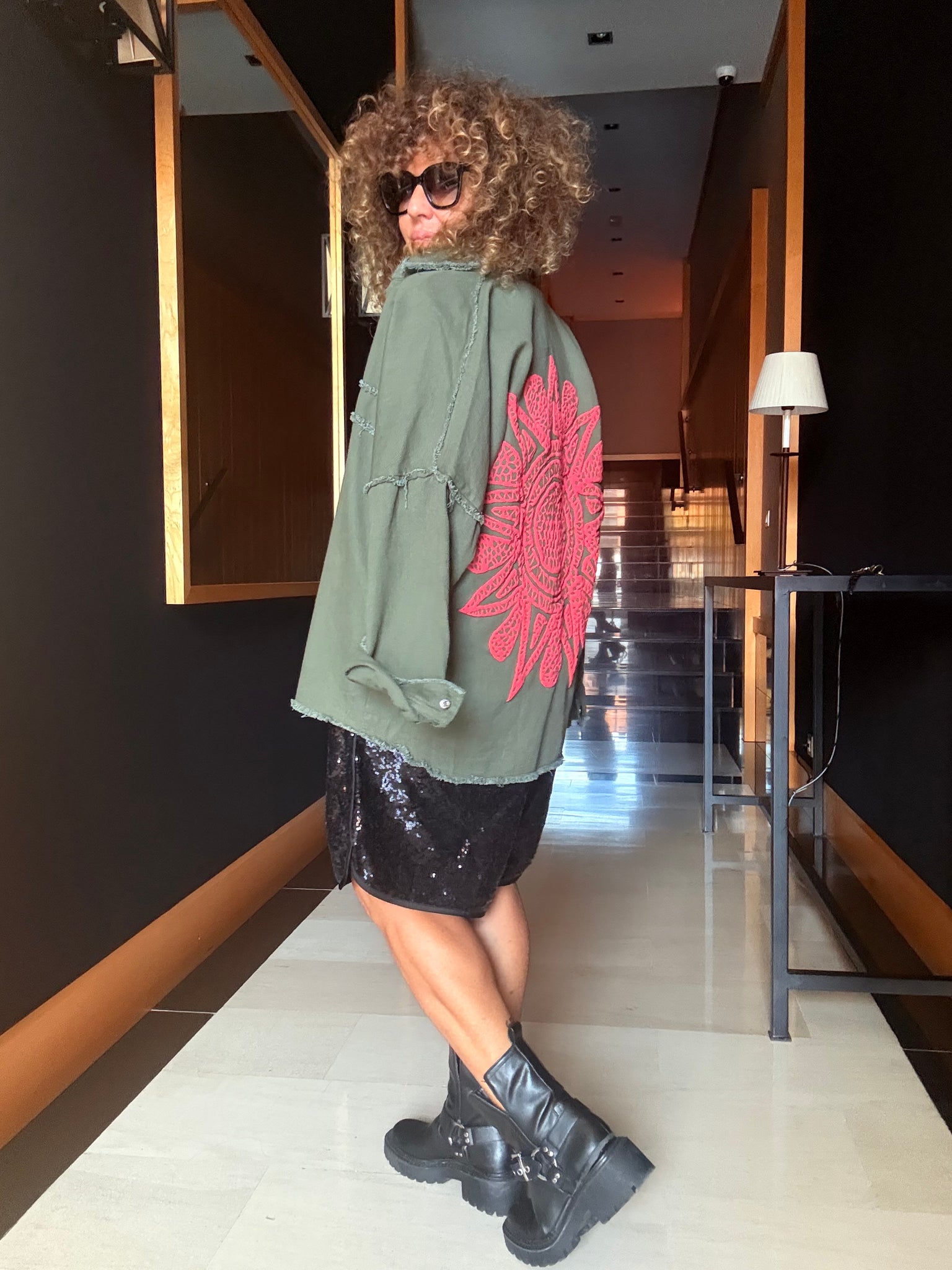 Chaqueta fina o camisa para sobreponer de algodón en color kaki con Mandala trasero en color flúor! Preciosa!! Talla única XL válida hasta talla 42