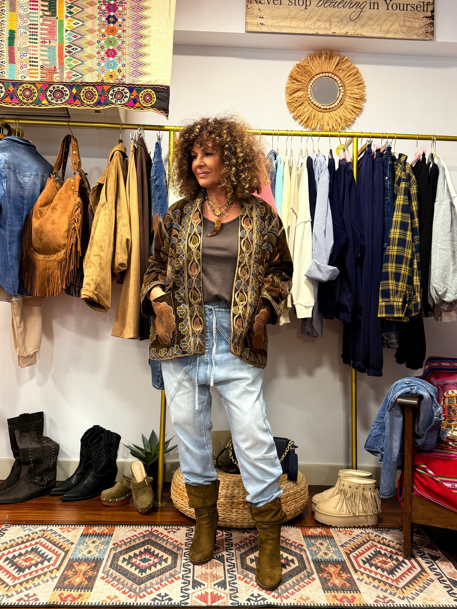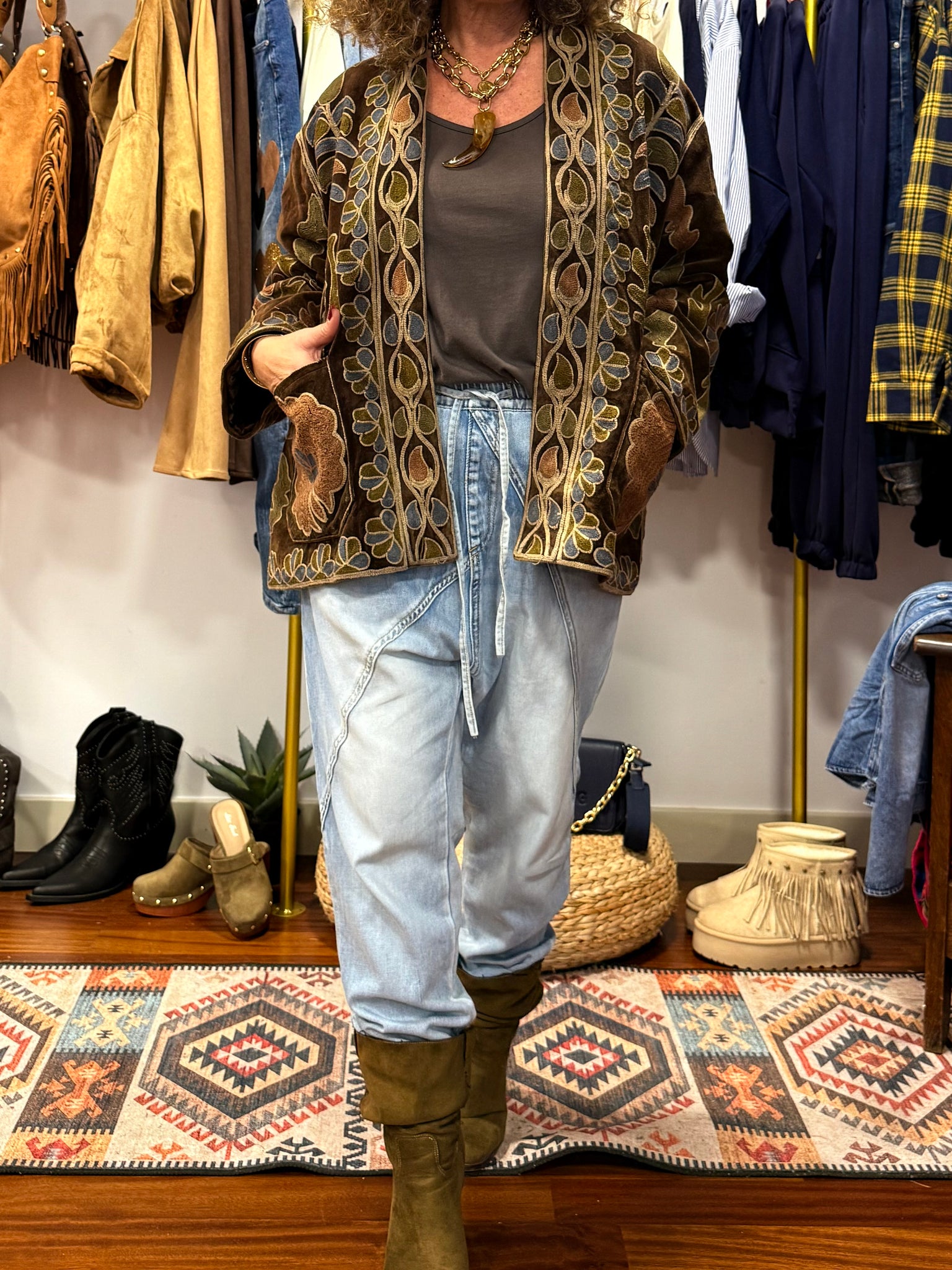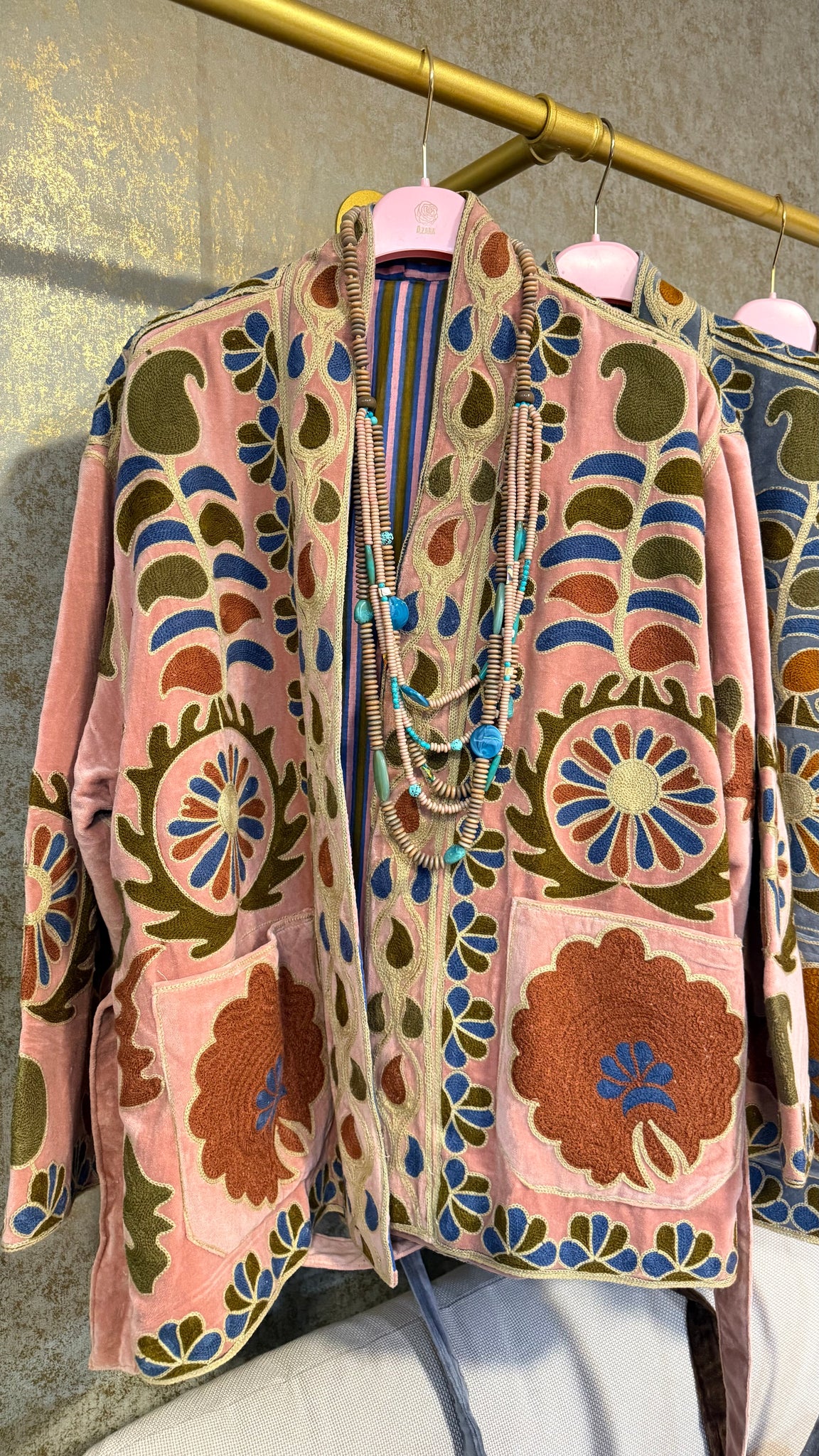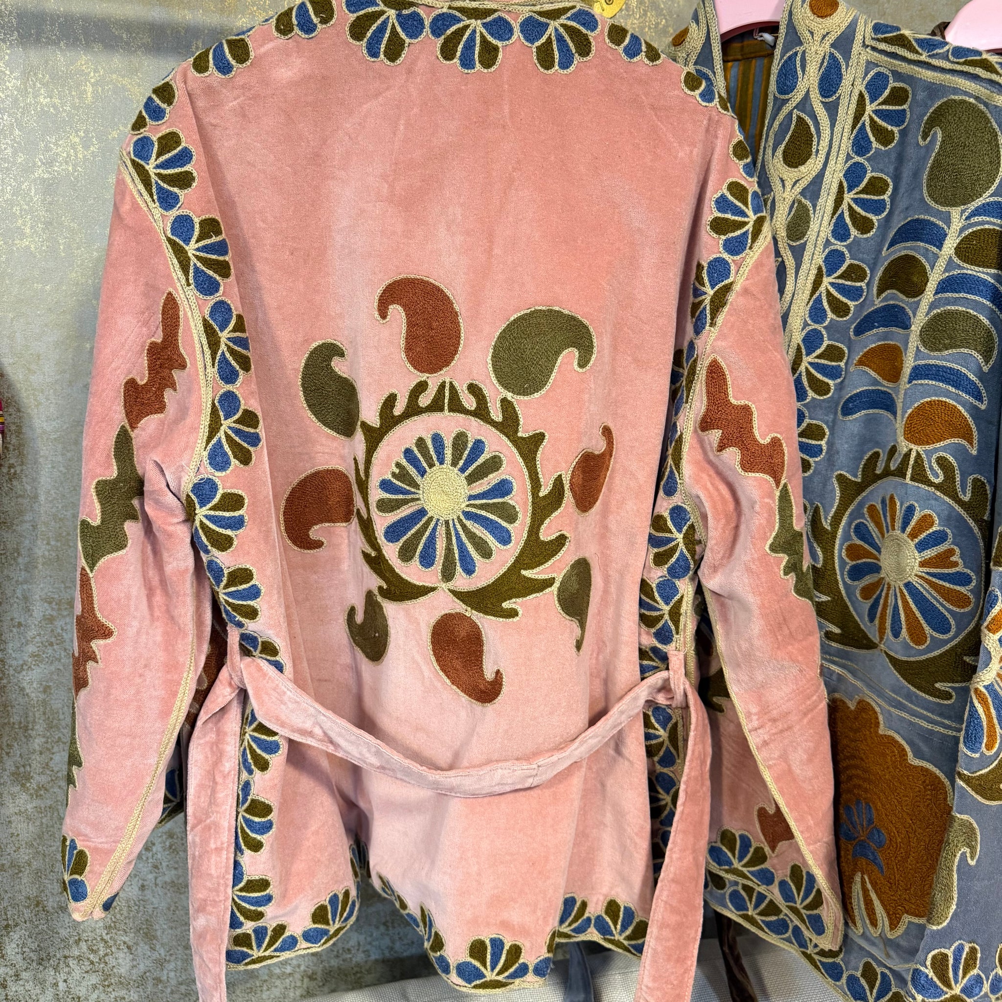 Chaqueta SUZANI ,estilo boho corte kimono ,confeccionada en suave terciopelo,bordada con motivos florales y geométricos en tonos tierra, azul empolvado y rosa envejecido. Una prenda especial de inspiración artesanal que destaca por su personalidad y elegancia.