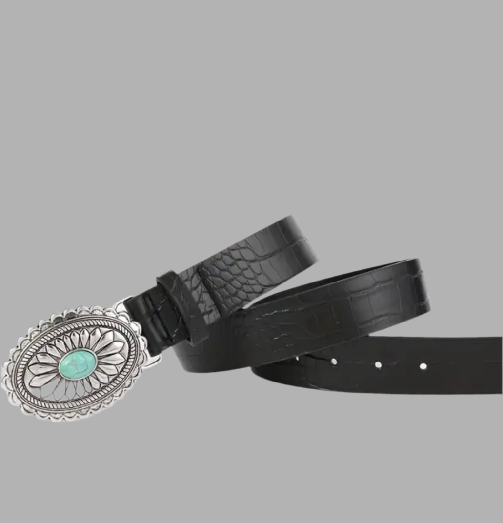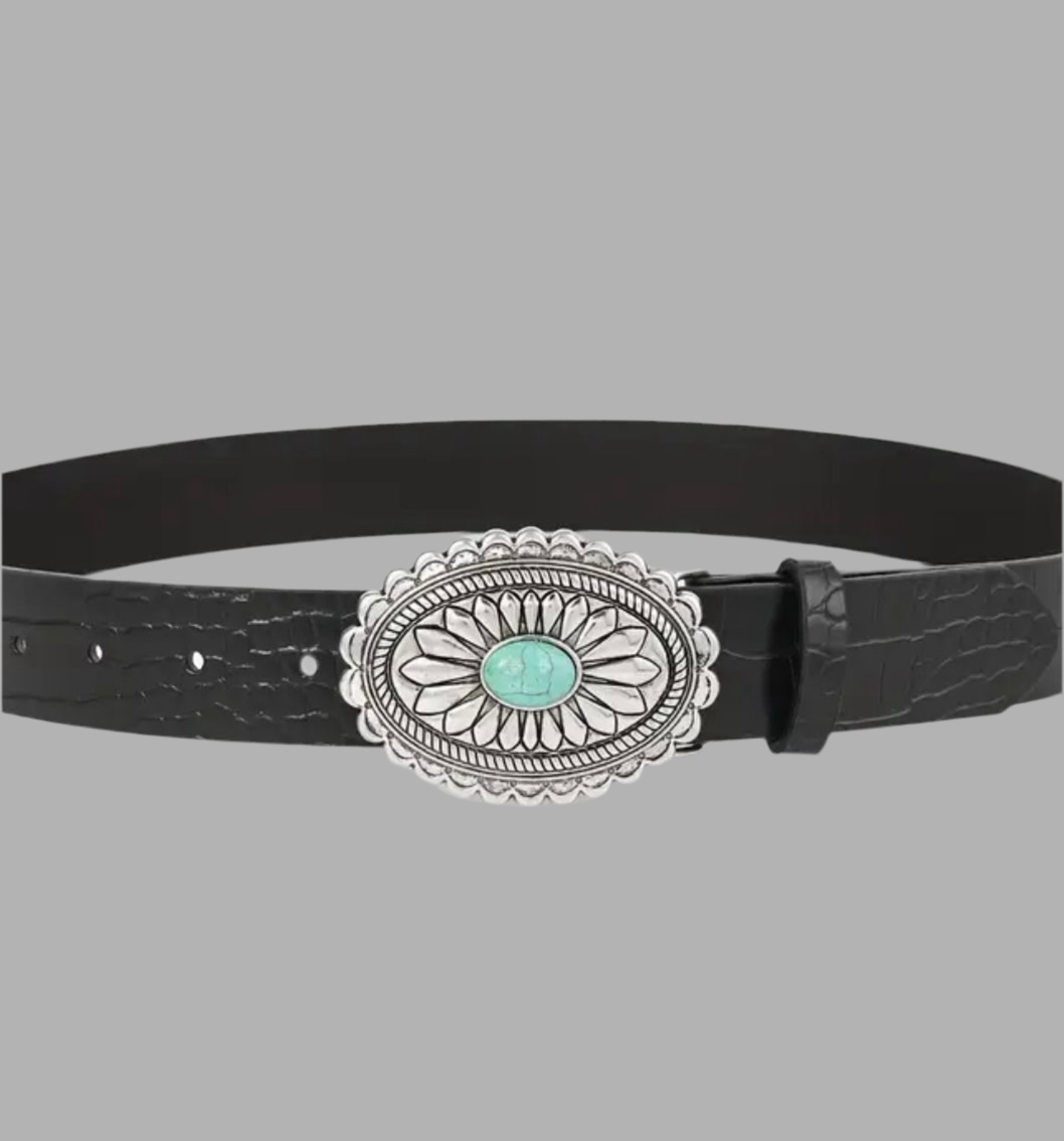 Cinturón negro de eco piel con hebilla plateada y piedra turquesa! Un cinturón precioso que te combinará con todos tus looks más Bohochic! Talla única 120cm