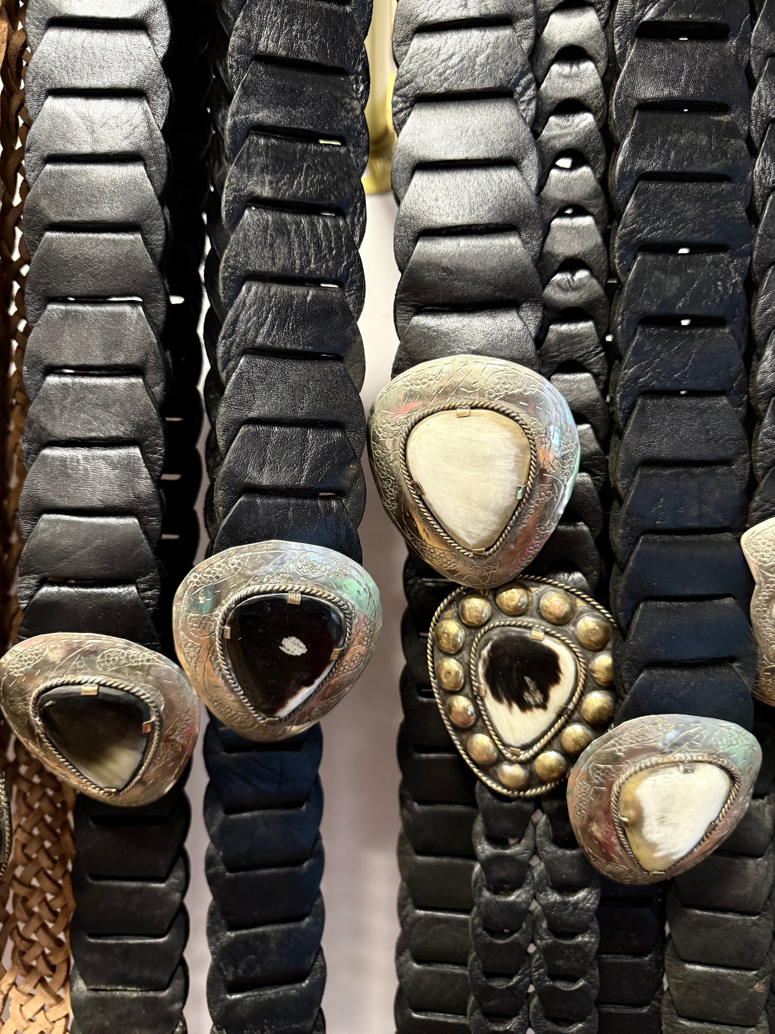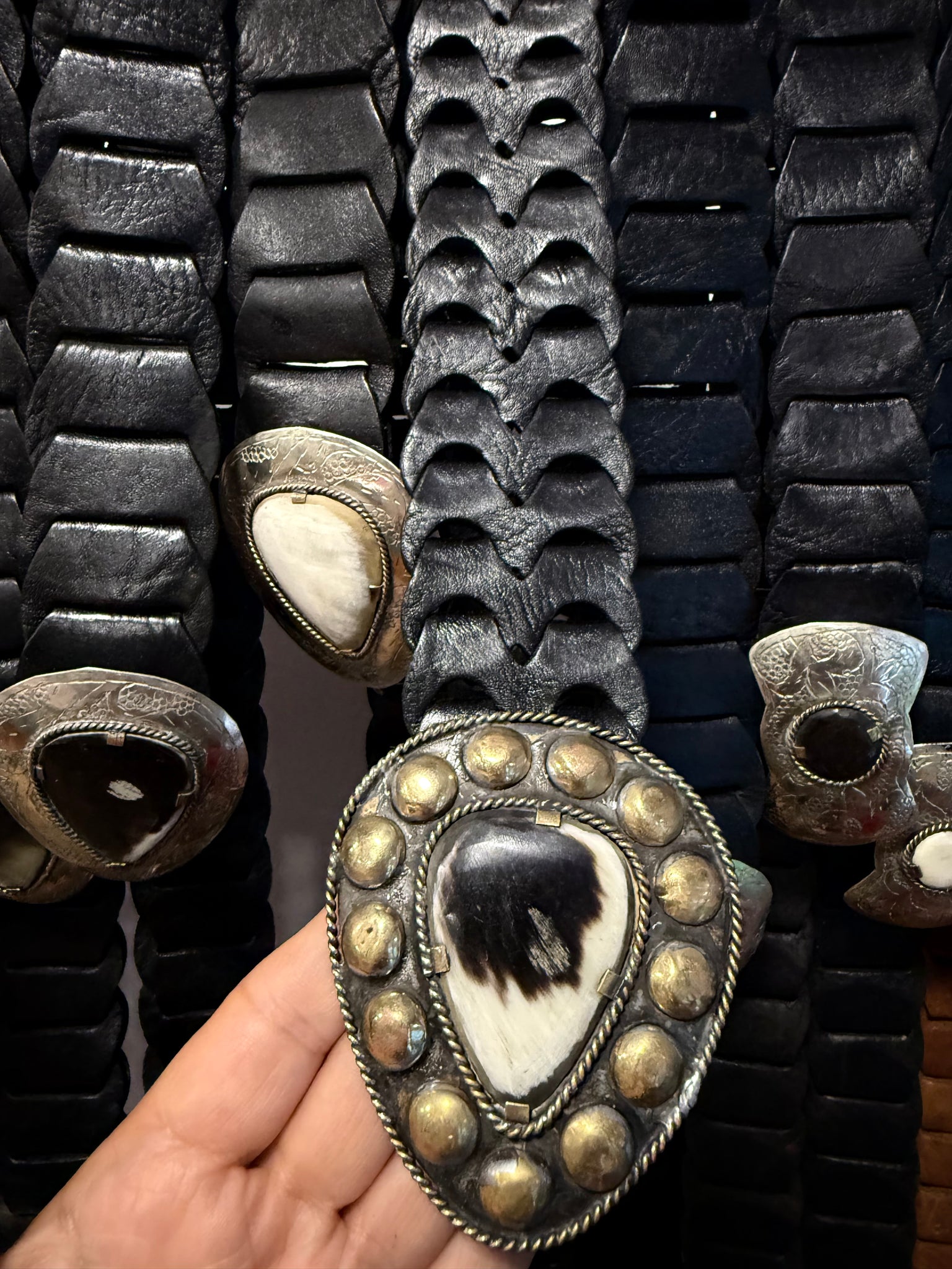cinturón de cuero, auténtico, en color negro con hebilla de latón y piedra de asta. Con un trenzado perfecto adaptable a todas las tallas. Válidos hasta talla 44.