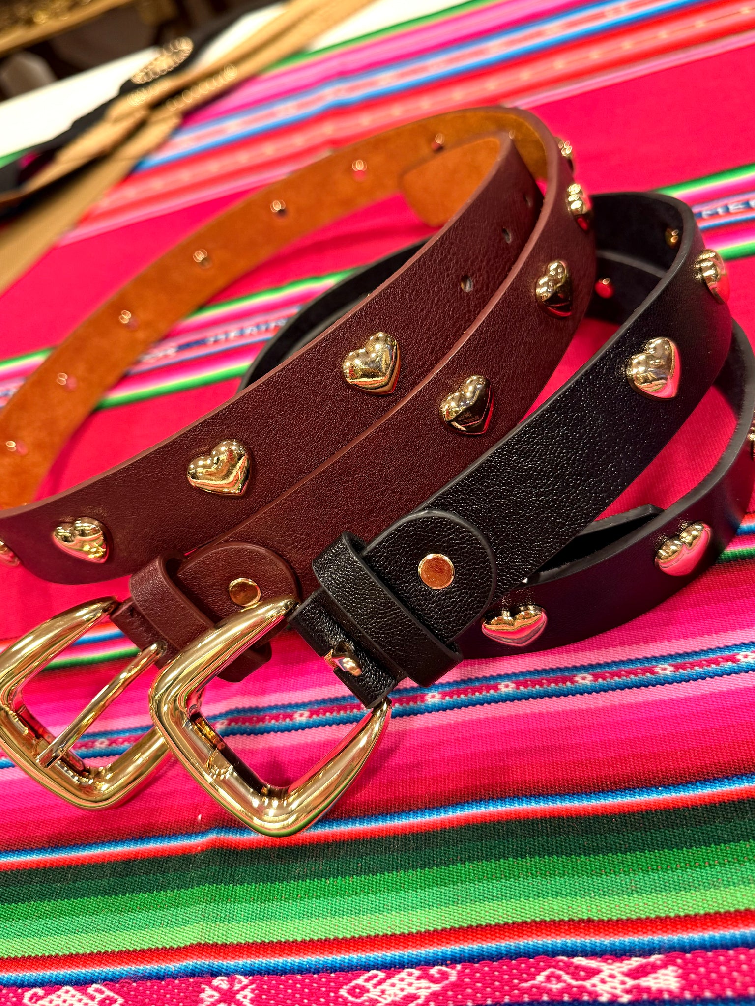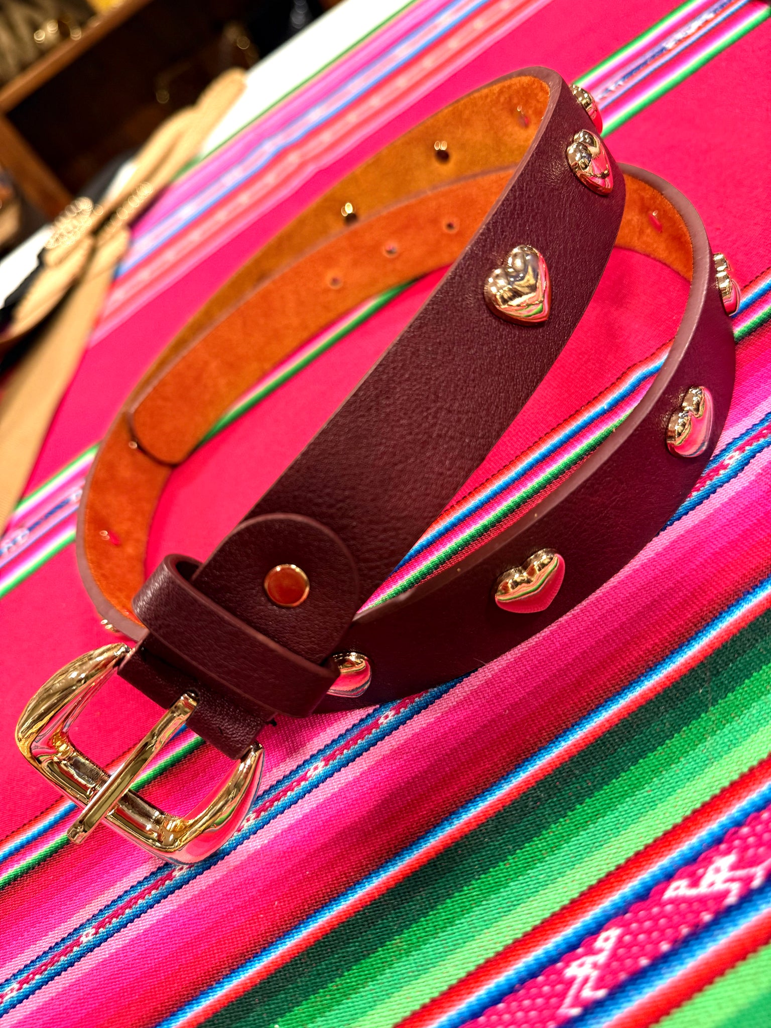 Cinturón estrecho de eco piel excepcional Con corazones en dorado y hebilla grande dorada también. Súper bonito y elegante, Te dará un toque muy especial a tu look. Dos colores negro y granate.