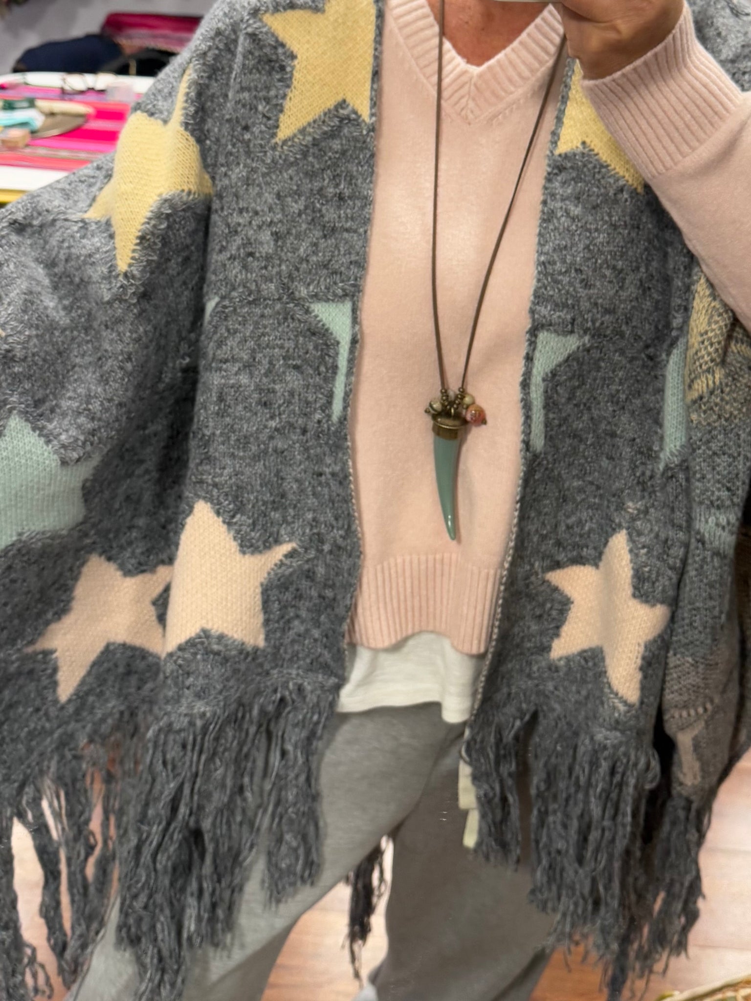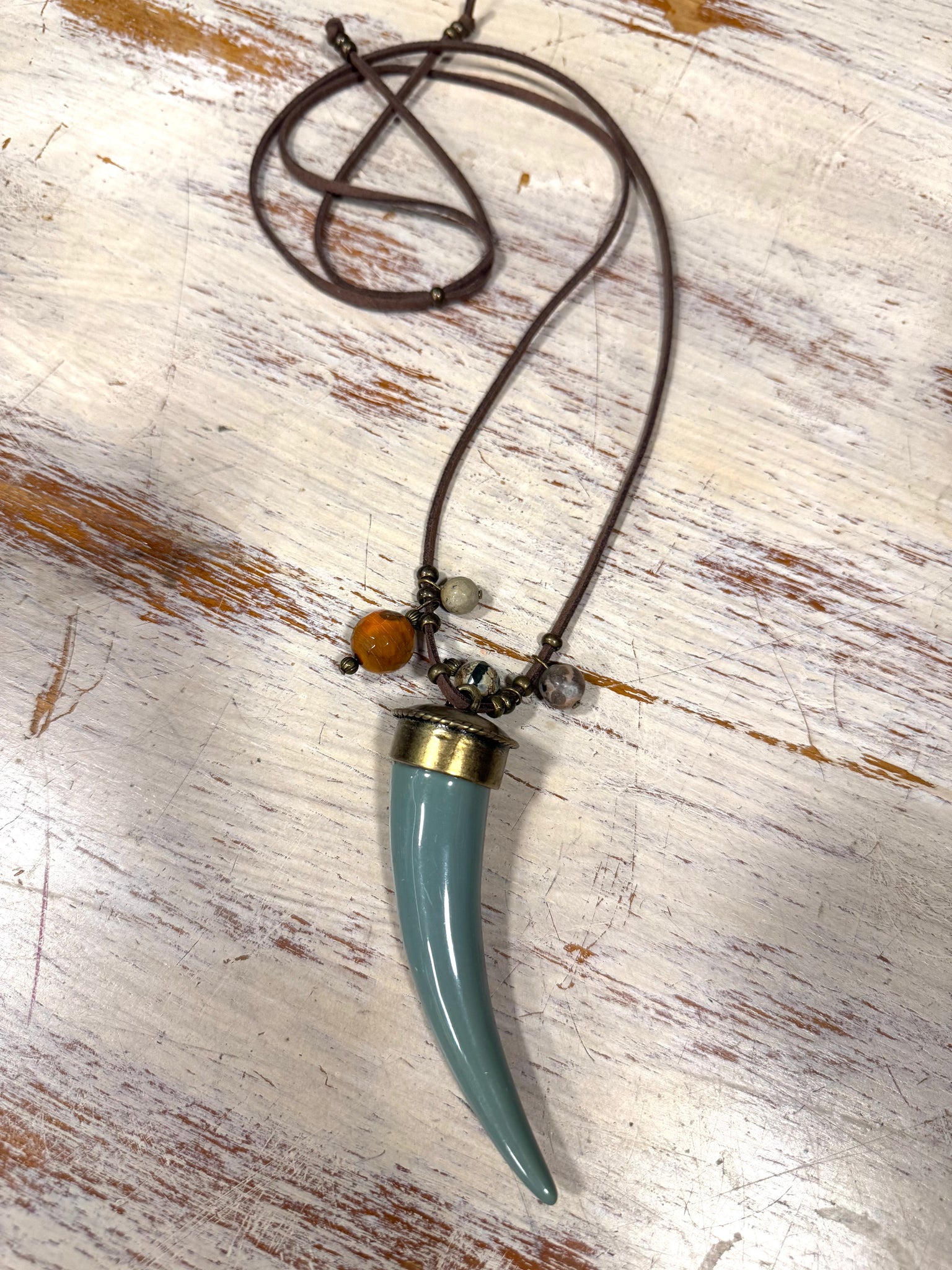 Collar largo con cinta de cuero ajustable y cuerno de resinas en color azul con abalorios. Un collar perfecto que te dará un toque de color a tus looks.