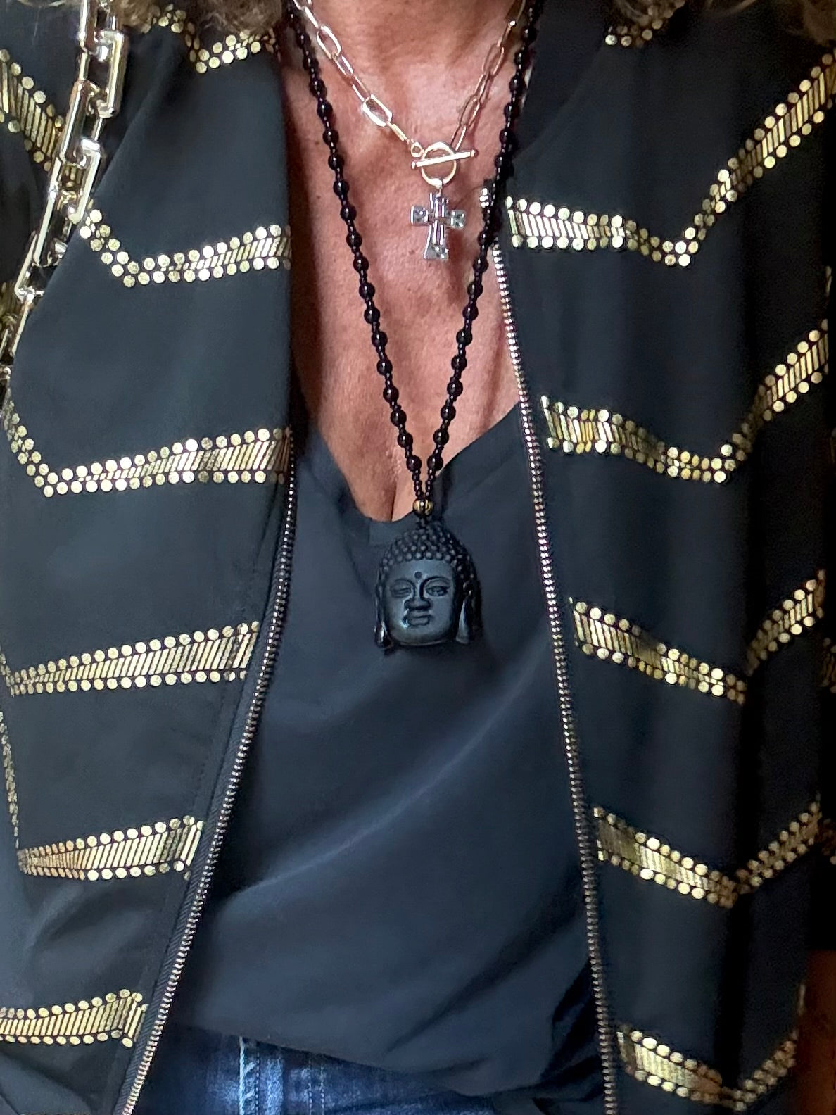 Collar largo de resinas en color negro con cabeza de budda! Un collar muy especial y místico.