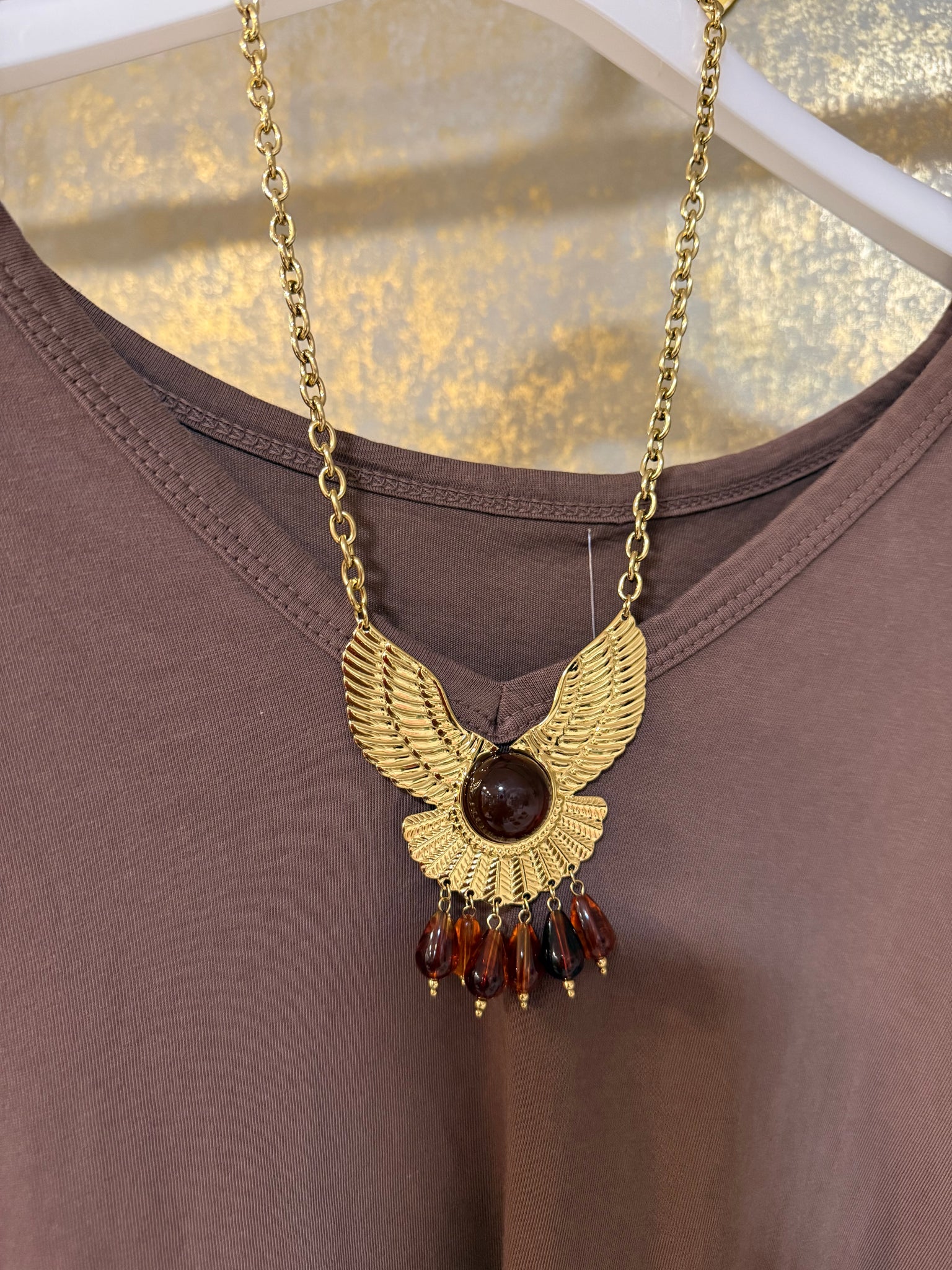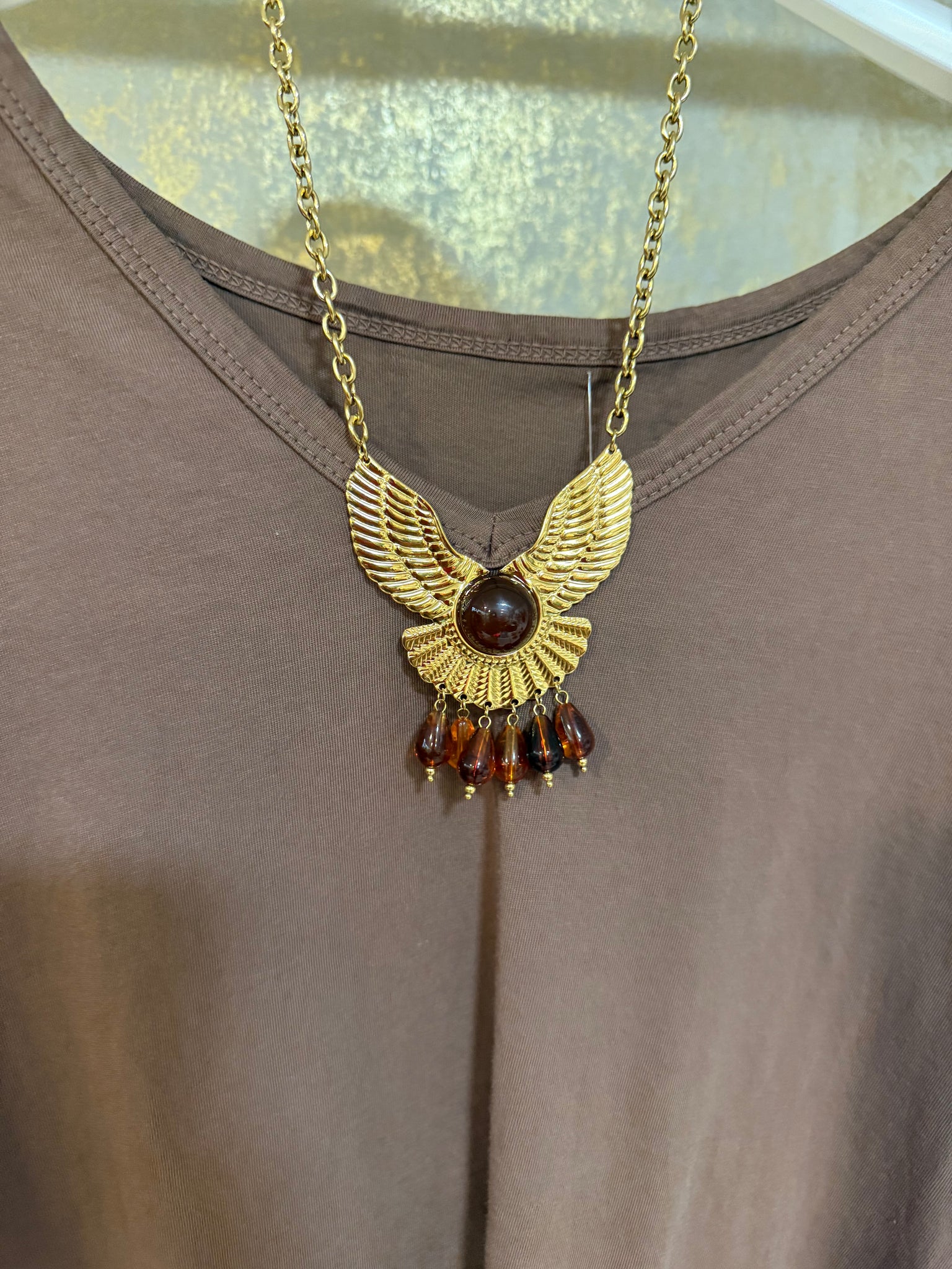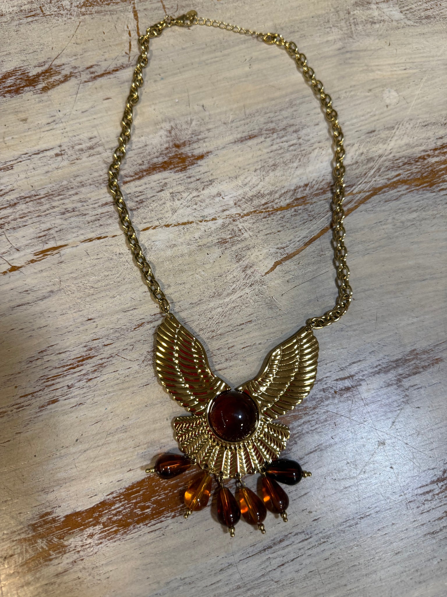 Collar de acero dorado con cadena y ave fénix con piedras en ámbar de resinas! Un collar que será el protagonista de tu outfit!
