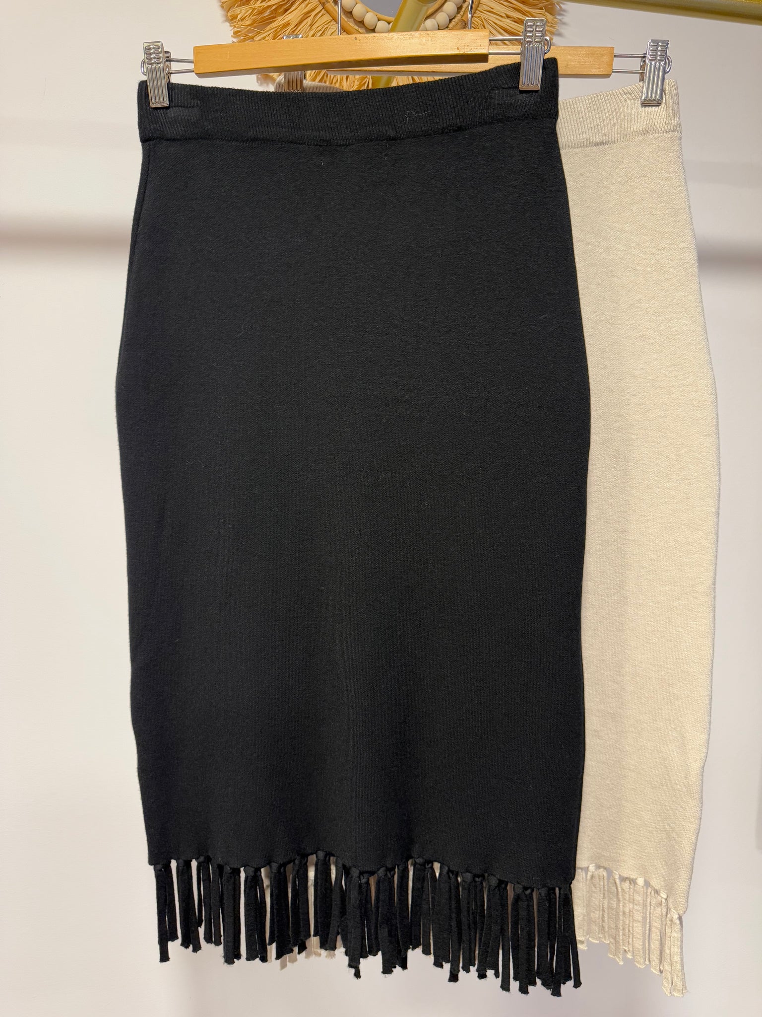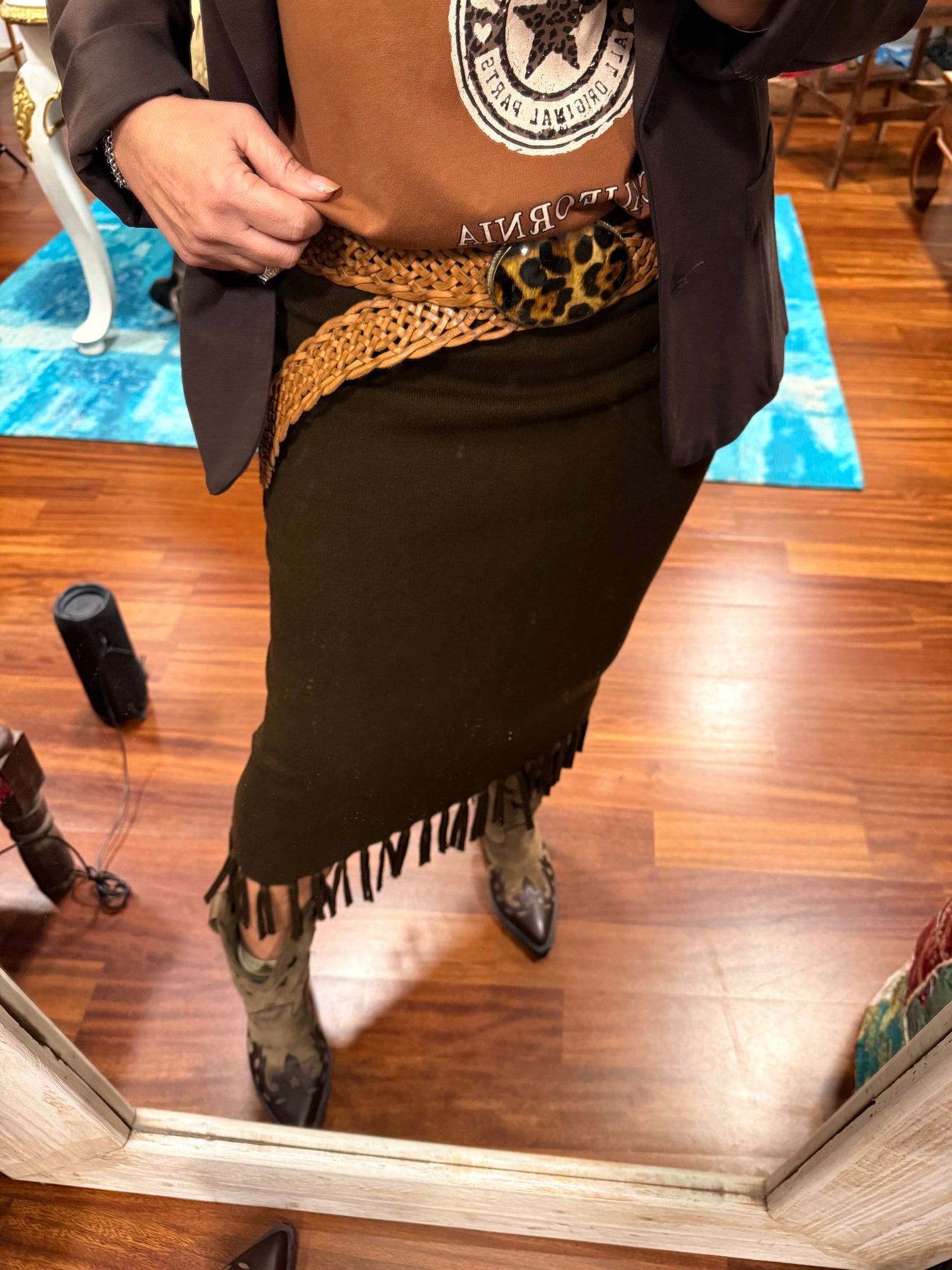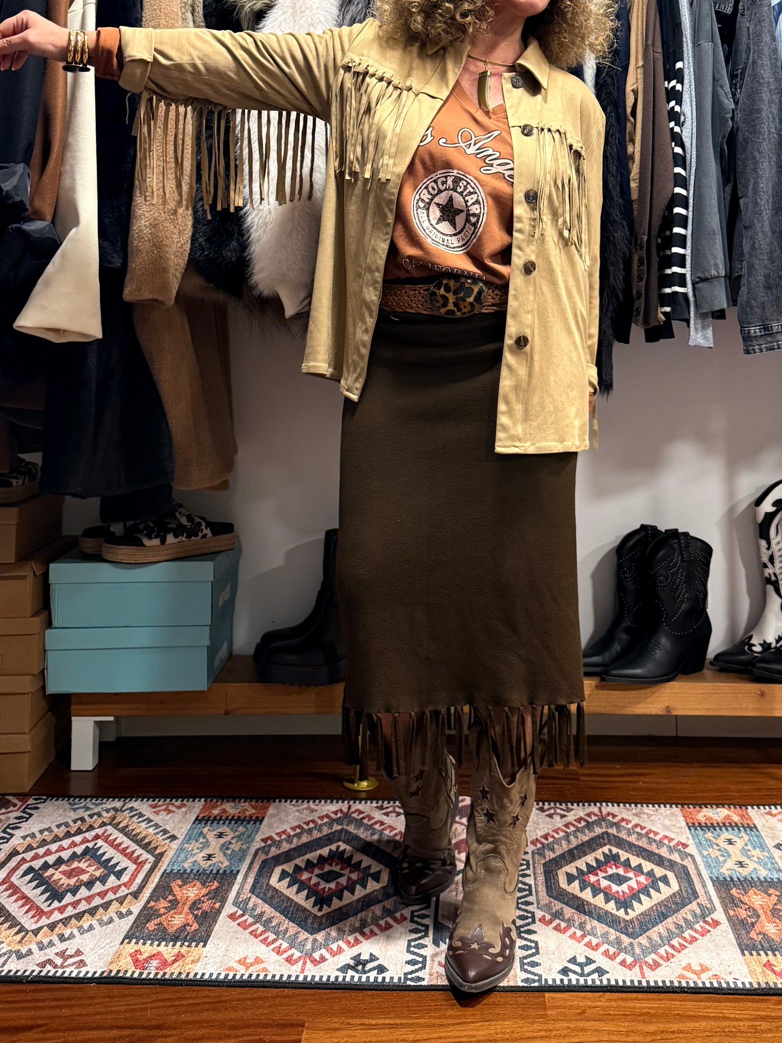 Falda de punto excepcional muy elástico , con corte recto, goma en la cintura y flecos abajo, dándole un toque muy boho y especial. Talla única válida hasta talla 42 se adapta muy bien a varias tallas.
