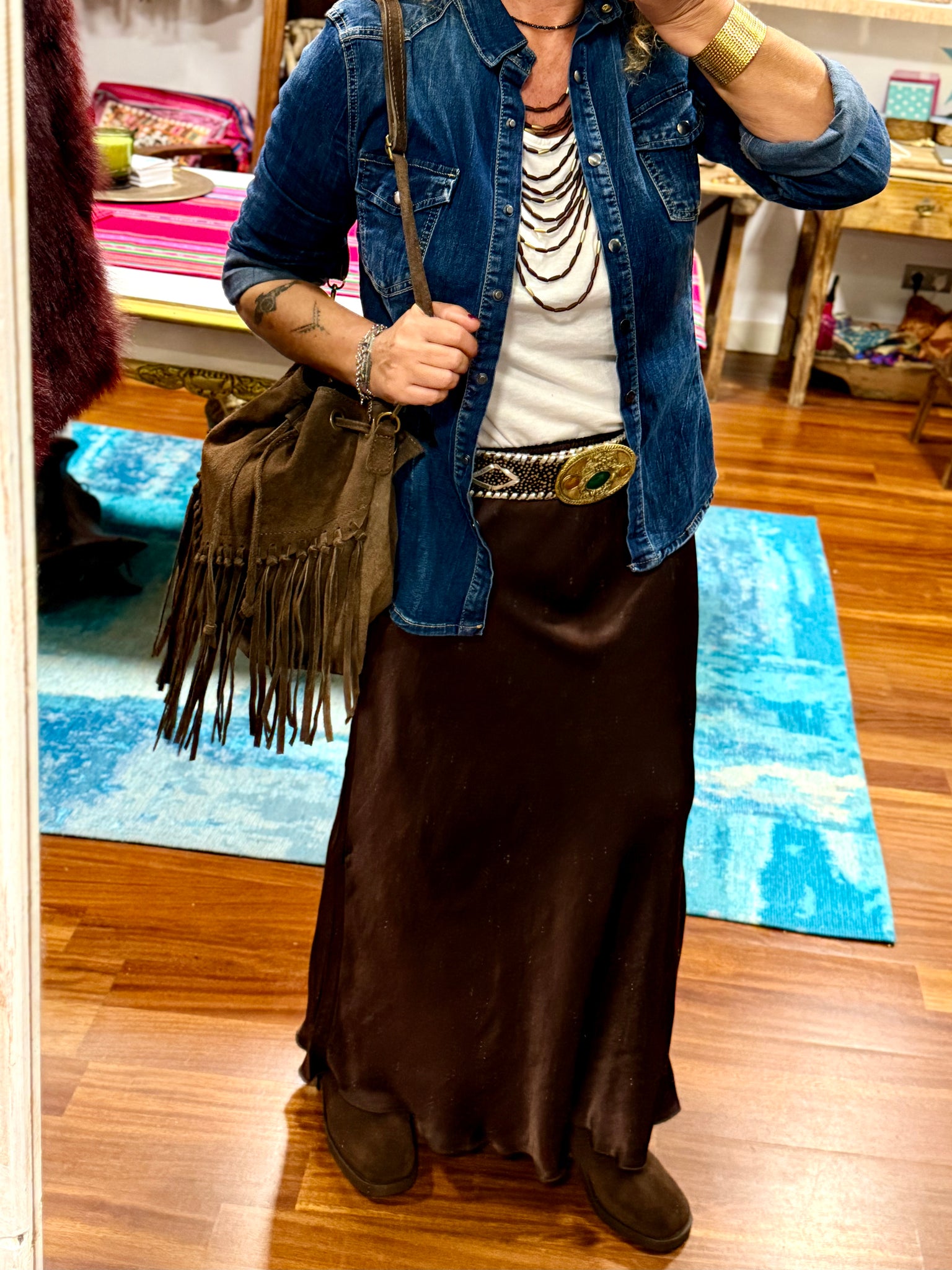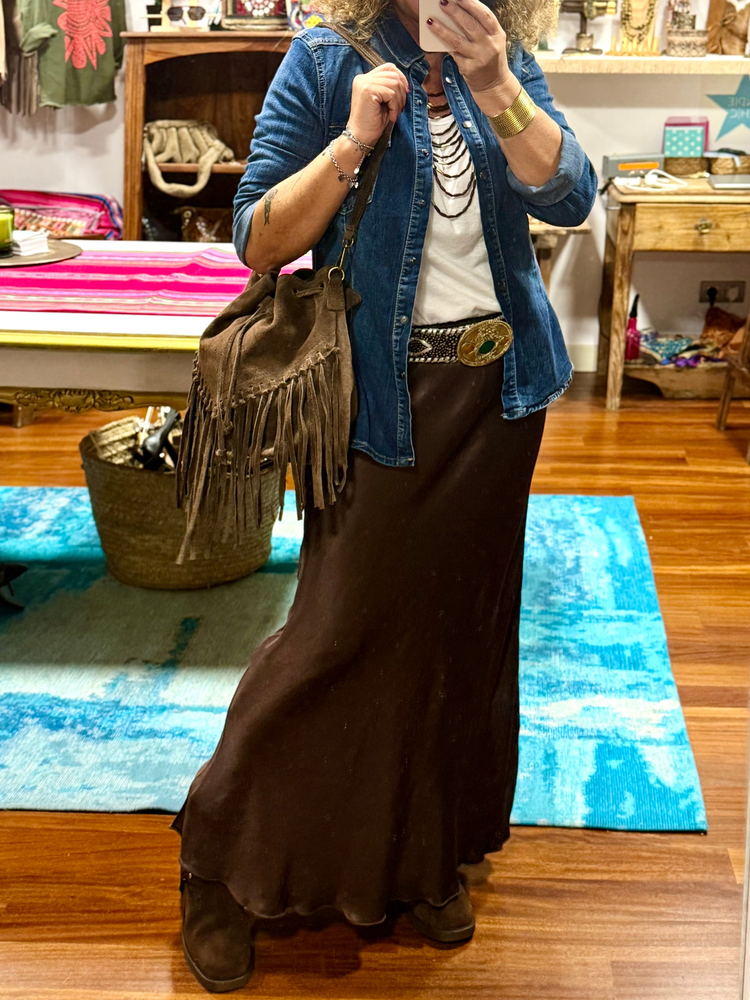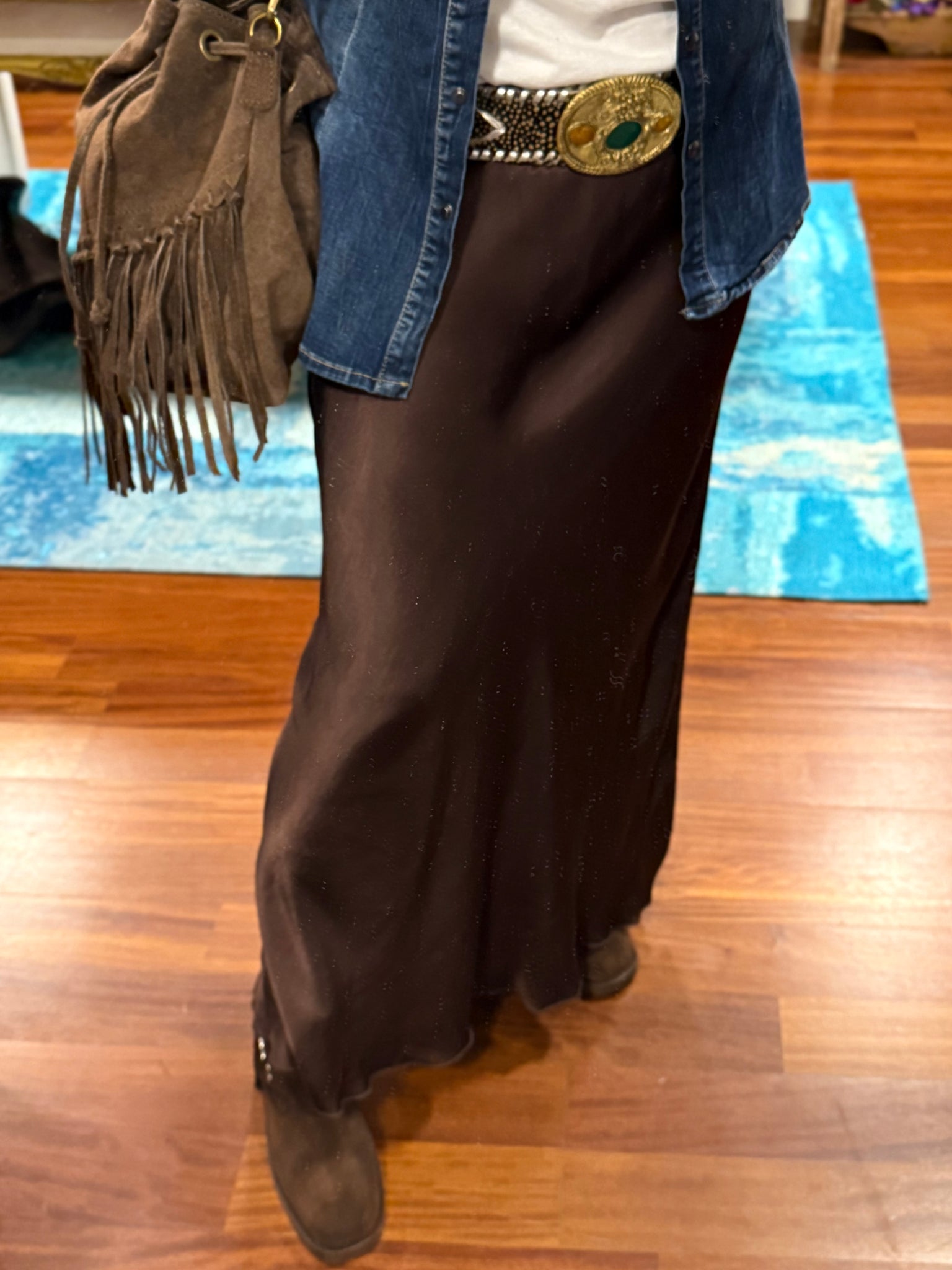Falda larga de color marrón chocolate de viscosa excepcional muy suave y con mucha caída, con corte recto, tiene goma en la cintura ajustable a varias tallas! Válida hasta talla 42