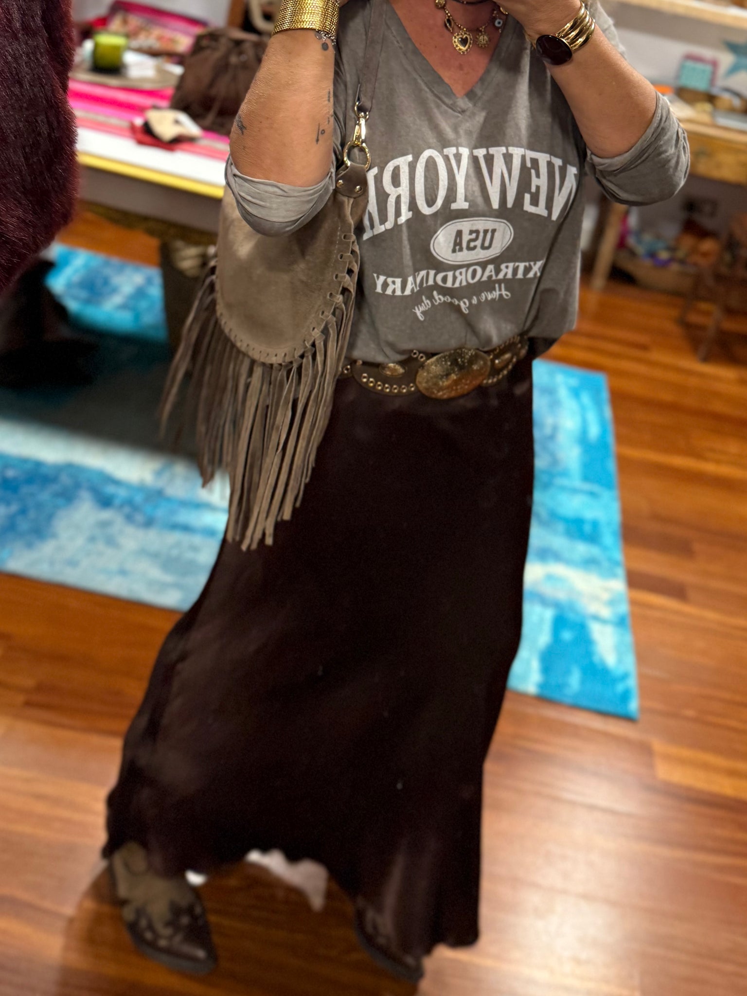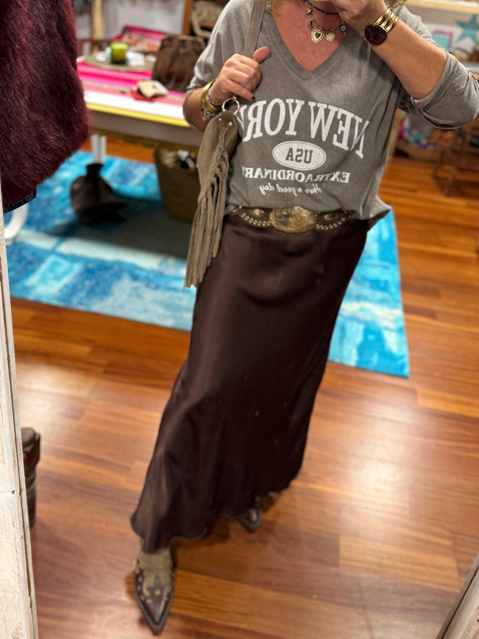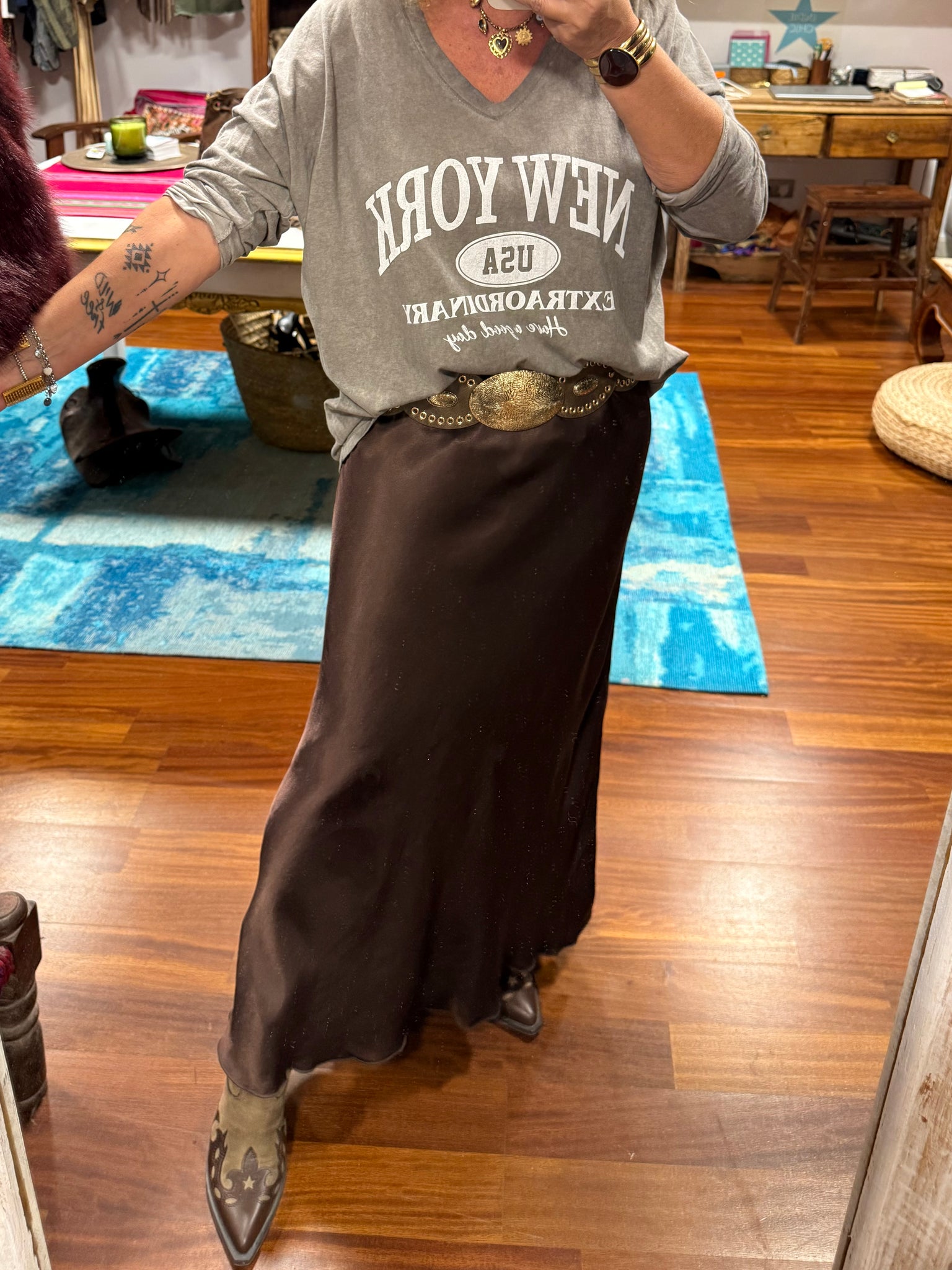 Falda larga de color marrón chocolate de viscosa excepcional muy suave y con mucha caída, con corte recto, tiene goma en la cintura ajustable a varias tallas! Válida hasta talla 42