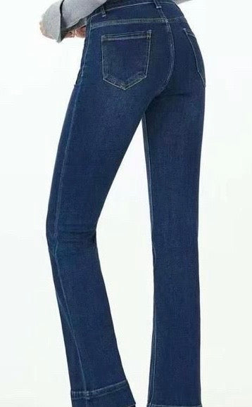 Pantalón tejano elástico súper cómodo! De campana y pierna recta largo, con bolsillos codeados exteriores! Un patrón muy favorecedor y tendencia! Un jean que sienta súper bien y te dará muchísimas opciones ara tus outfits!