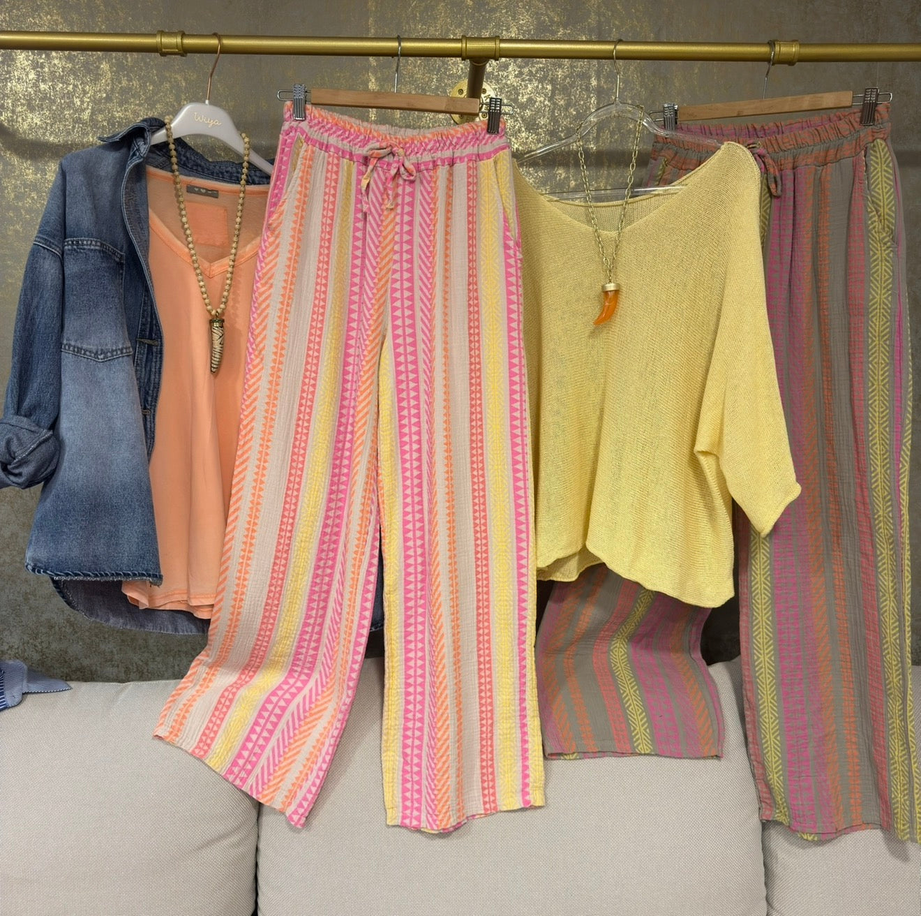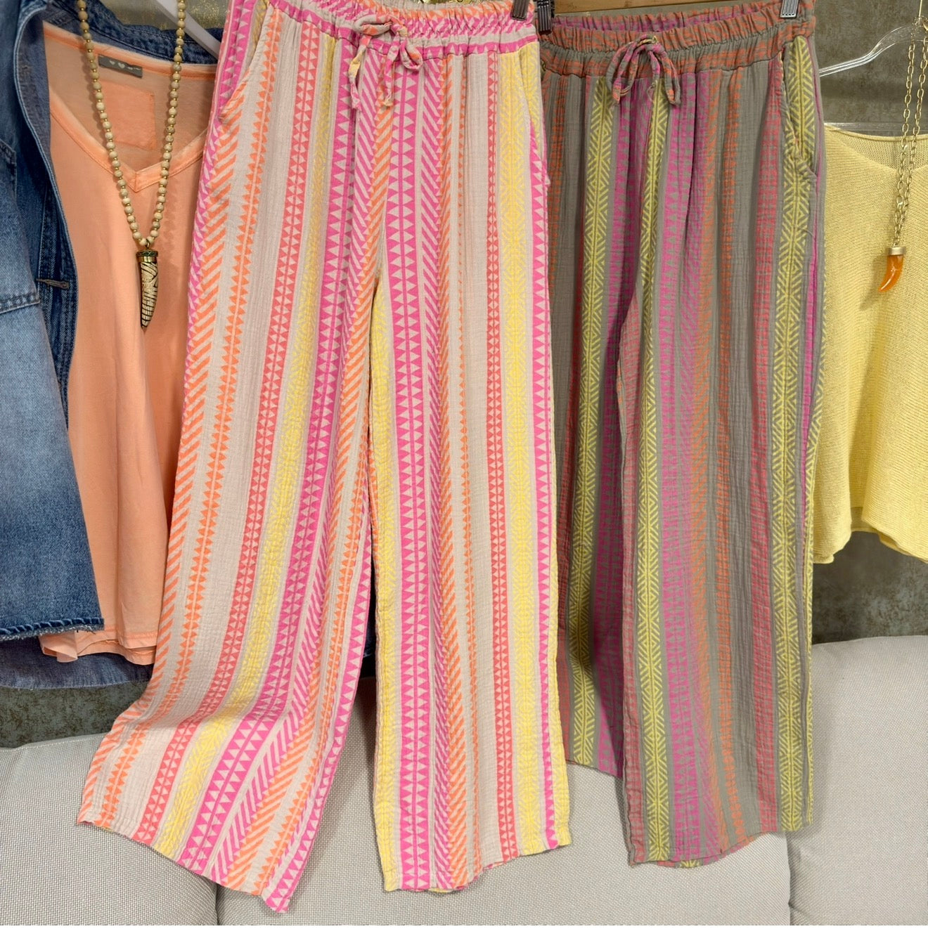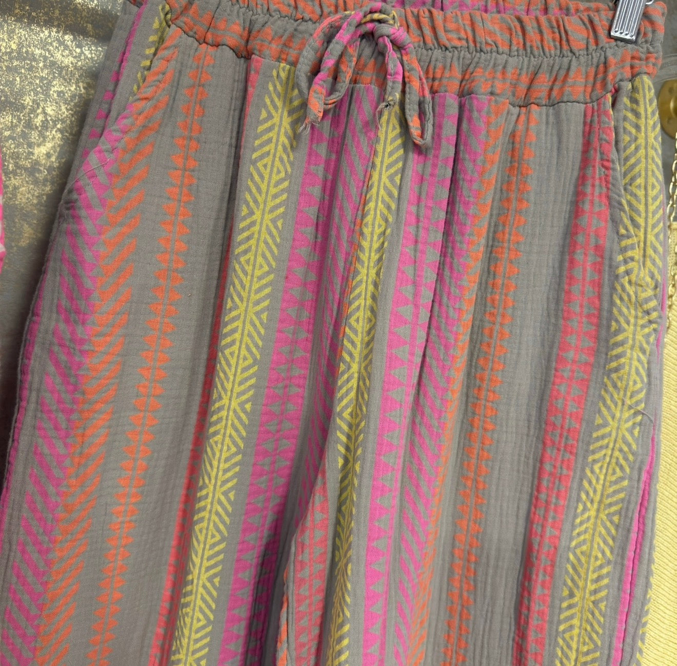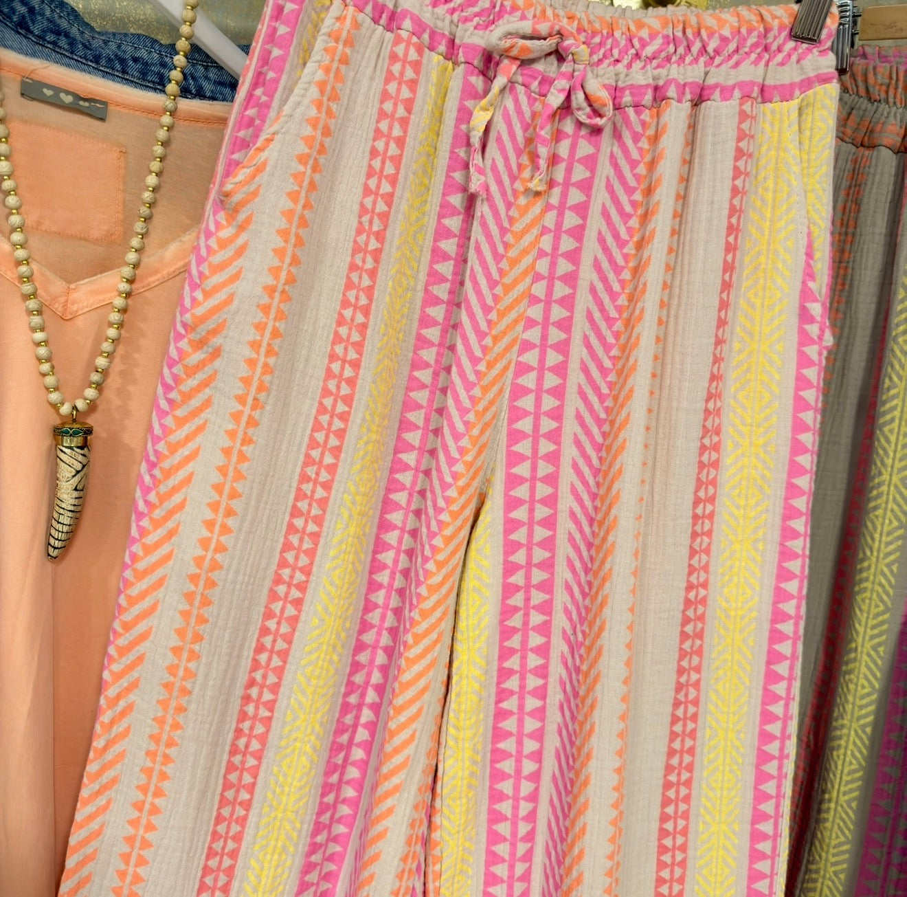 Pantalón recto de bambula de algodón con goma en la cintura y bolsillos con un estampado étnico en colores vibrantes precioso!! un pantalón muy boho chic que te dará un aire muy veraniego! Talla única 60cm de cadera y 100 cm de largo .