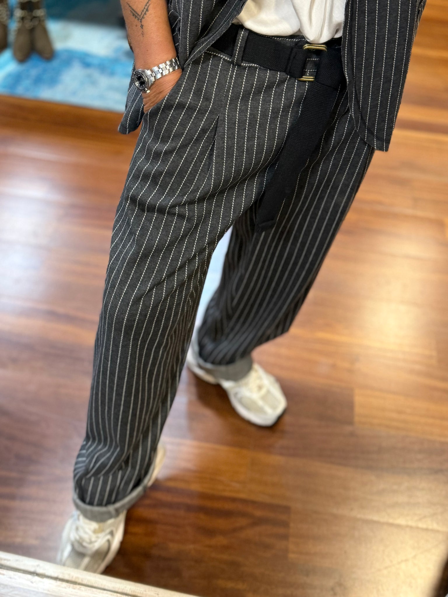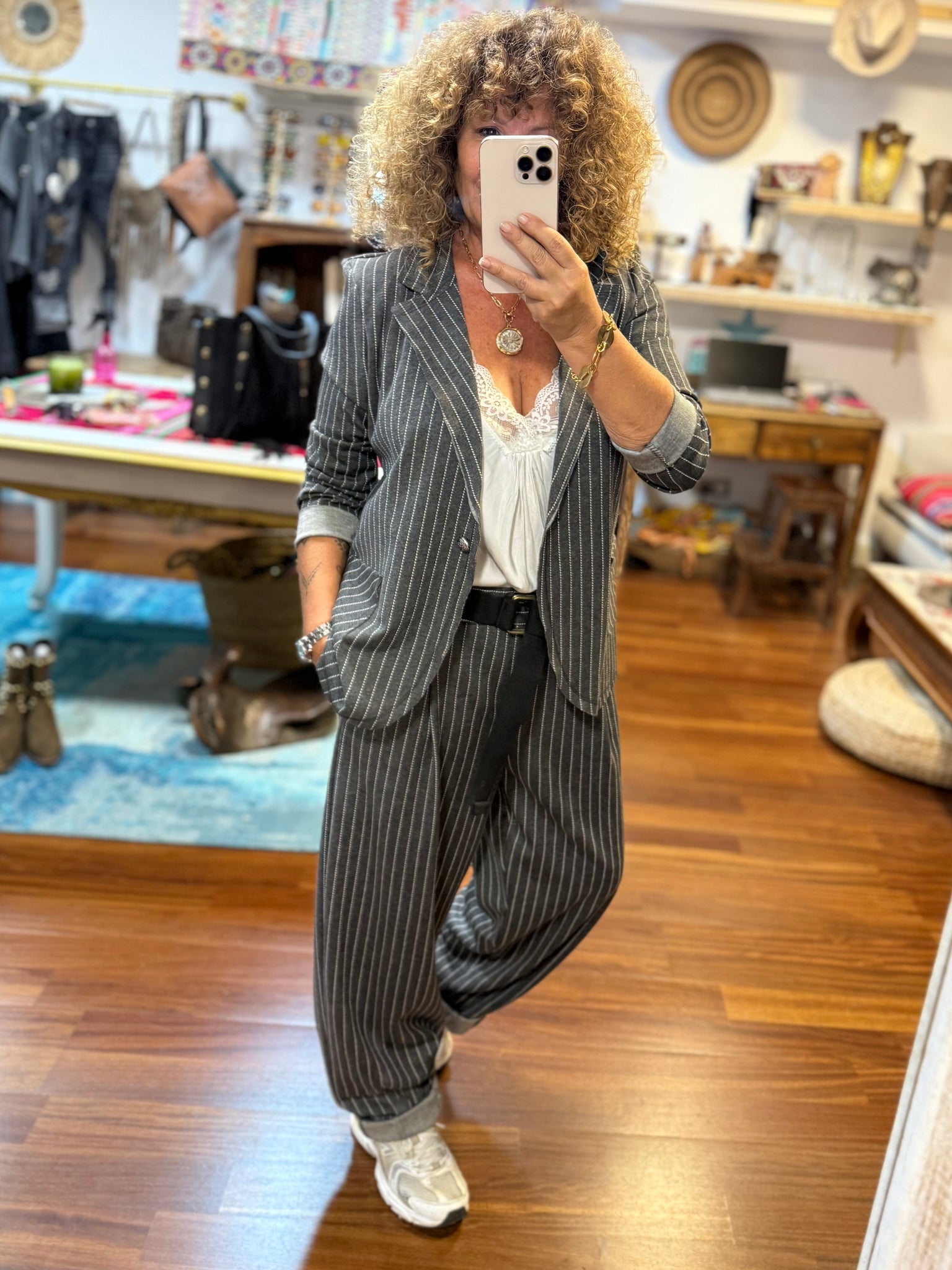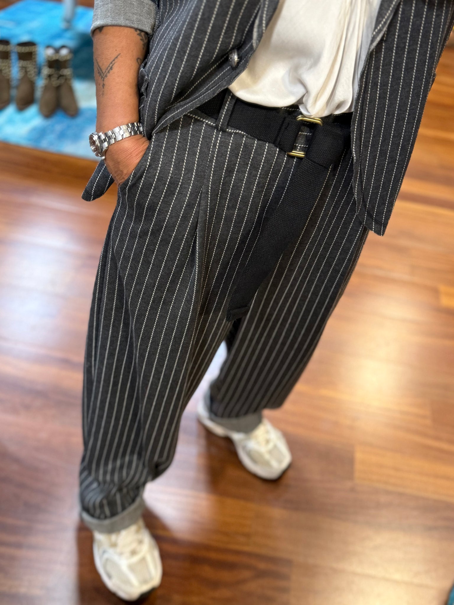 Pantalón de Viscosa/poliester y Elastina excepcional, que tienen un efecto como de punto, con un patrón amplio con pinza grande, dándole un súper estilo! Con bolsillos y goma ancha en la cintura para adaptarse muy bien a varias tallas! Válido hasta talla 42. También opción de coger el blazer a juego por separado y hacerte un súper traje muy cómodo y chic!