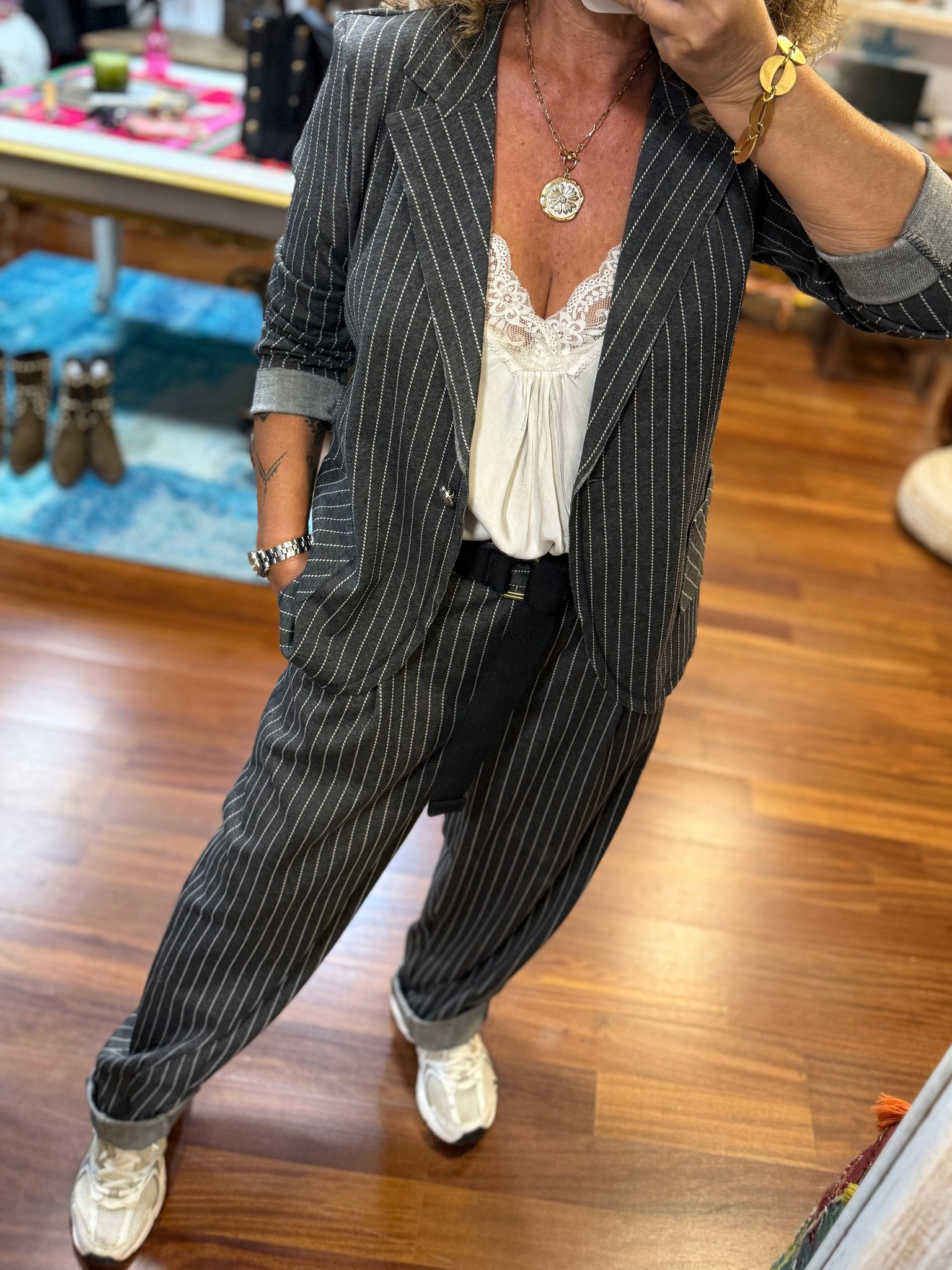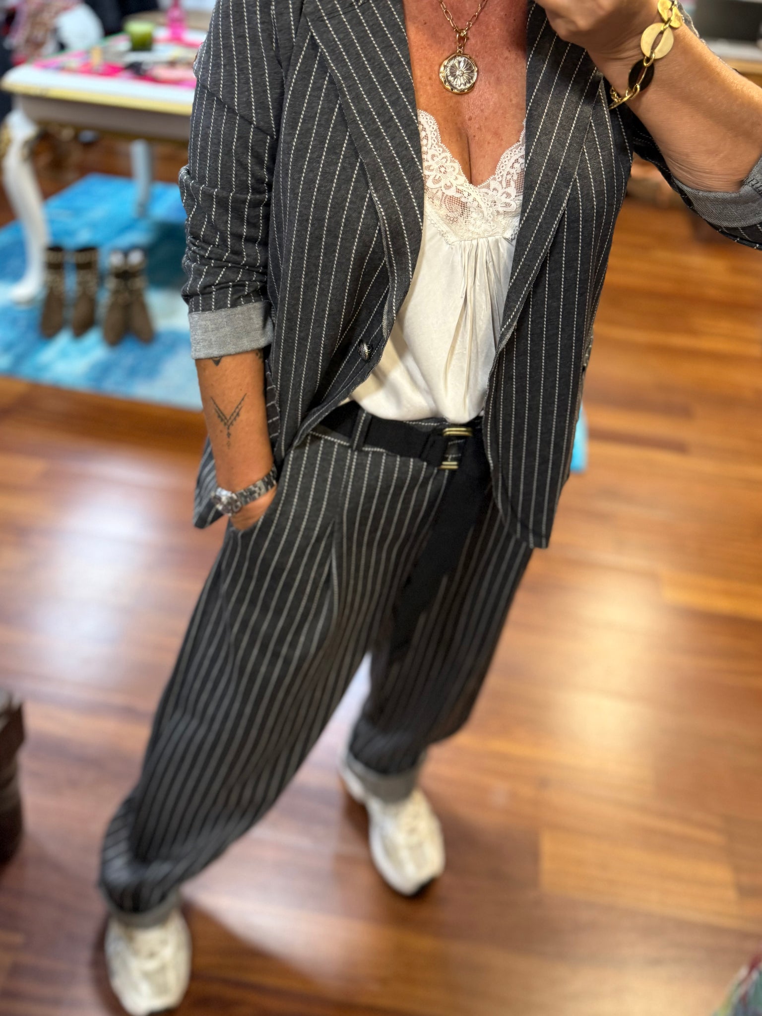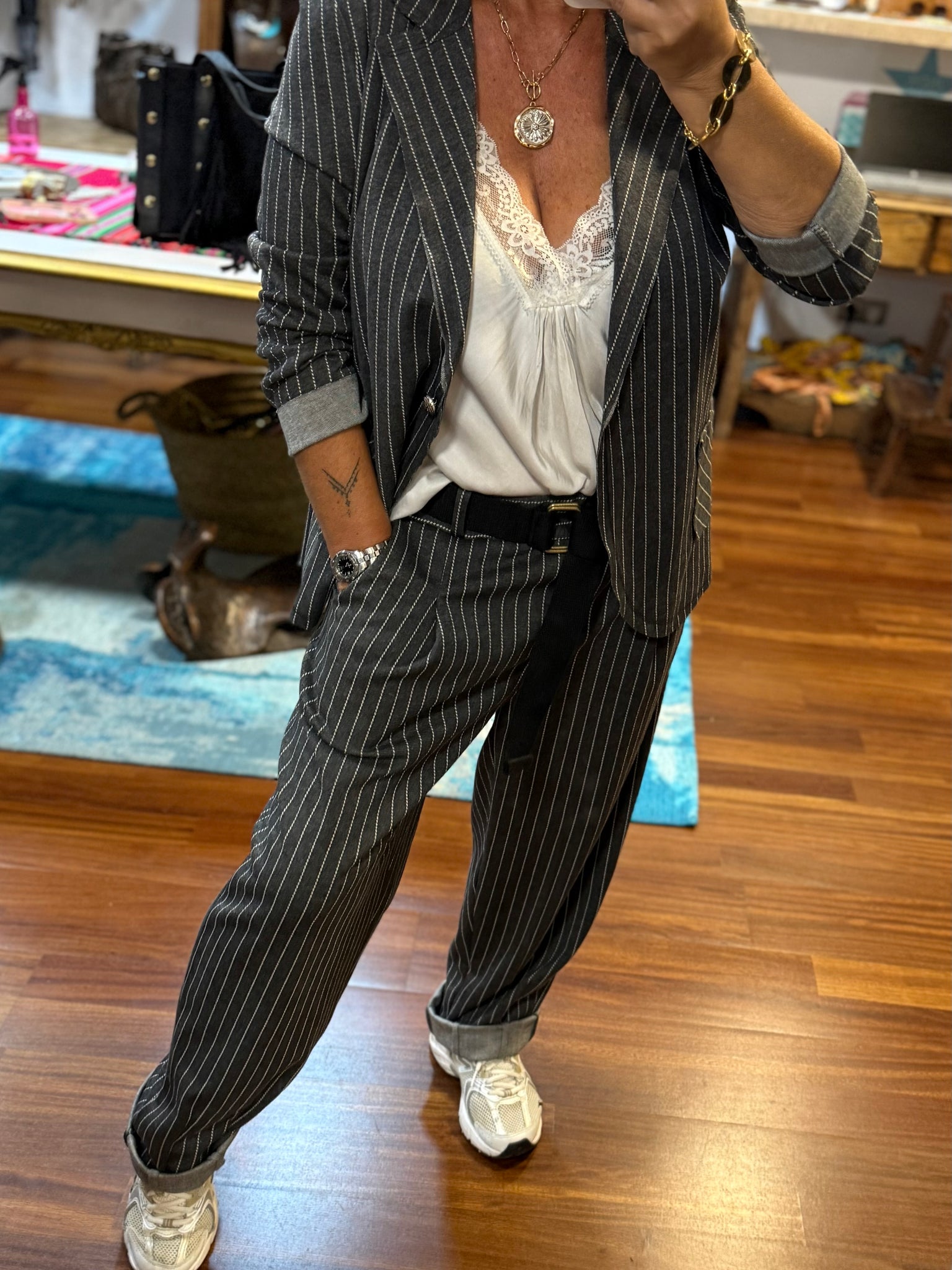 Pantalón de Viscosa/poliester y Elastina excepcional, que tienen un efecto como de punto, con un patrón amplio con pinza grande, dándole un súper estilo! Con bolsillos y goma ancha en la cintura para adaptarse muy bien a varias tallas! Válido hasta talla 42. También opción de coger el blazer a juego por separado y hacerte un súper traje muy cómodo y chic!