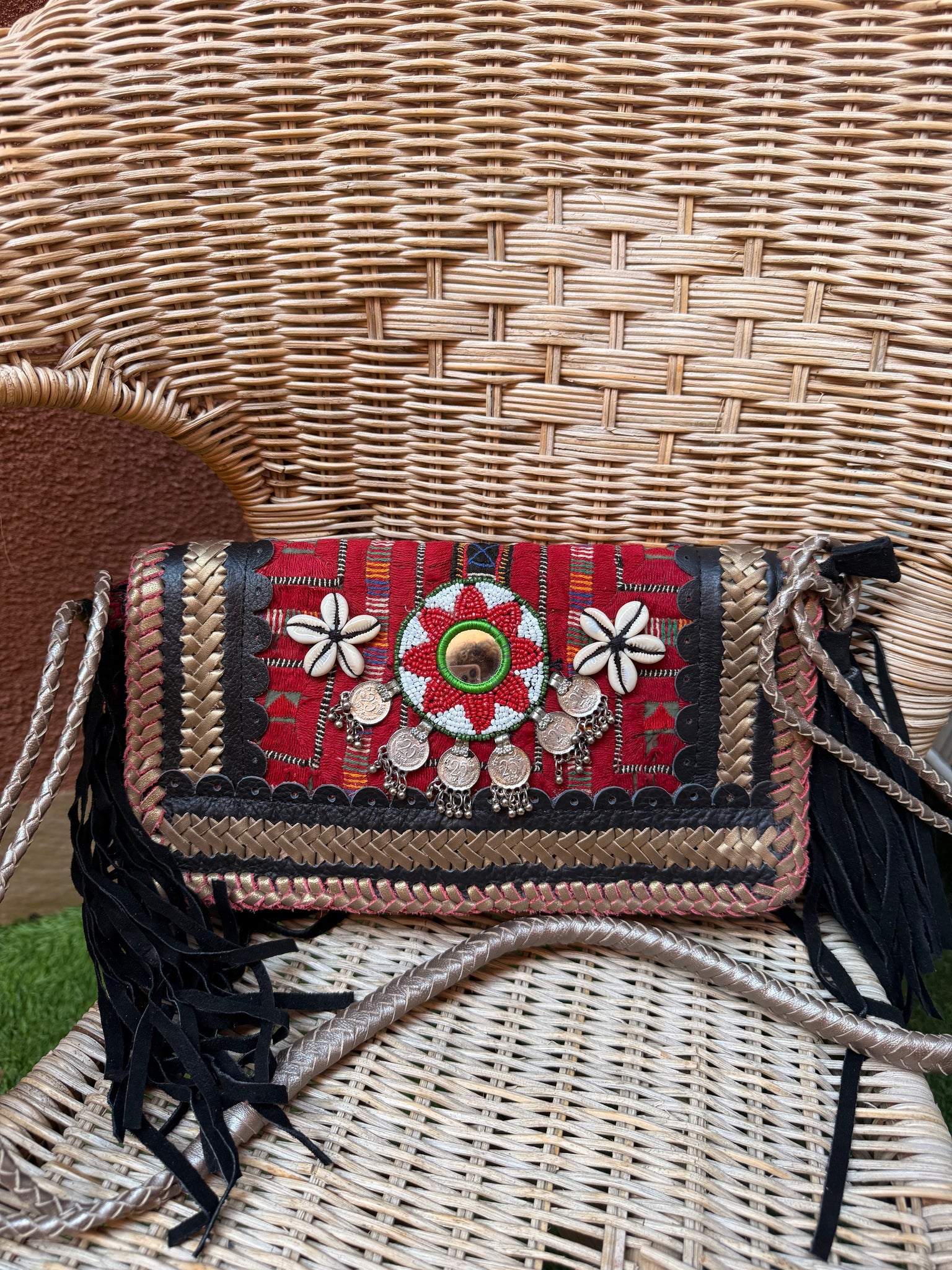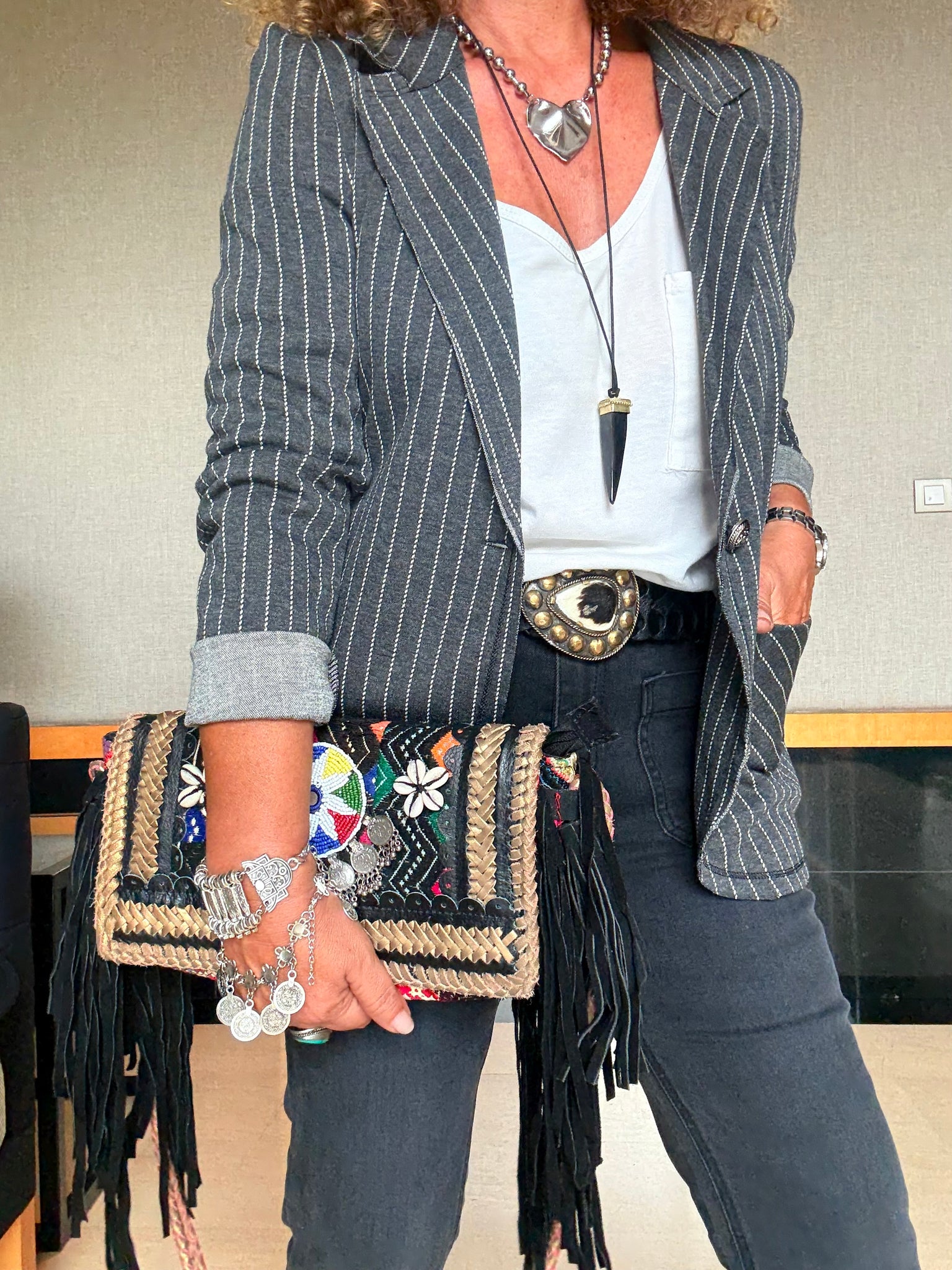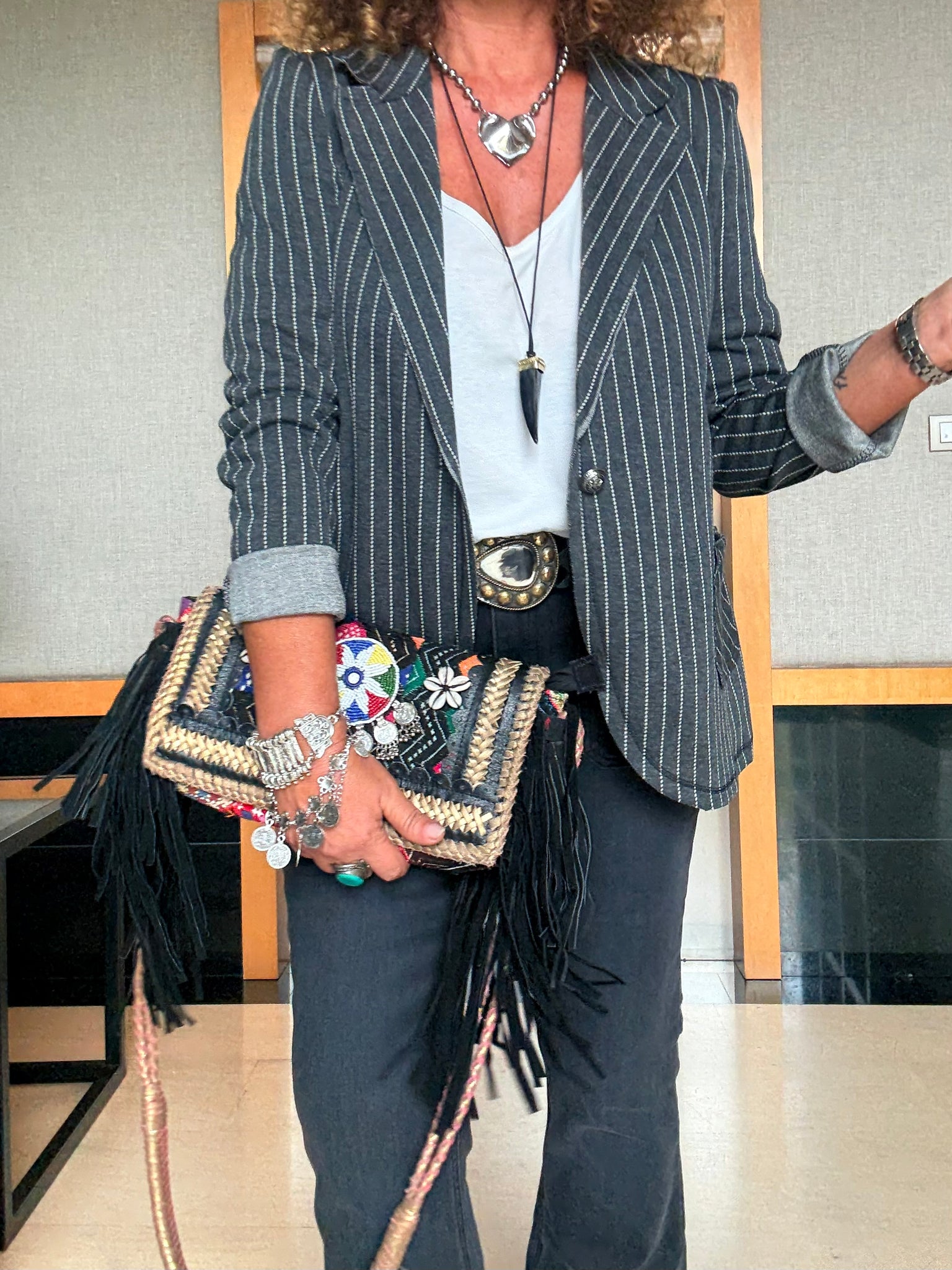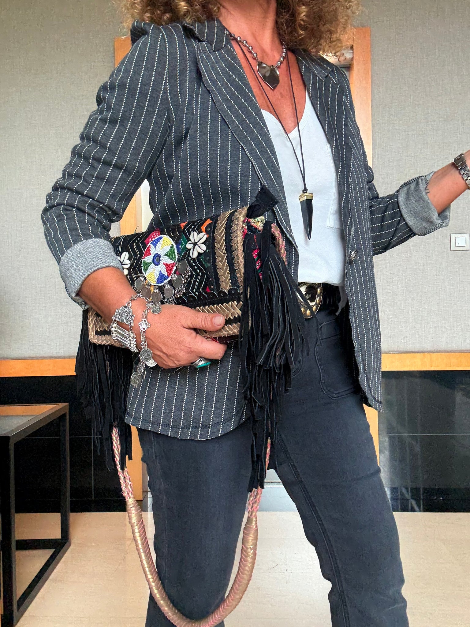 Bolso de piel y ante en color negro con bordados artesanales y flecos! Bolso de India muy boho chic! Será la estrella de tu look!