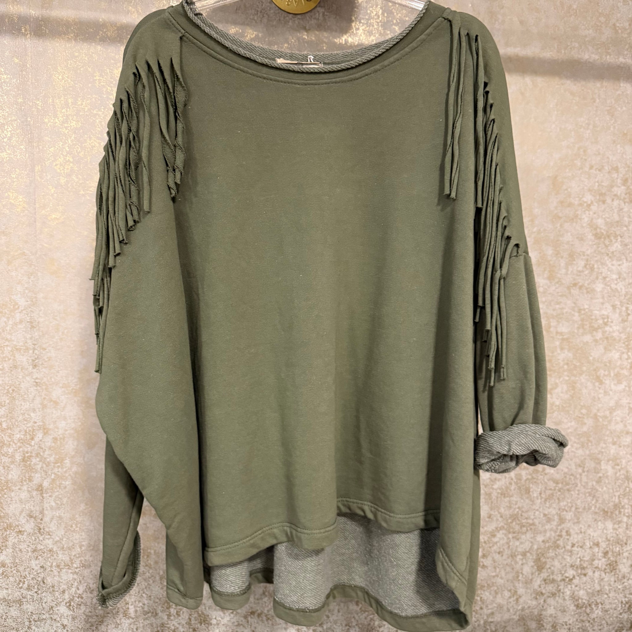 Sudadera de algodón desgastado con flecos en mangas y detrás! Con cuello y bajo sin costuras una sudadera muy Bohochic. Varios colores. Talla única válid hasta talla XL