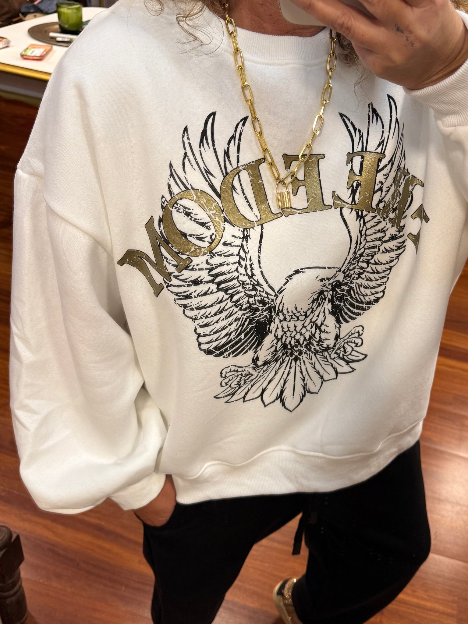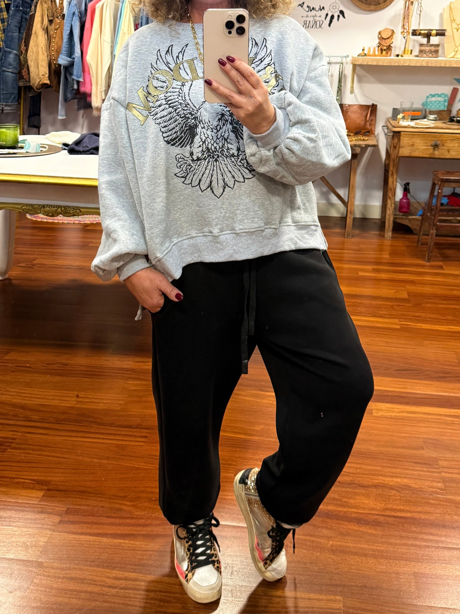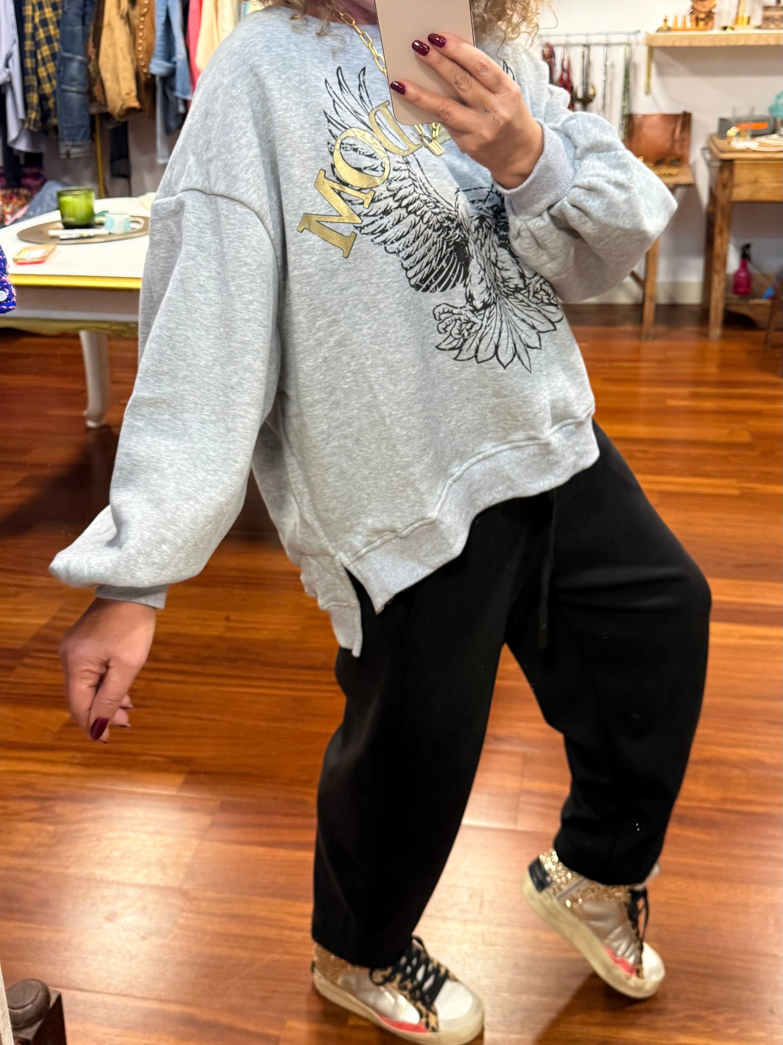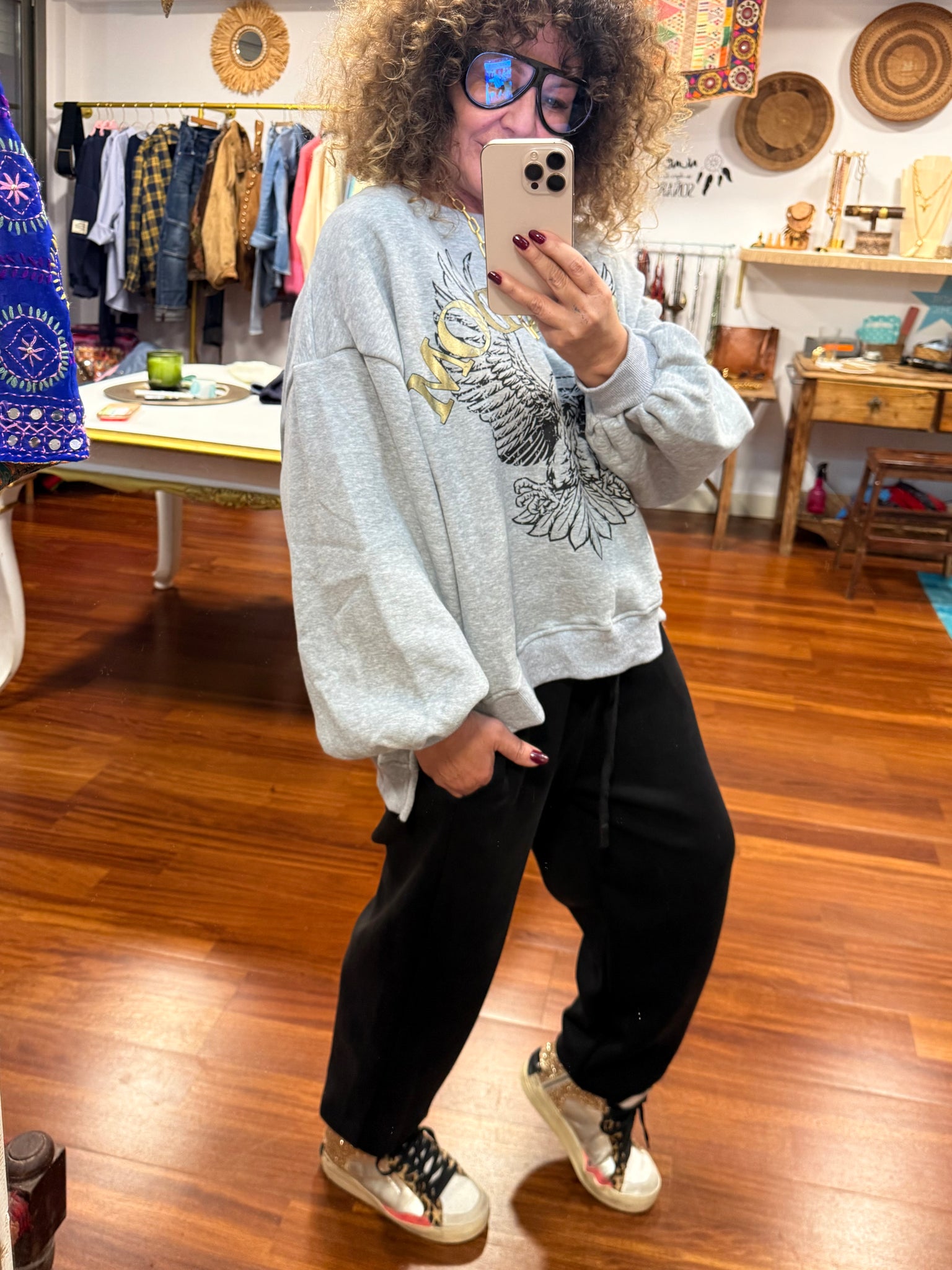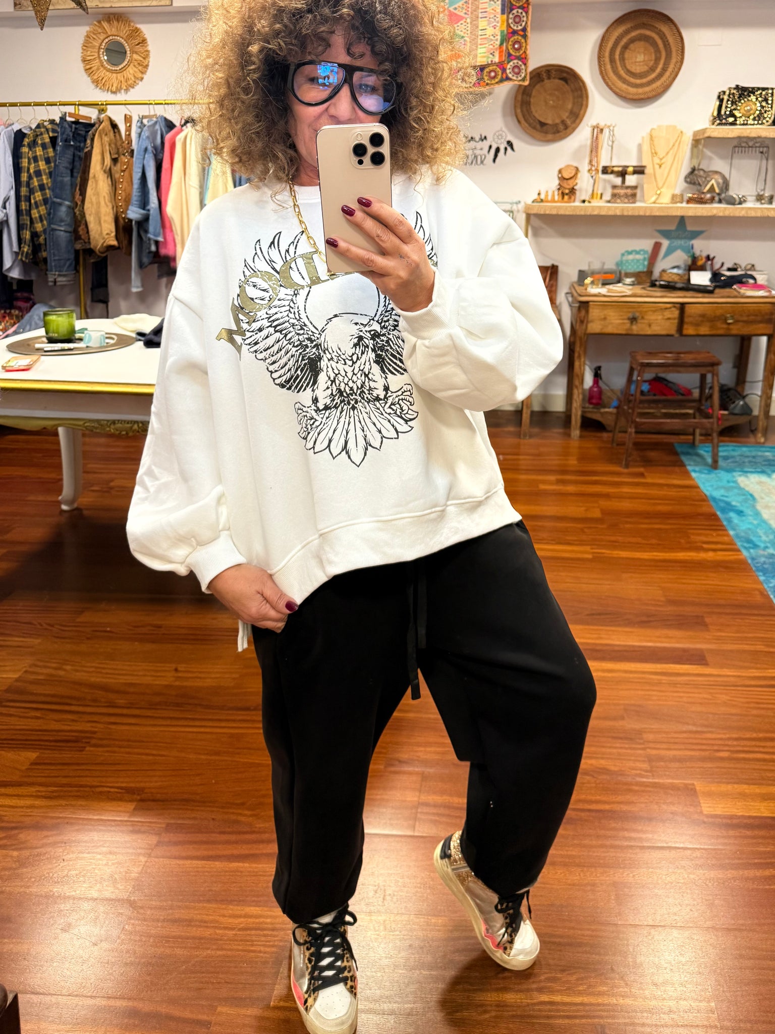 Sudadera con patrón, Oversize de algodón excepcional, un poco afelpada y súper agradable y con puño abajo con obertura lateral tiene logo con letras en oro viejo que la hace Muy chic. Talla única válida hasta talla XXL.