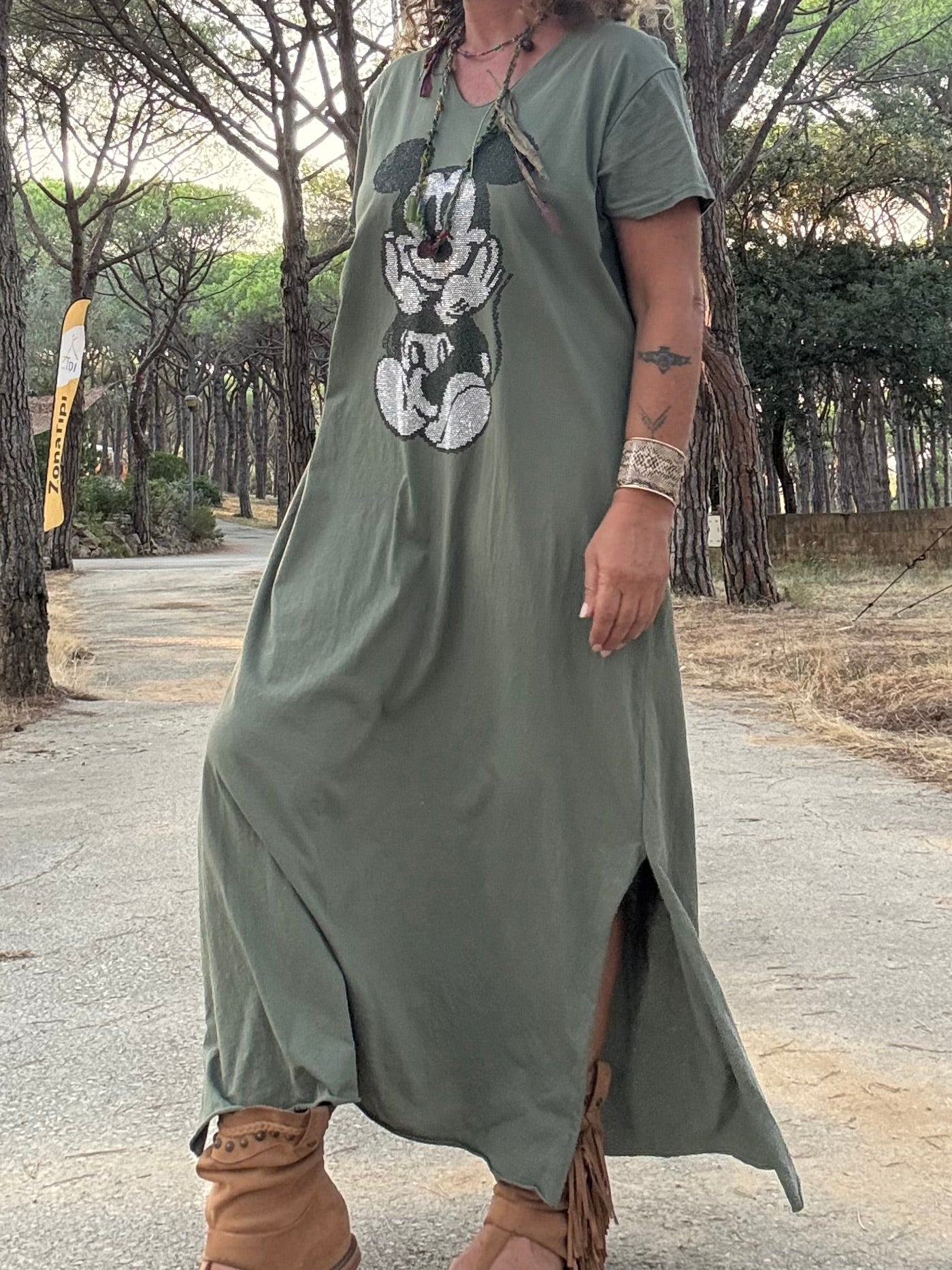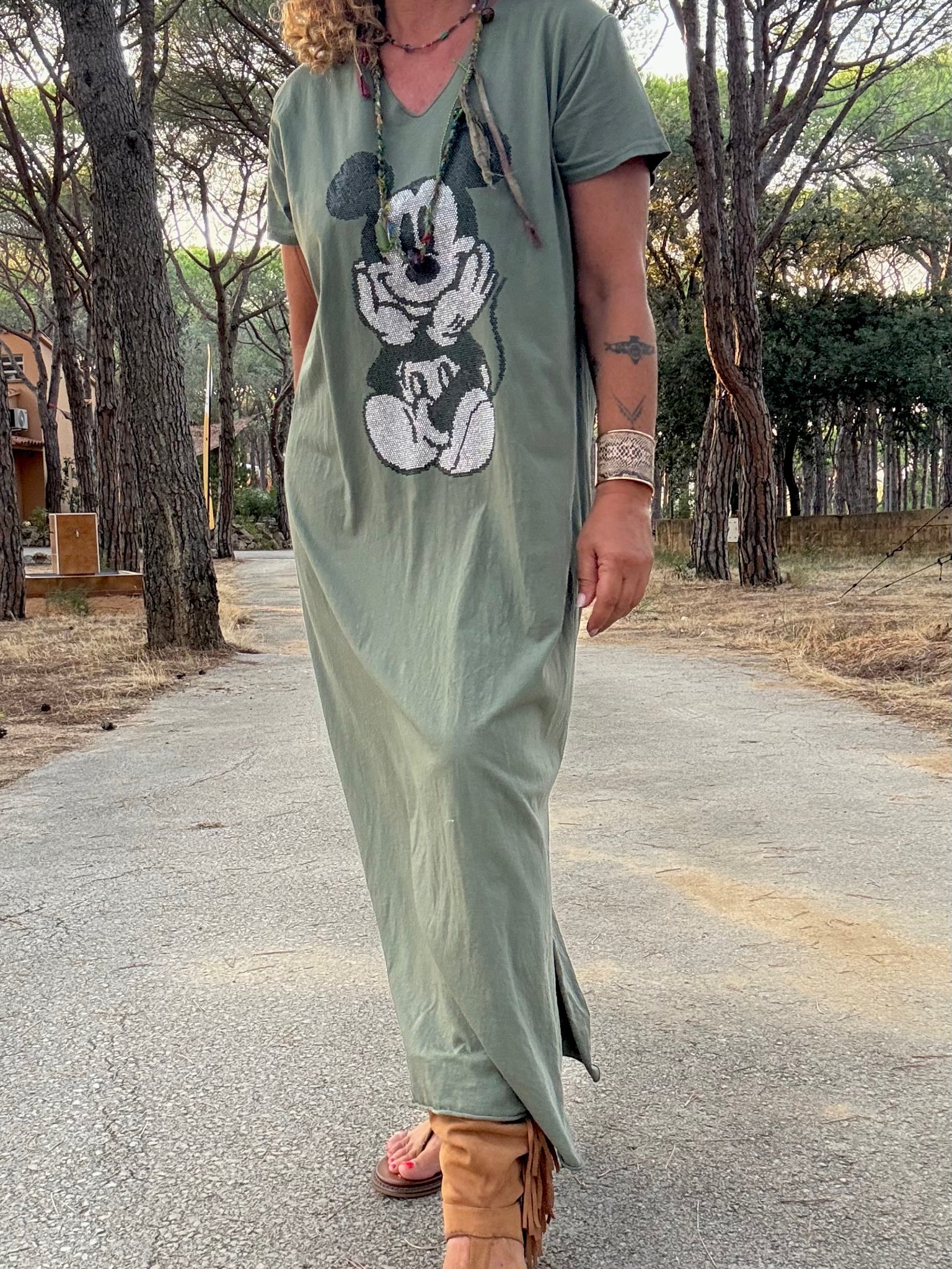 Vestido de algodón largo con cortes laterales y cuello pico y logo de Mouse en strass, vestidos perfectos! Varios colores talla única válido hasta talla 42, aunque son muy flexibles por ser de algodón puro!