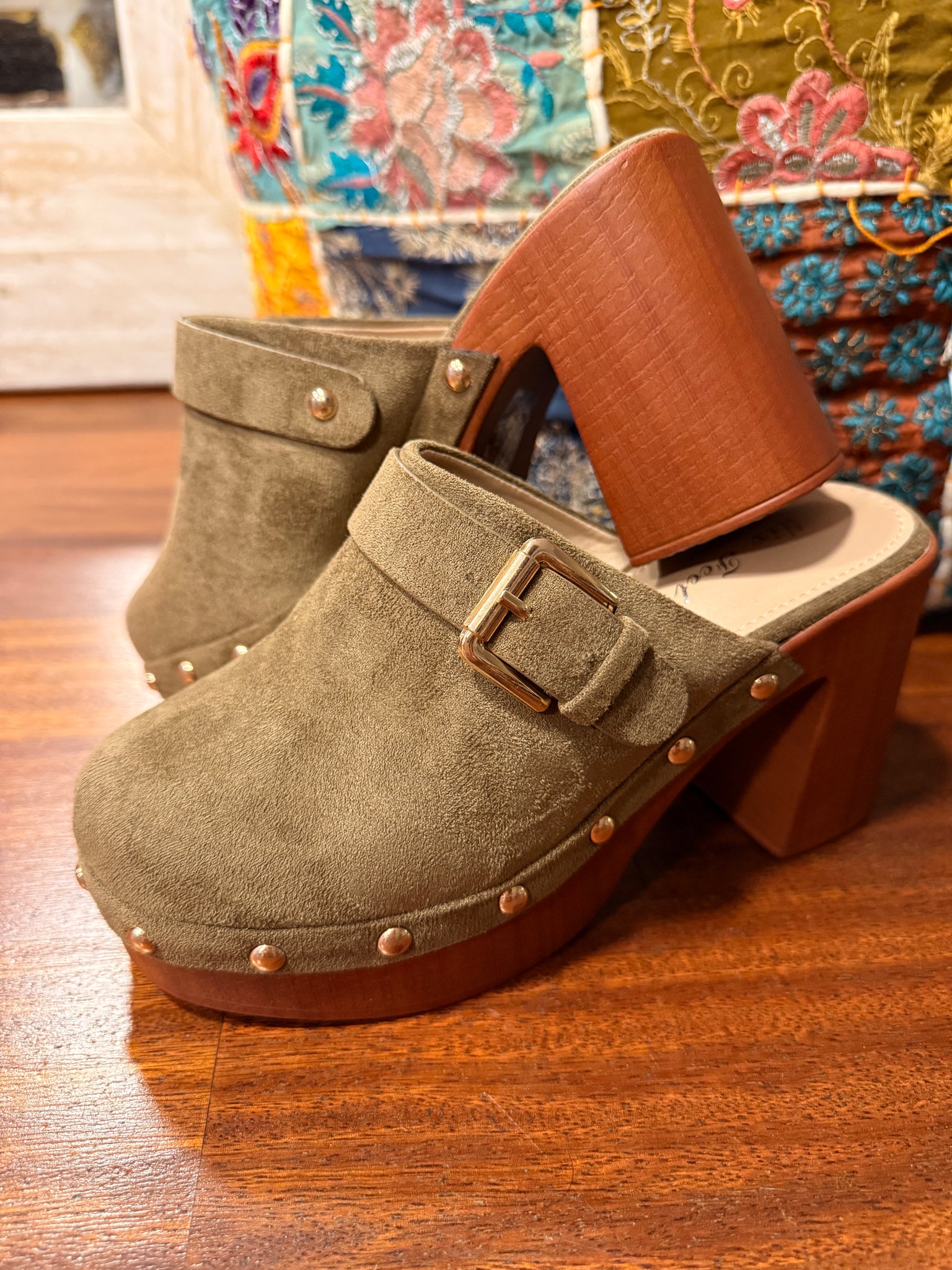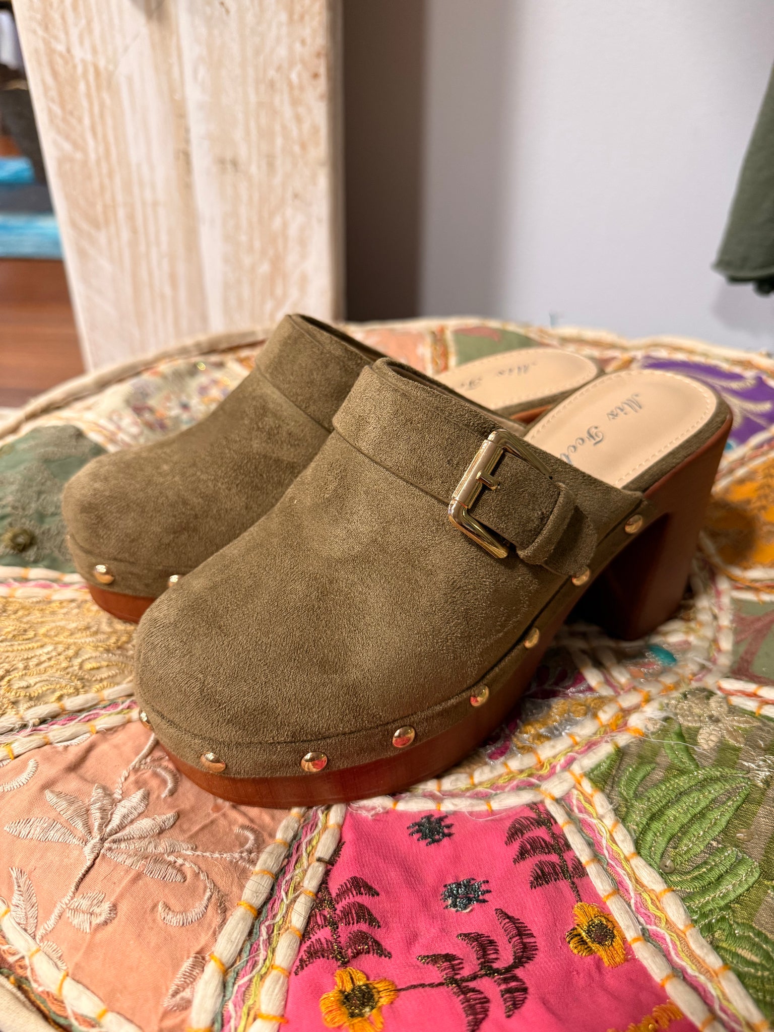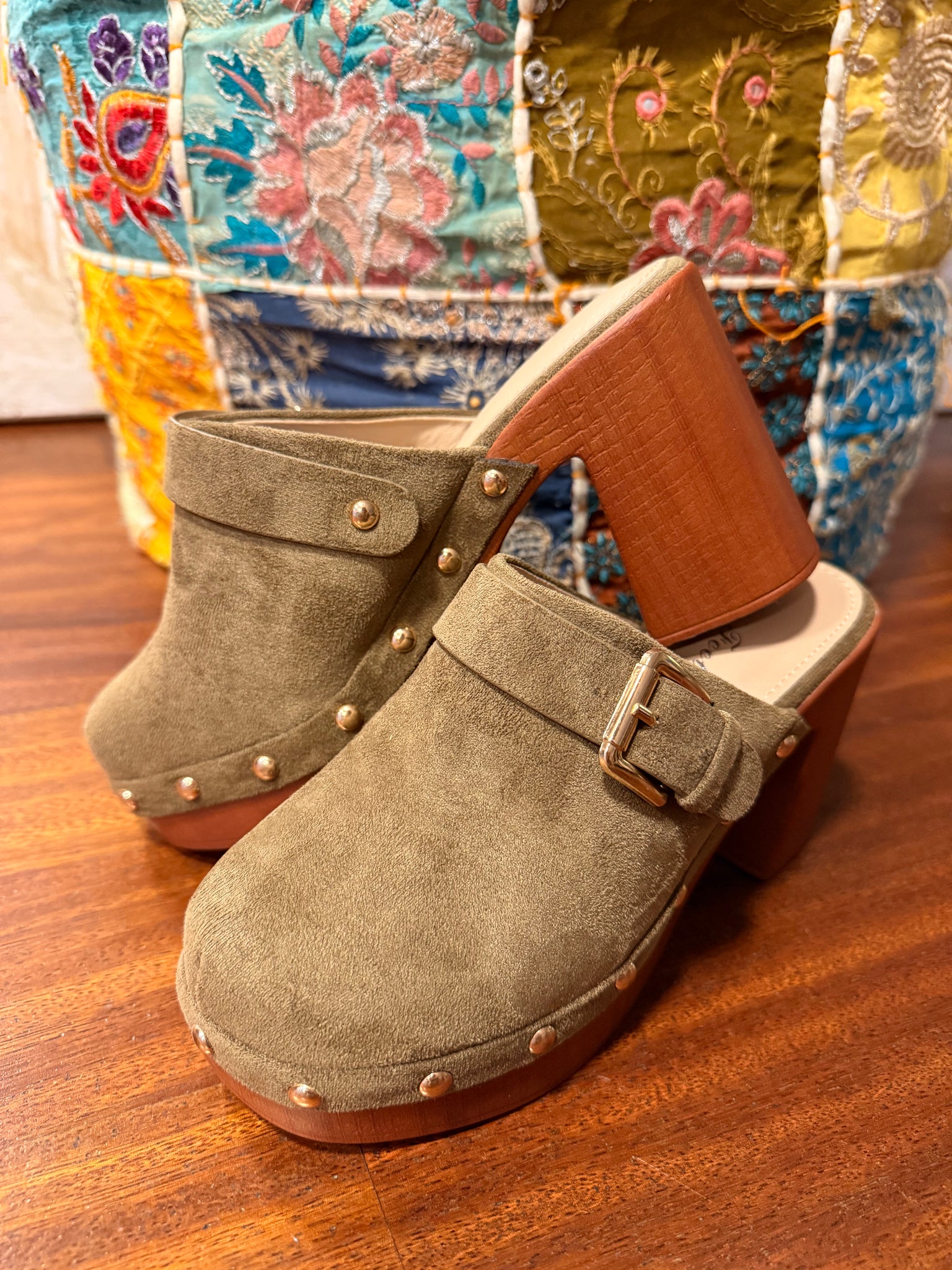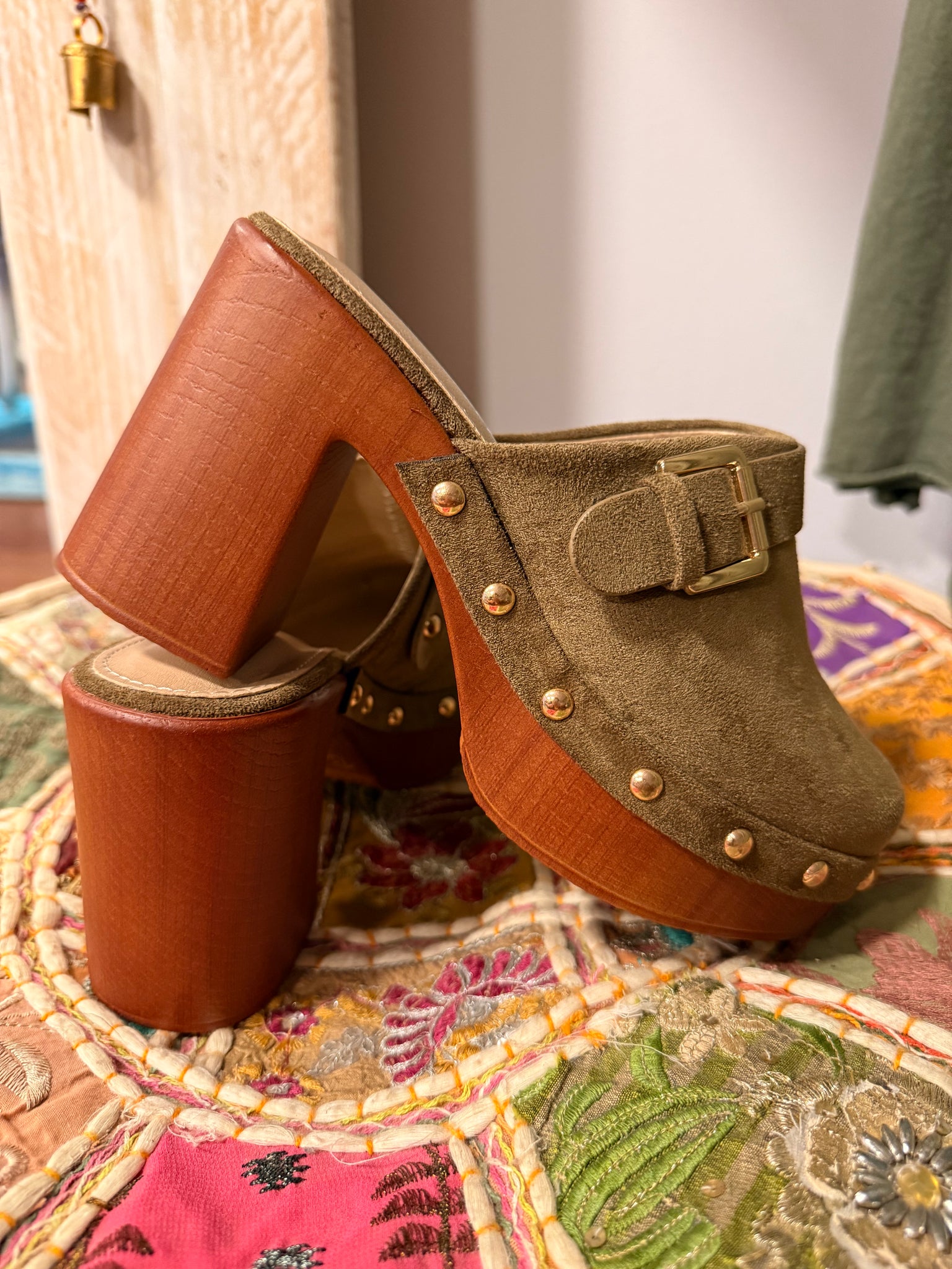 Zuecos de Antelina en color kaki con un tacón ancho muy cómodo de llevar , un zueco muy estiloso que es un clásico y que estiliza mucho y van perfectos sobre todo para pantalones de campana o para ancha! Siempre un estilo Muy boho chic! Calzan grandes tienes que coger un número menos del tuyo .